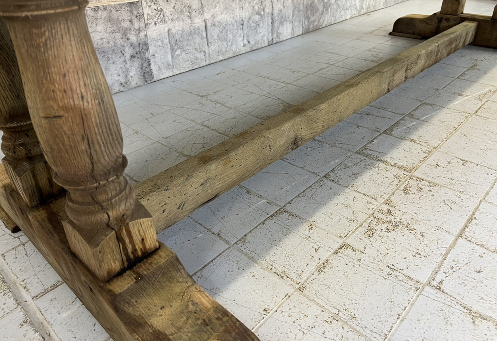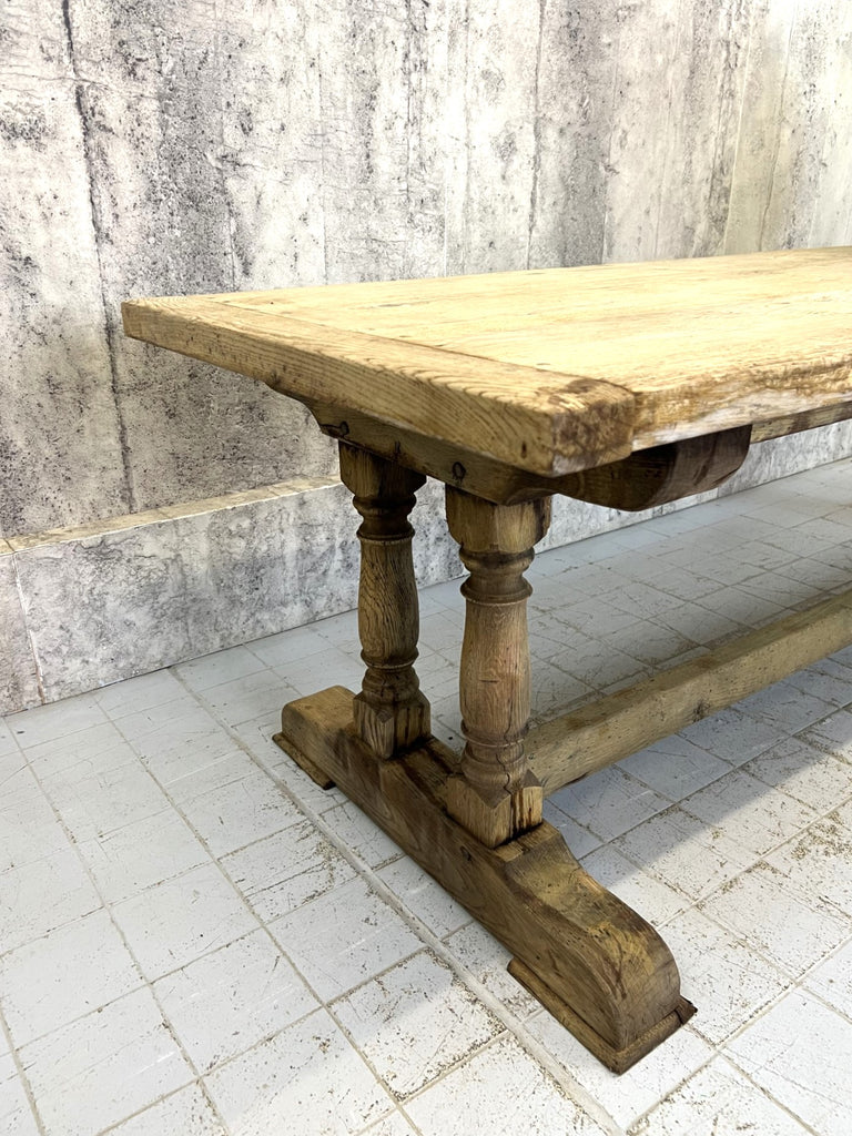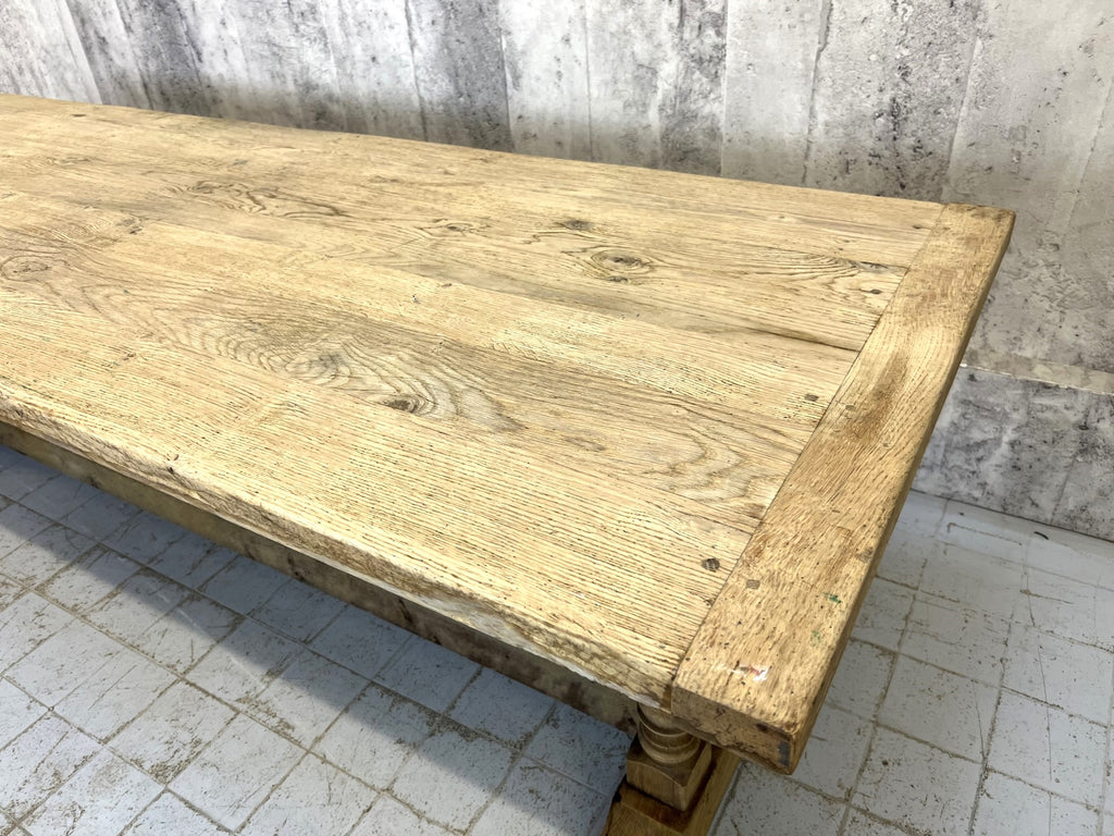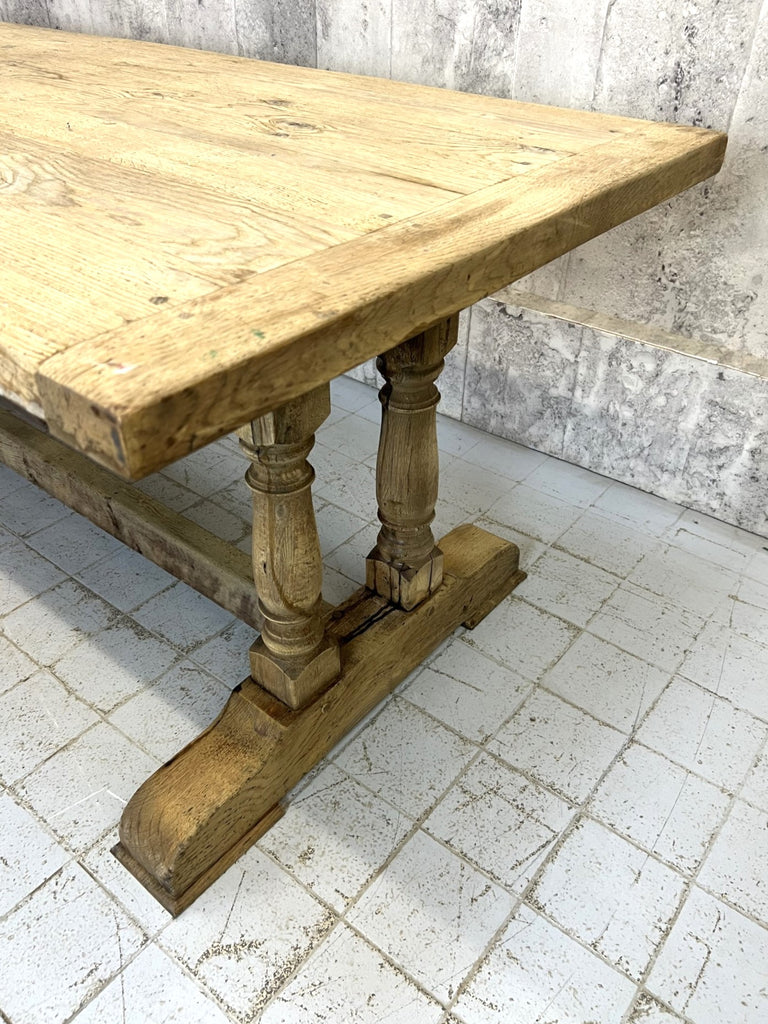 An incredible solid oak dining table, with the most beautiful and unusual legs. Solid, heavy, but with marks of its previous life. Can seat 10 easily.. maybe more with a bench. Ready to use as it is.