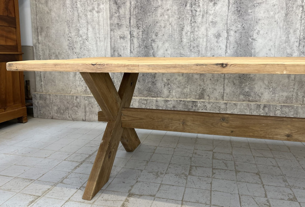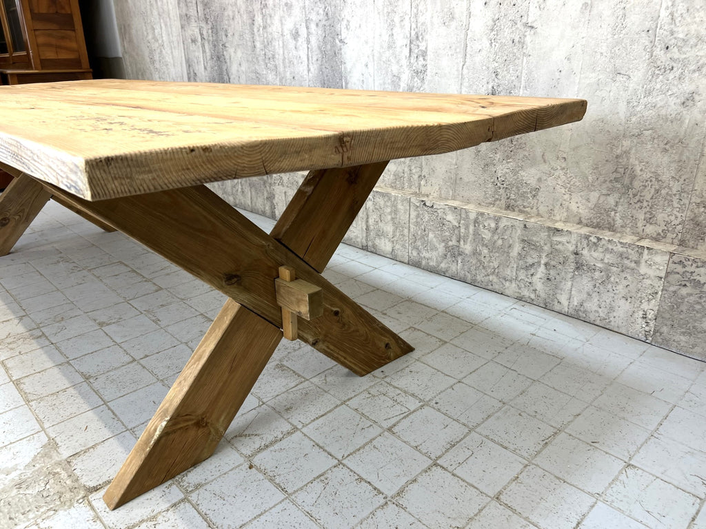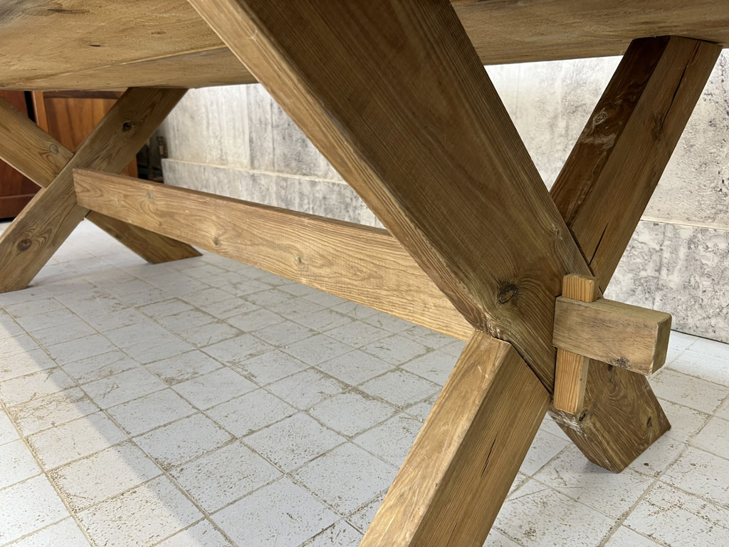 A fabulous dining table with an X frame leg construction made from solid pine. The table has had varnishes removed over time leaving this fabulous natural wood finish. The table will sit 12 easily, more if you use a bench. A fabulous and unique table.. marry with vintage, modern or coloured chairs. Unusually the top is not connected to the base so it is a suitable solution for a house that has limited access. The table is rustic, it has a bend in the table top and in places is uneven to touch, but all that add to the character rather than detract. This is not for the person who wants a pristine table, it is rustic and will be suitable for high volume, rough use!