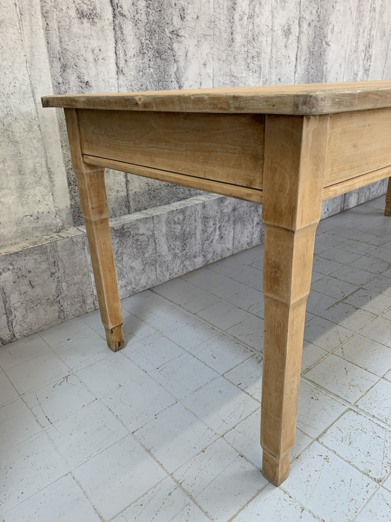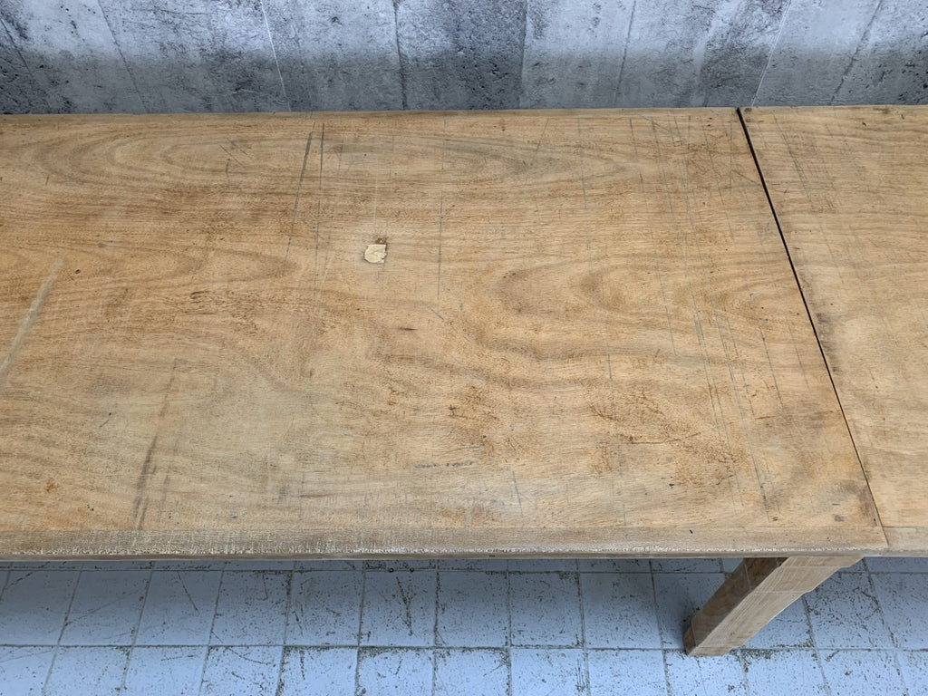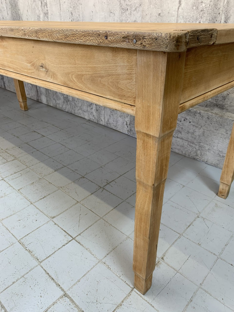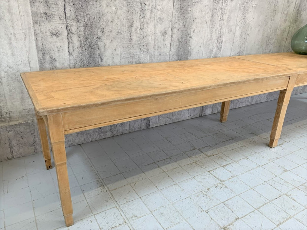 An incredible table.. whichever way you look at it. 4m long, this table has quite unique angular legs which are in wonderful condition and solid. The table top and legs has been rubbed down to remove the original varnish, exposing the original pine. In great condition, you can see that the table has the markings from its historic use as a work bench. A few holes where machinery was secured to the table top, and scrapes and marks. All in keeping with its use and age. The table top is made from two sections of wood.