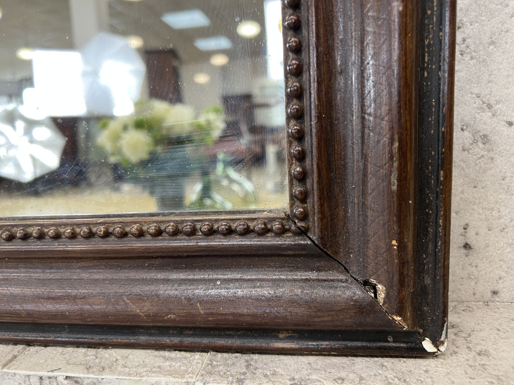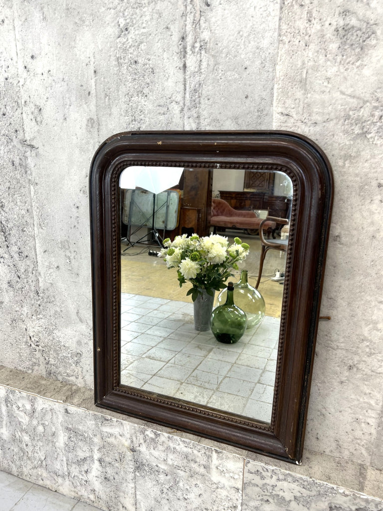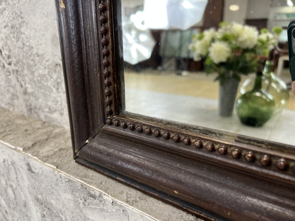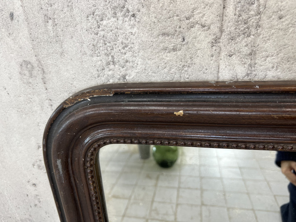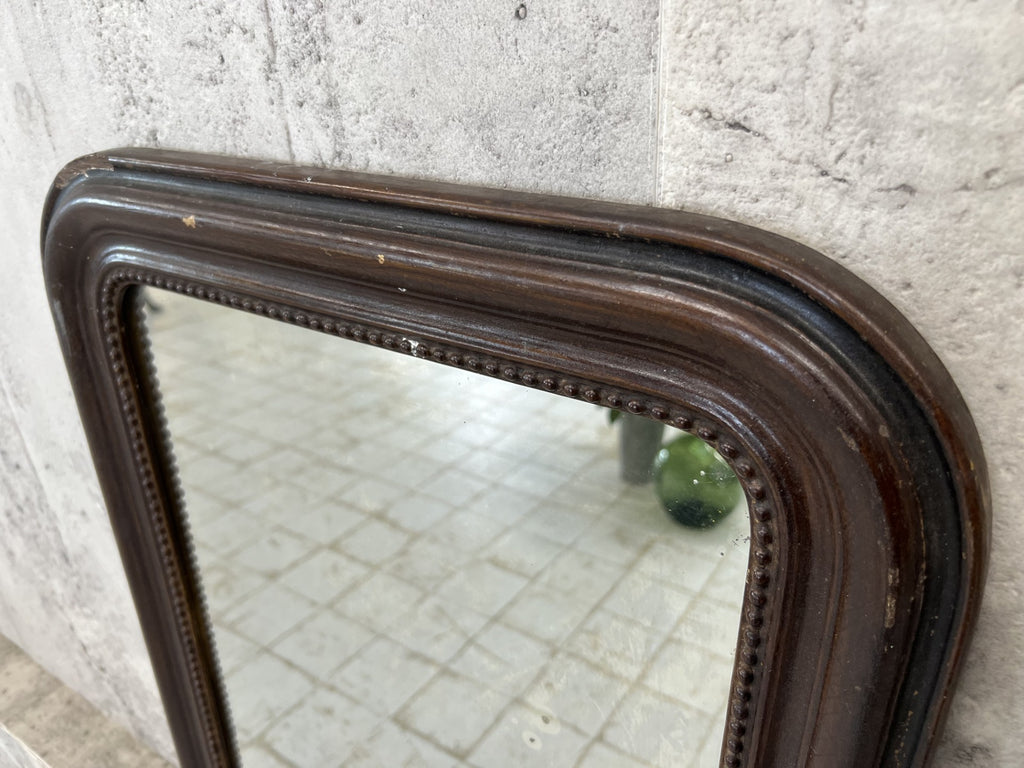 My hands down favorite place for these small Louis Philippe mirrors is in a modern bathroom.. also perfect for a hallway, dressing table, a very versatile mirror.. This example has had a lot of damage to the frame that to us adds character and interest. If you want perfect, this is not the mirror for you. To me too the brown paint effect gives the frame the impression of being a leather finish. But that is my impression. This may not be the same for you. The mirror itself is original with foxing as you would expect.