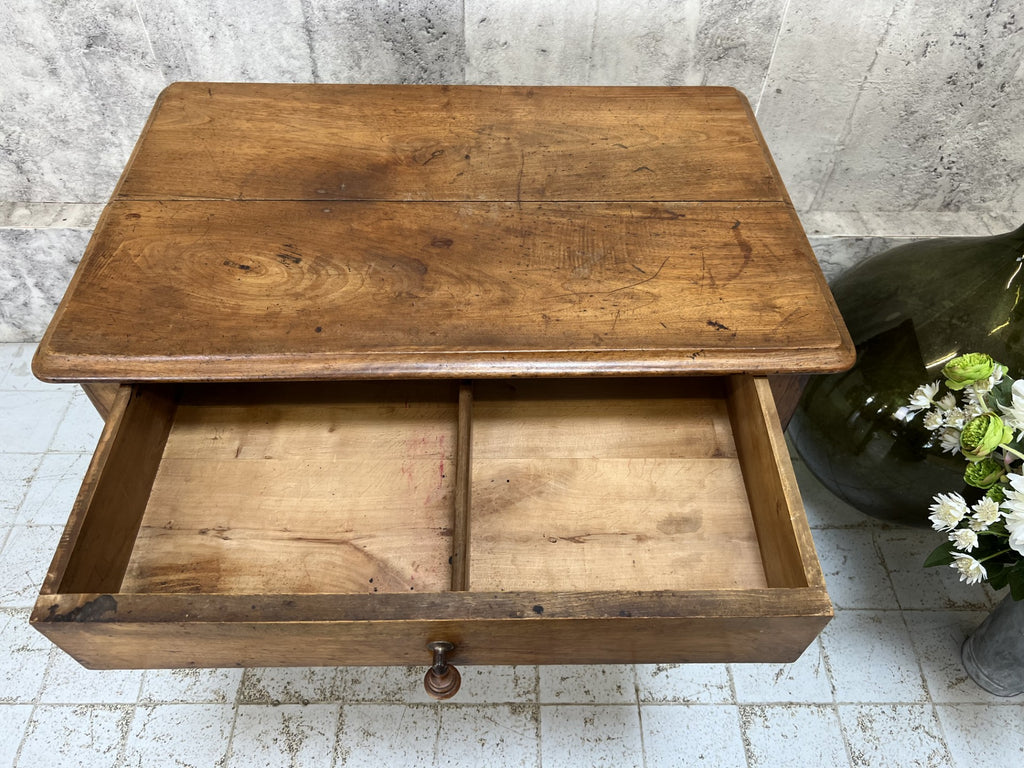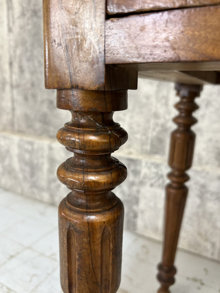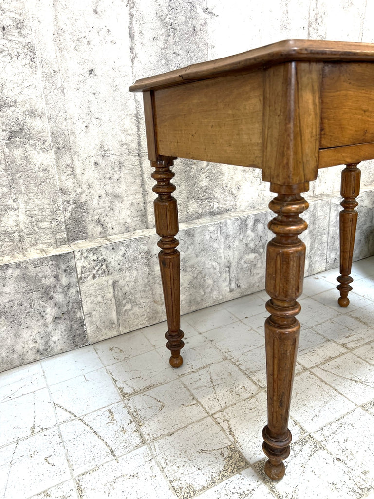 When imperfect is your perfect. The table is a classic, turned leg table that has been made as either a writing desk or an occasional table. The leg has an ancient break that has been fixed, please see the photographs. The fix is sound and strong and isn't obvious unless you are looking for it. A useful drawer and a lovely delicate table that can be used in a kitchen, in a home working space, in a child's bedroom. A pretty solid table, ready to use as it is.