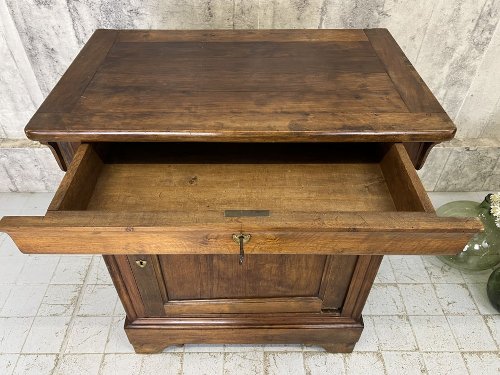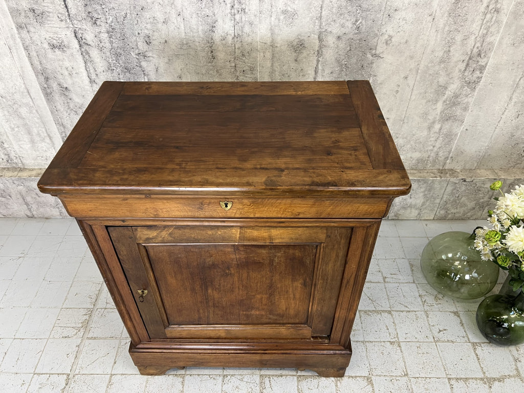 This is a fabulous solid walnut wood cupboard with a drawer and a single door opening onto a shelf. The cupboard has been used to store electronic equipment before now as there is a hole in the back to allow leads to be pulled through to a plug. This could be converted too as a sink stand if the height is correct for you or as general, pretty storage in any room in the house frankly.