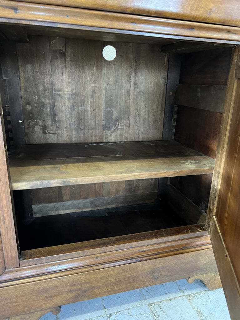 The wood is walnut wood.. beautiful, rich and warm, with the most lovely patina. There are beautiful brass shield shaped protector and the original key. With bumps and bruises commensurate with age and use, this pretty little cupboard is a real gem.