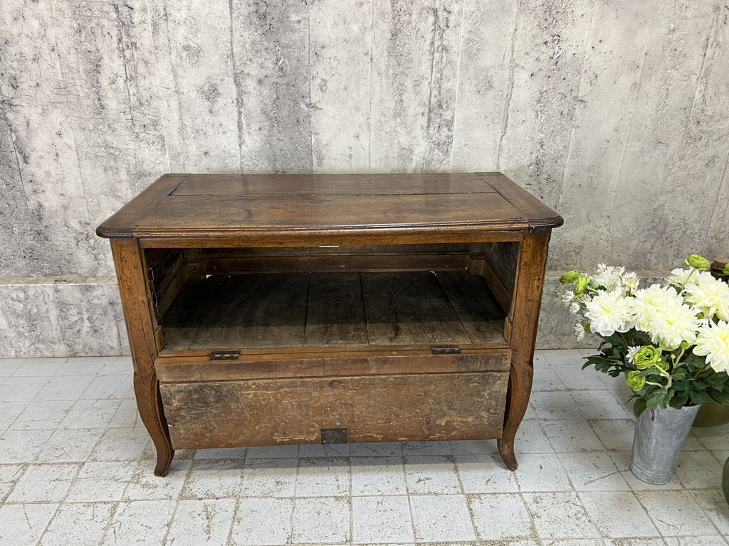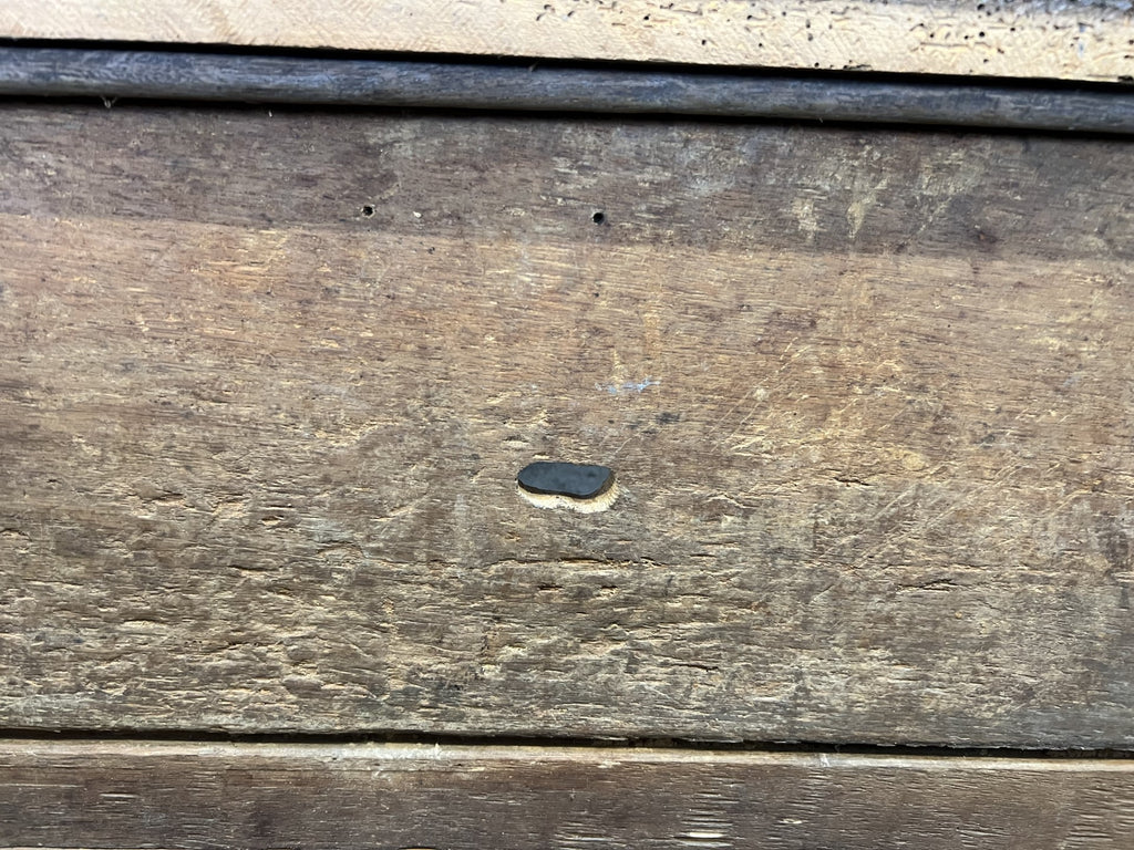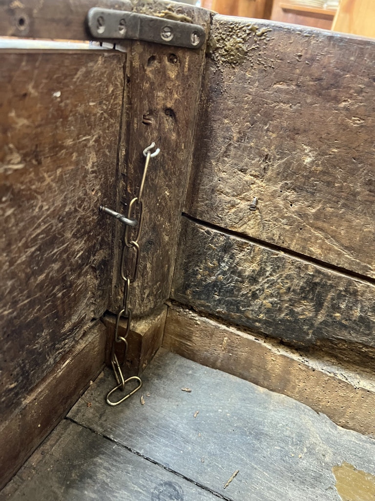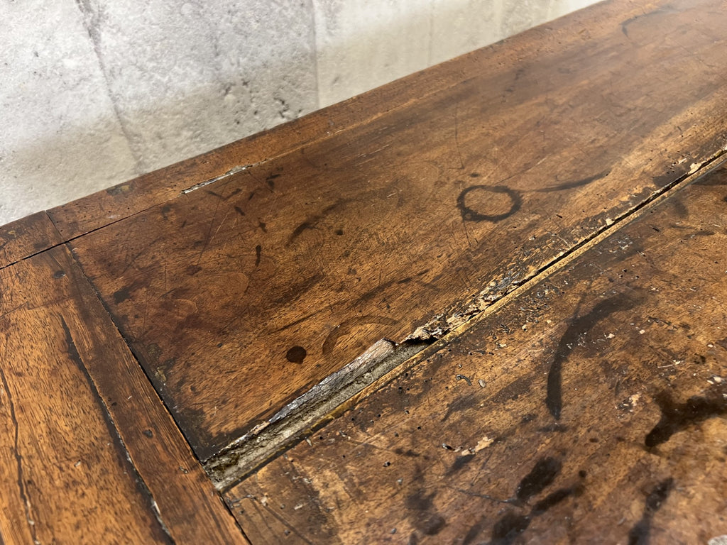 A fabulous, absolutely unique chest that would make the most perfect Storage for electronic devises, as it has been used in the past. The piece is made up, I believe, from lots of old parts and has evidence of old wood worm, breakages and fixings, breakages that have been left to wear over the years. This is a charming piece, probably because of the story of time marked all over it. The patina is beautiful and the table is solid, heavy and in ready to use condition if imperfect is your perfect. A unique and fabulous piece, ready to use in a modern or antique scheme.
