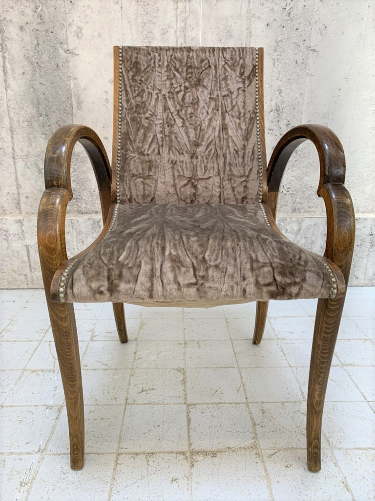 A really fabulous and unique Art Deco bridge chair with these simply stunning 'Cloud' Style arm rests.  The wooden frame is structurally sound, the fabric original crusted velvet.  Sadly there is a split in the fabric on the reverse, which you can see from the photograph, but the condition otherwise is very good.  This chair could be reupholstered to suit your style.