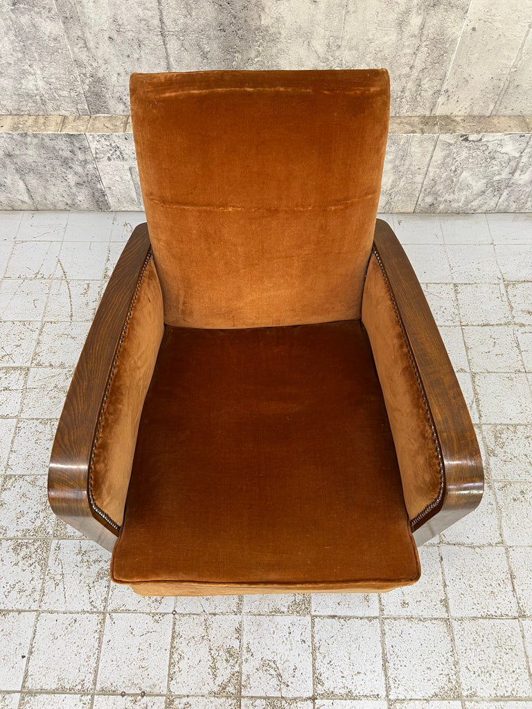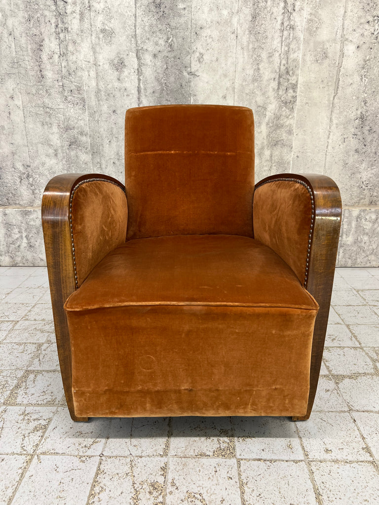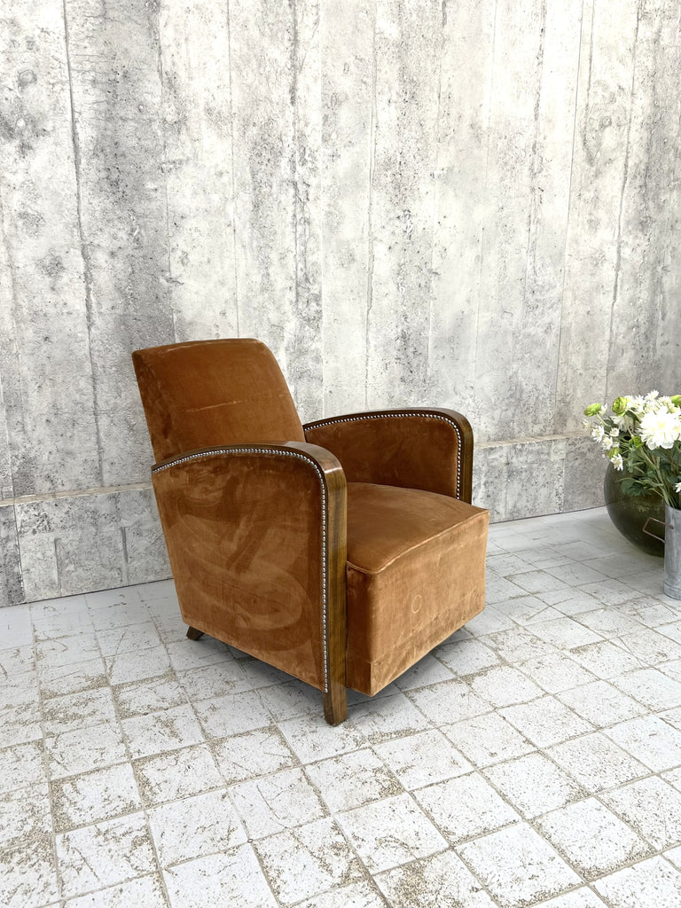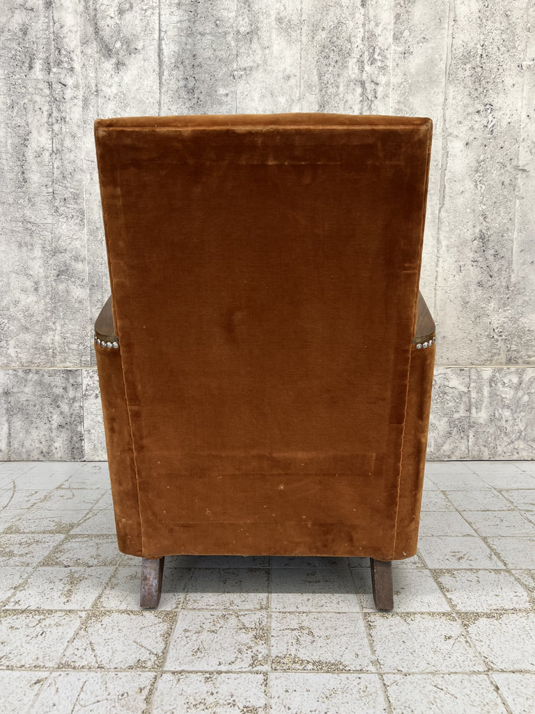 I absolutely love this chair and everything about it. The shape is a classic lounge chair style, the cotton velvet, in really good condition is this beautiful burnt orange colour.. it is soft and muted in colour and is almost a neutral. The seat is very soft and springy, the condition is overall great.. as you would expect there are bumps, scrapes and signs of wear commensurate with age and use. A fabulous find. Ready to use as it is.
