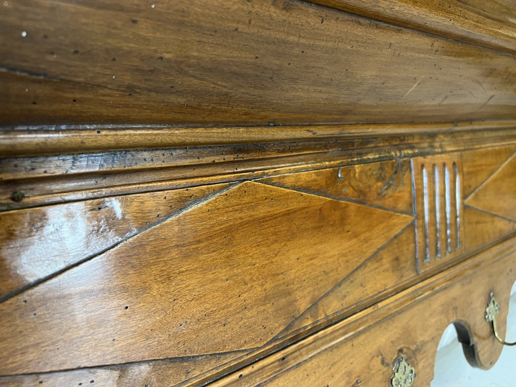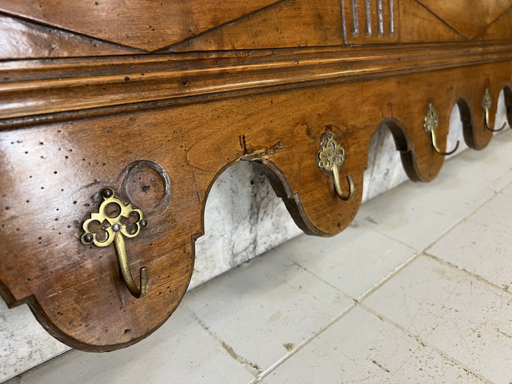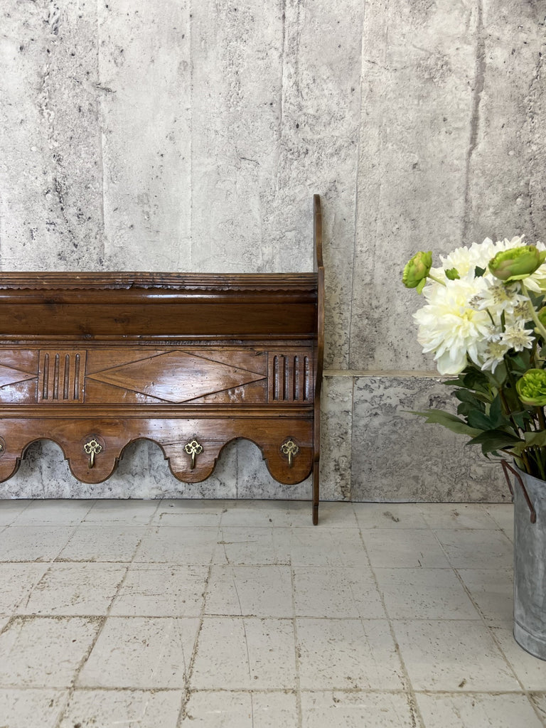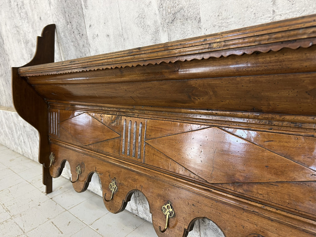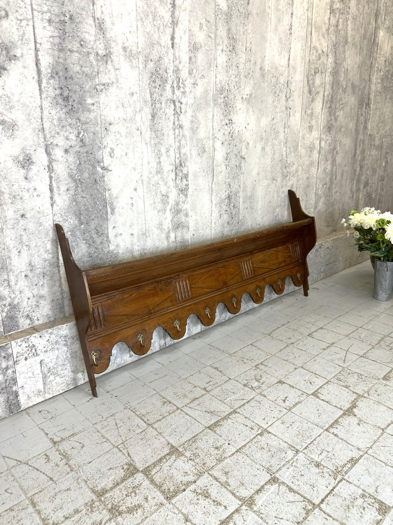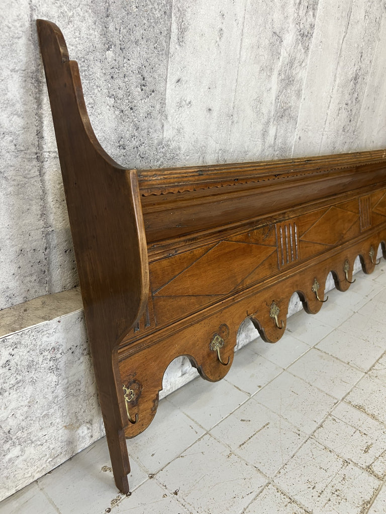 A fabulous coat rack with a carved back board with 8 brass hooks and a shelf for additional storage above.  There are grooves in the shelf that I imagine would be suitable for propping up plates or pictures securely.