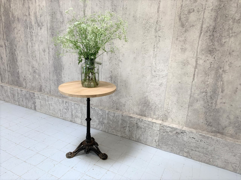 Traditional cast iron base painted black pedestal base with splayed feet married with a modern solid oak table top.  A stunning example of the traditional French bistro table modernised.  In excellent condition.  Ready to use in a residential setting as a bedside table, a side table or in a bistro or bar.  Solid and in wonderful condition.