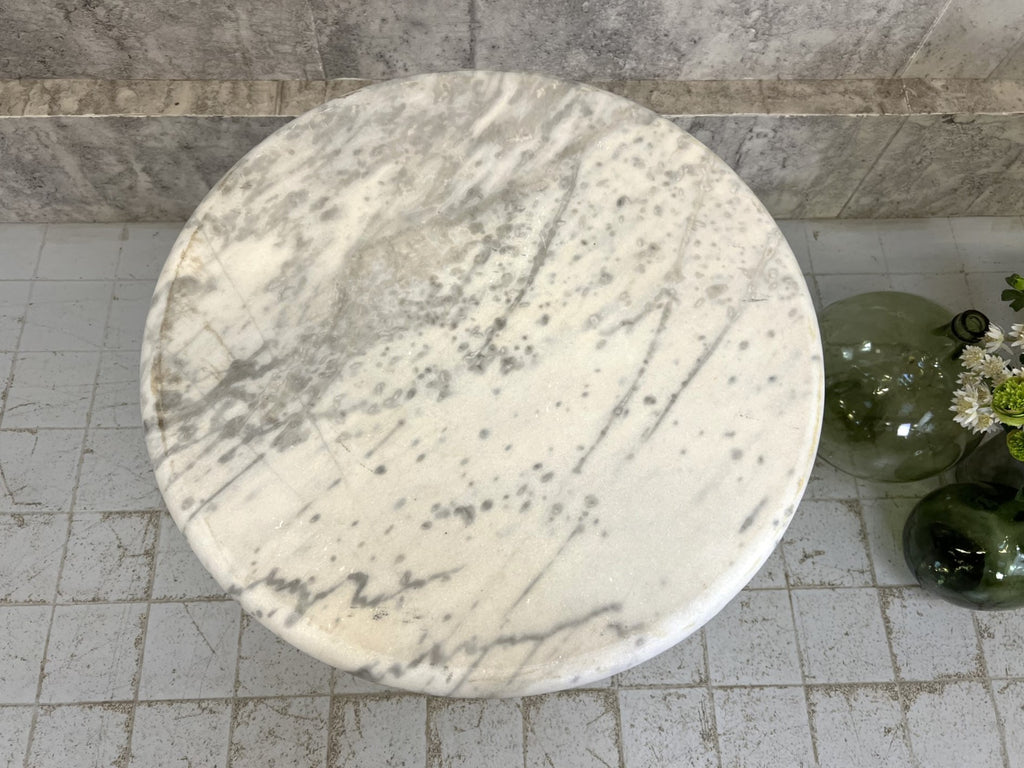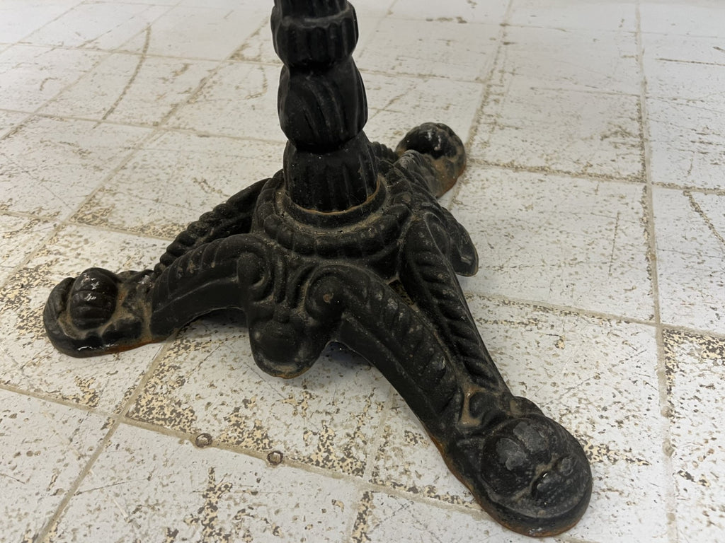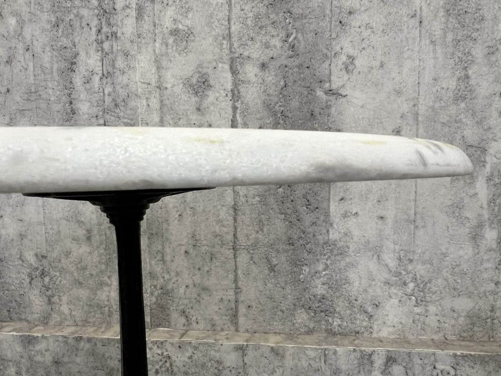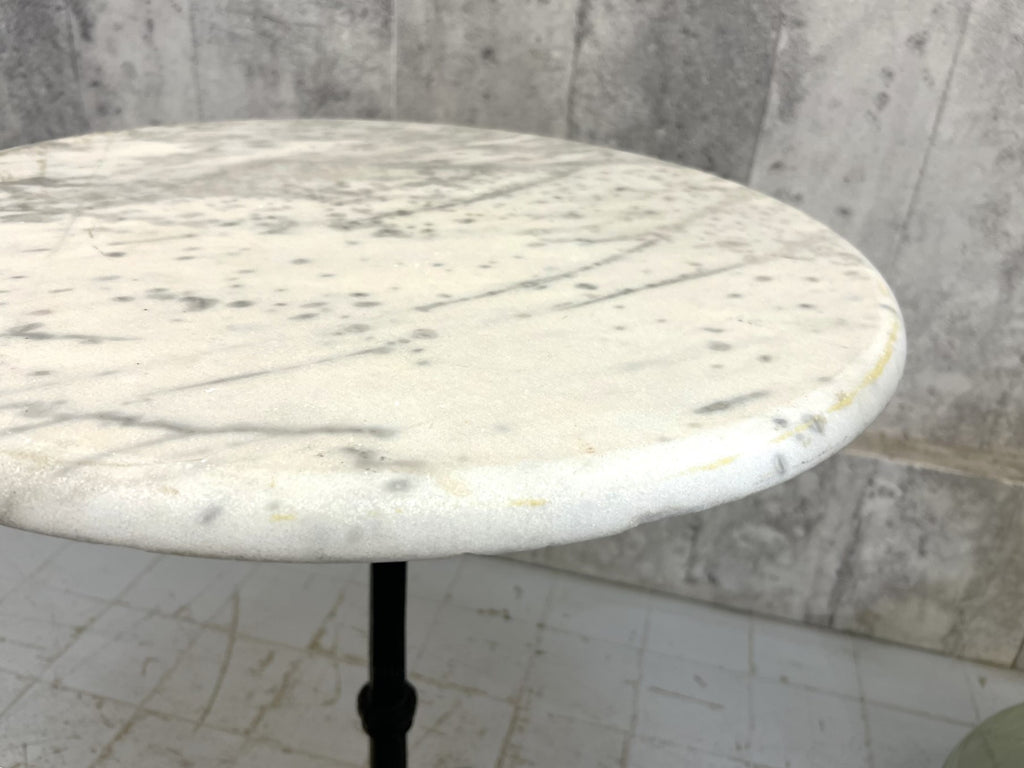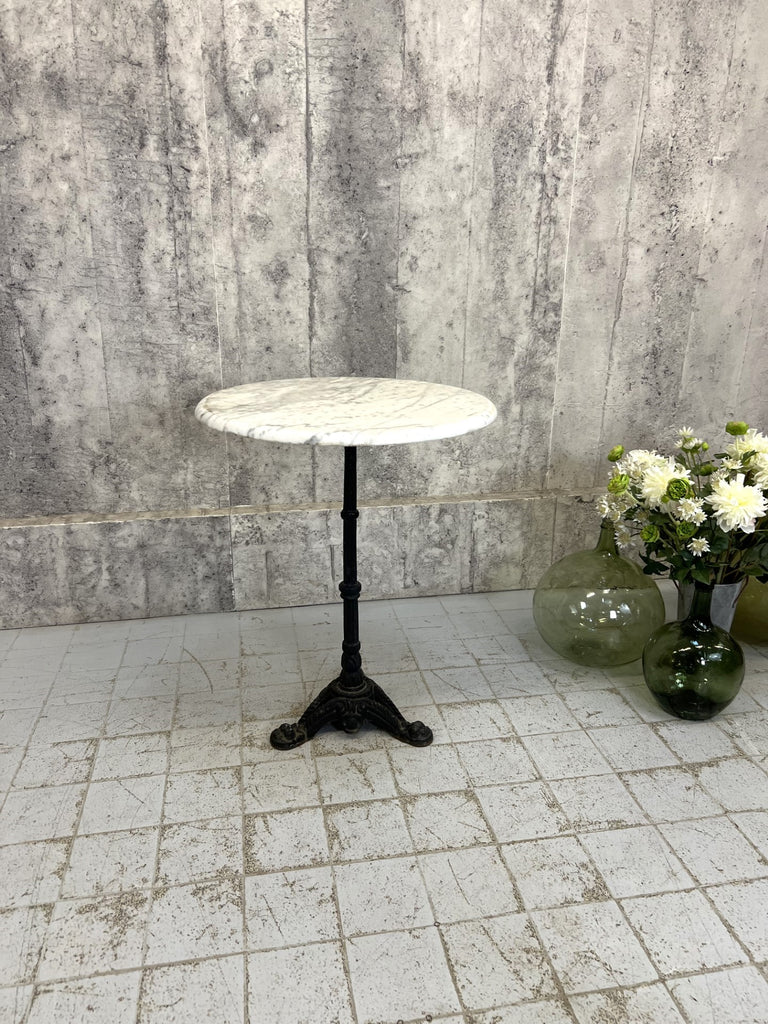 Traditional cast iron base painted black pedestal base with splayed feet, a white marble with grey veined top with rounded edges. A stunning example of the traditional french bistro table. In good overall condition, with marks and chips to the edge of the marble as you would expect with use and age. Please see the photograph for details. Ready to use in a residential setting as a bedside table, a side table or in a bistro or bar. Solid and in wonderful condition.