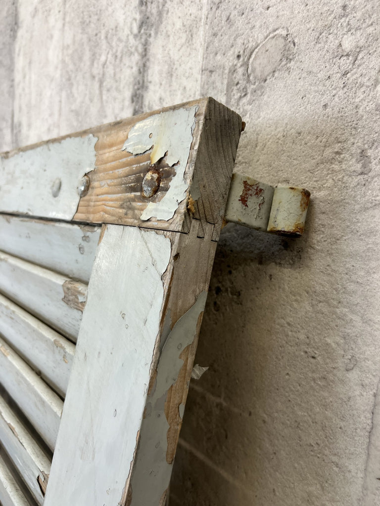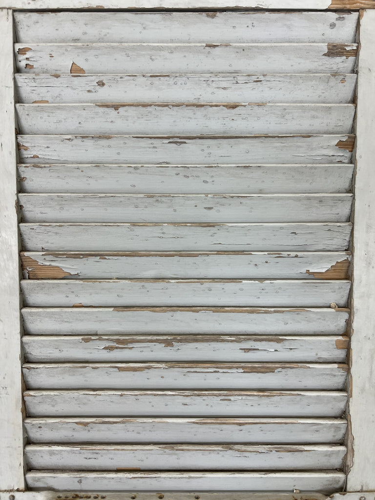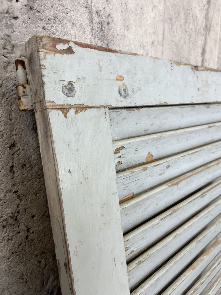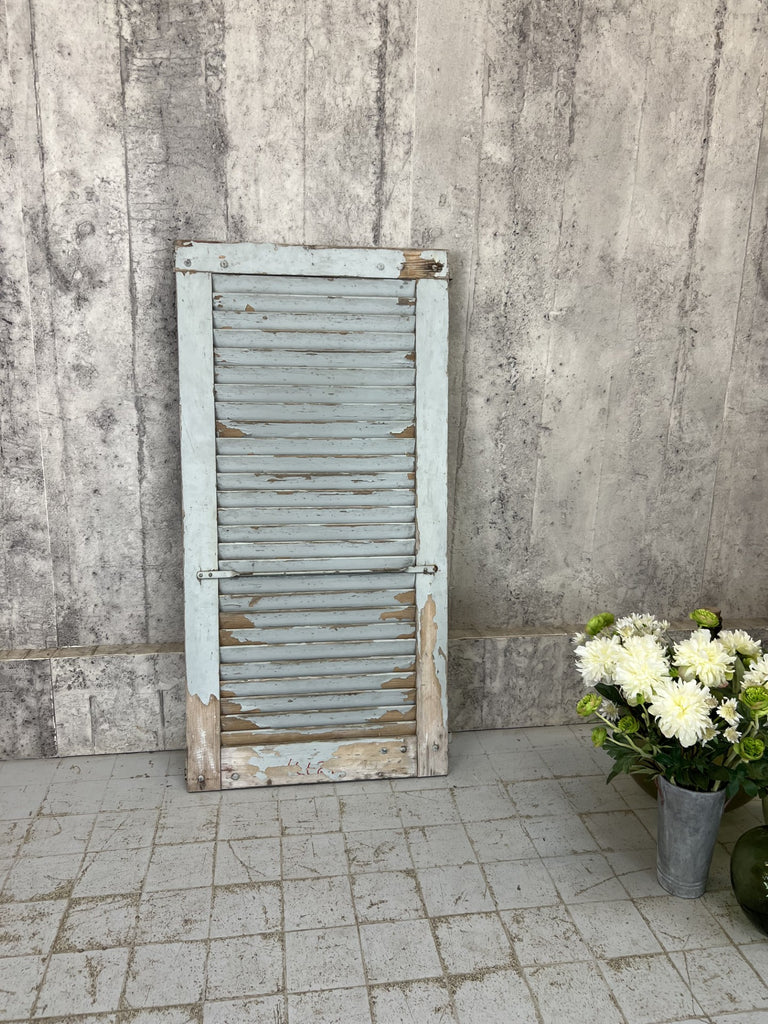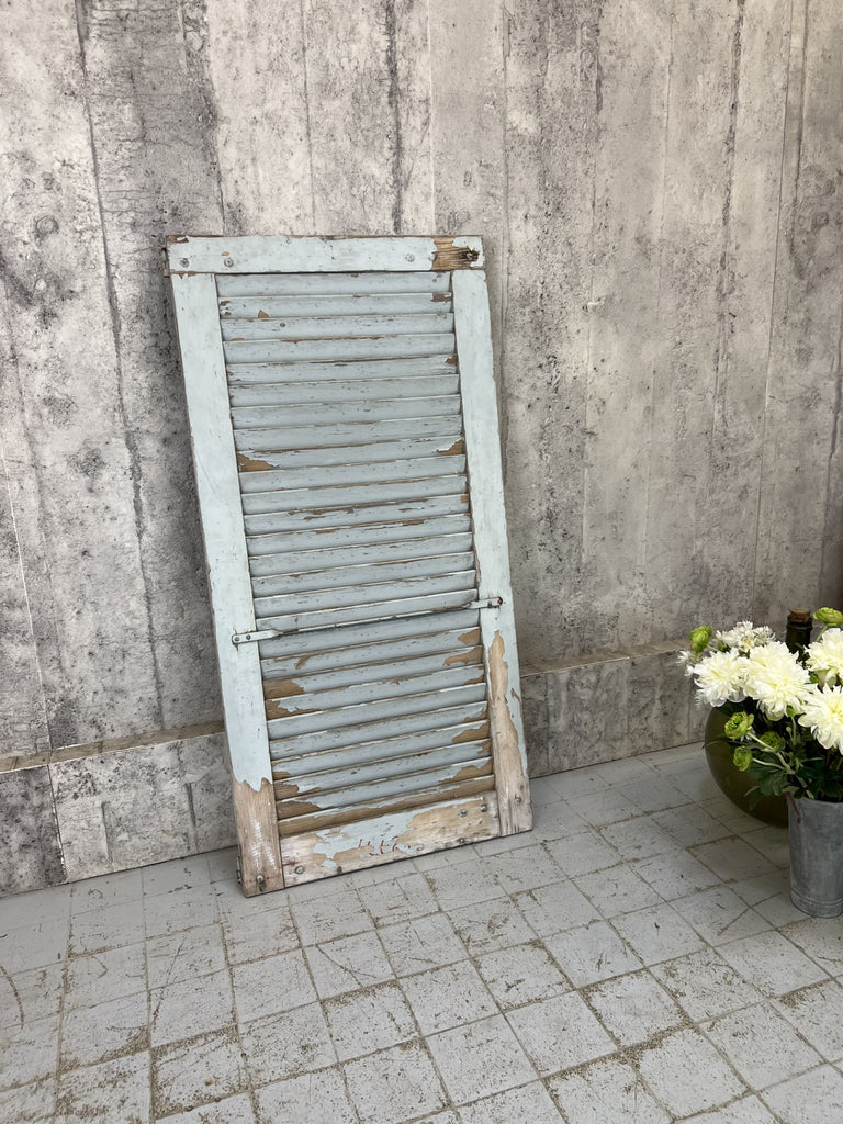 A shabby chic style duck egg blue original French shutter that has the paint flaking off in parts.  The shutter is solid and in great shape and could be used as it is designed or alternatively, this can be used as a screen or as a textured backdrop.