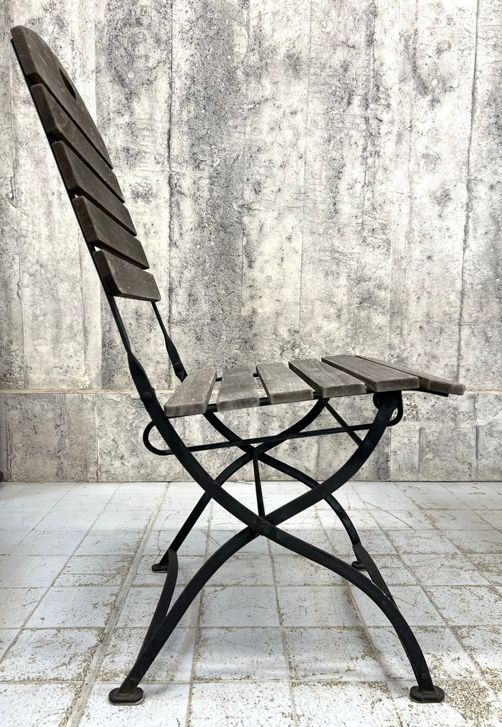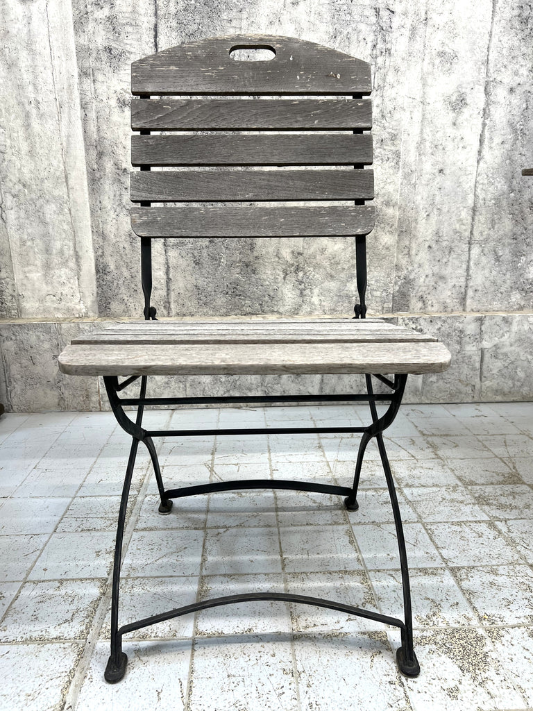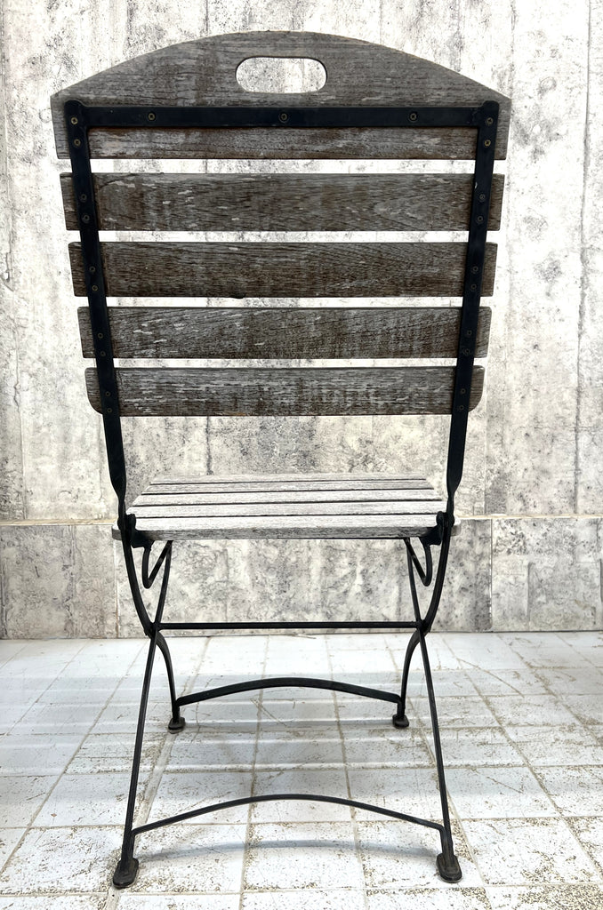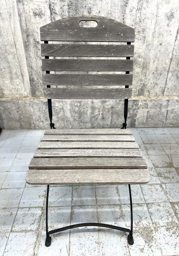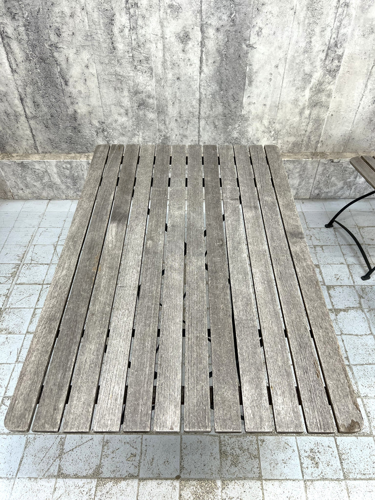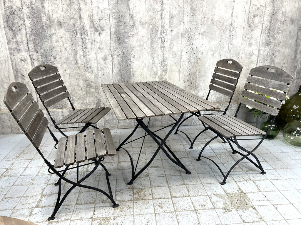 A solid and strong set of 4 folding garden chairs and rectangular table. Of no great age or use, but in the style of the traditional French bistro table and chairs. In very good condition and ready to use as they are. If left in the garden untreated, the wood has silvered beautifully. Perfect for use on a terrace, balcony or in a garden.
