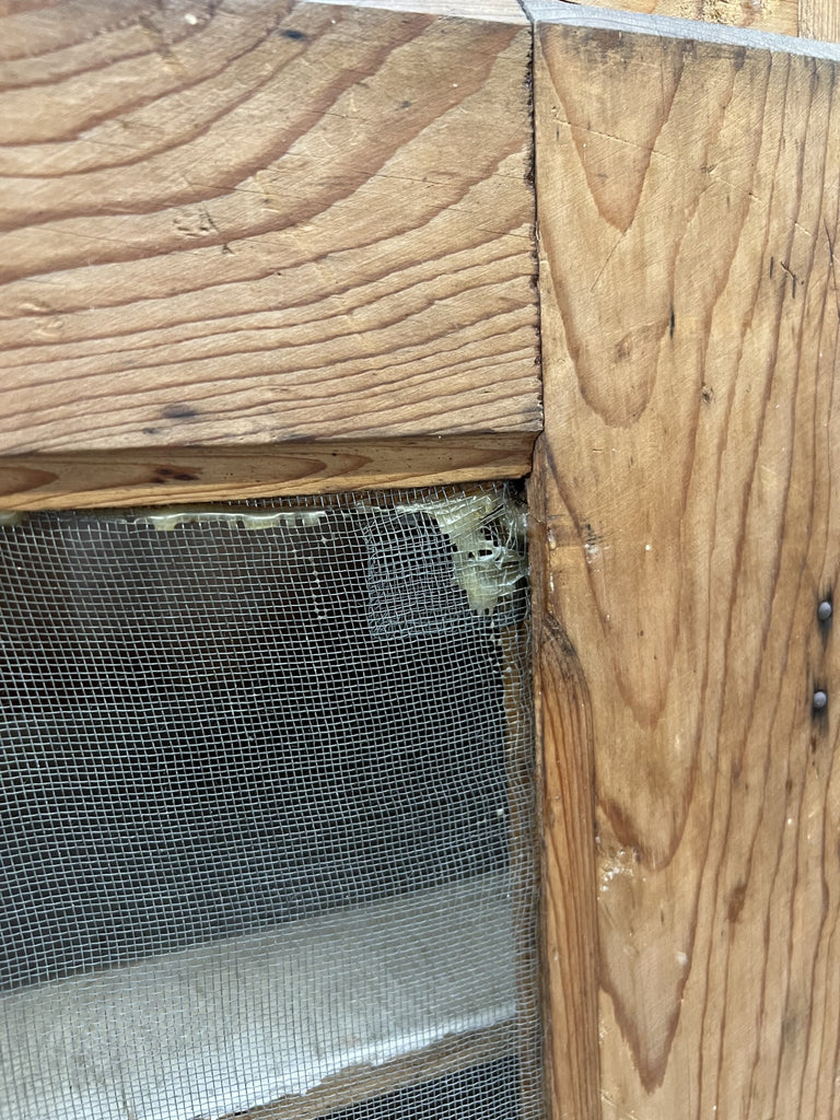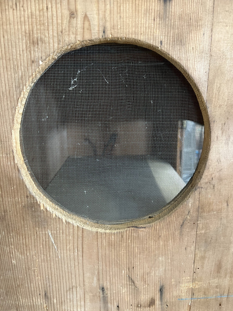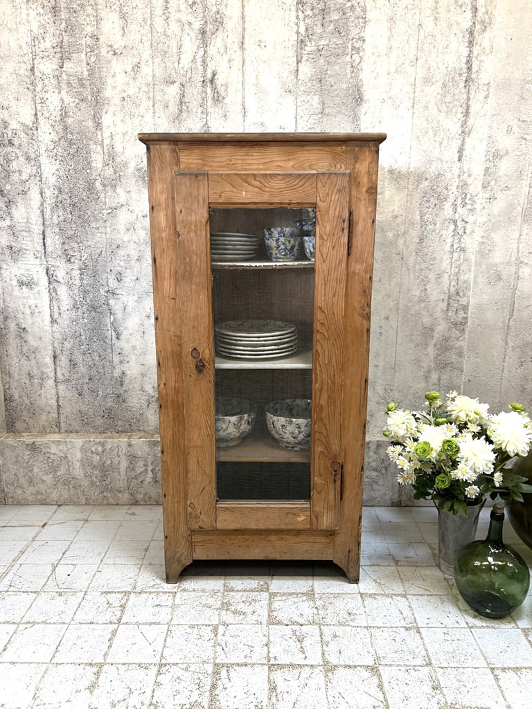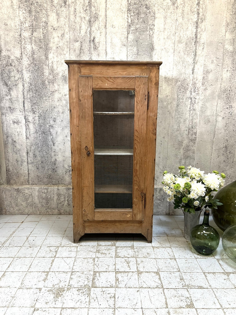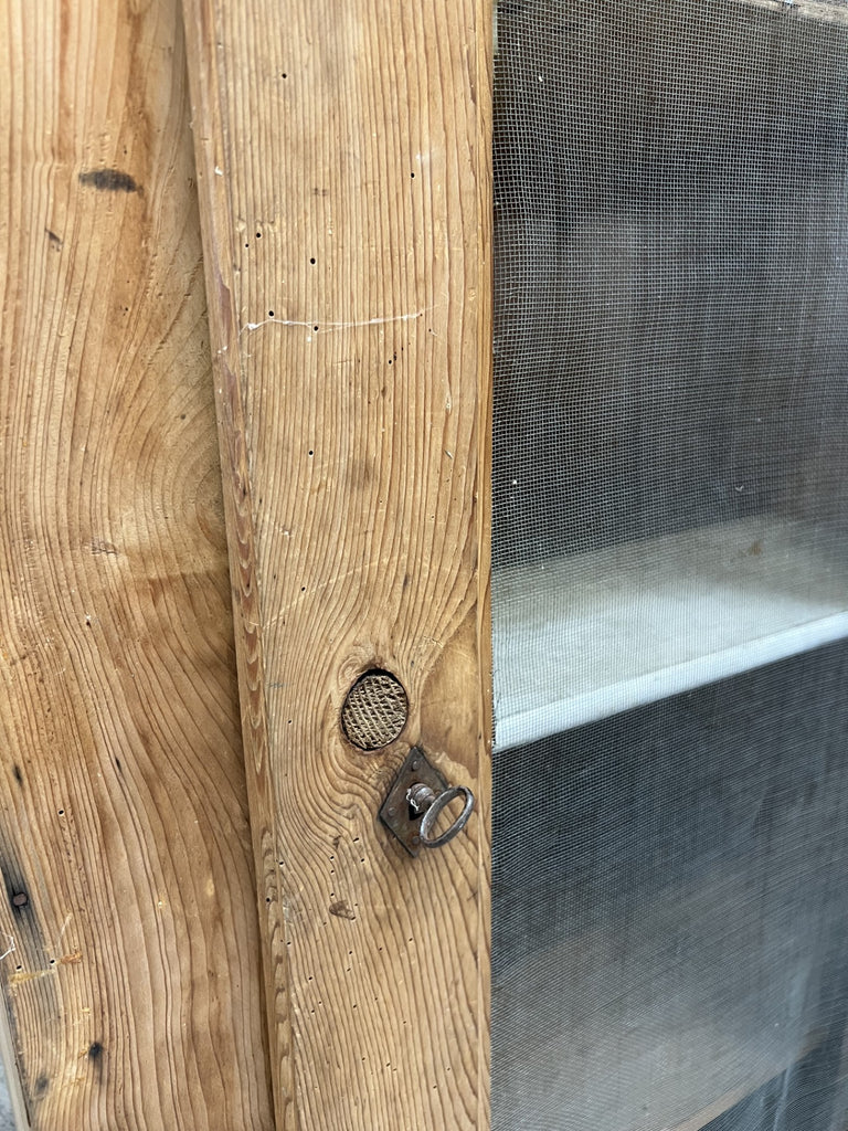 This is a classic table top 'garde a manger' or 'food keep', in the most hard to find, original condition.  Made from wooden frame and finished with mesh sides and door.  This piece would have stored food away from flies, in a cool room.  Is ideal to reuse for its original purpose, or for general characterful storage.. a friend of mine stores her glasses on the table top in her kitchen in one. it looks fantastic.  One door opens onto 4 shelves.  This garde manger is in rustic condition, wit obvious wear, tear, repairs and ancient wood worm (all old and treated to be absolutely sure anyway).  Beautifully characterful and would make a wonderful detail in a kitchen, or even a bathroom.