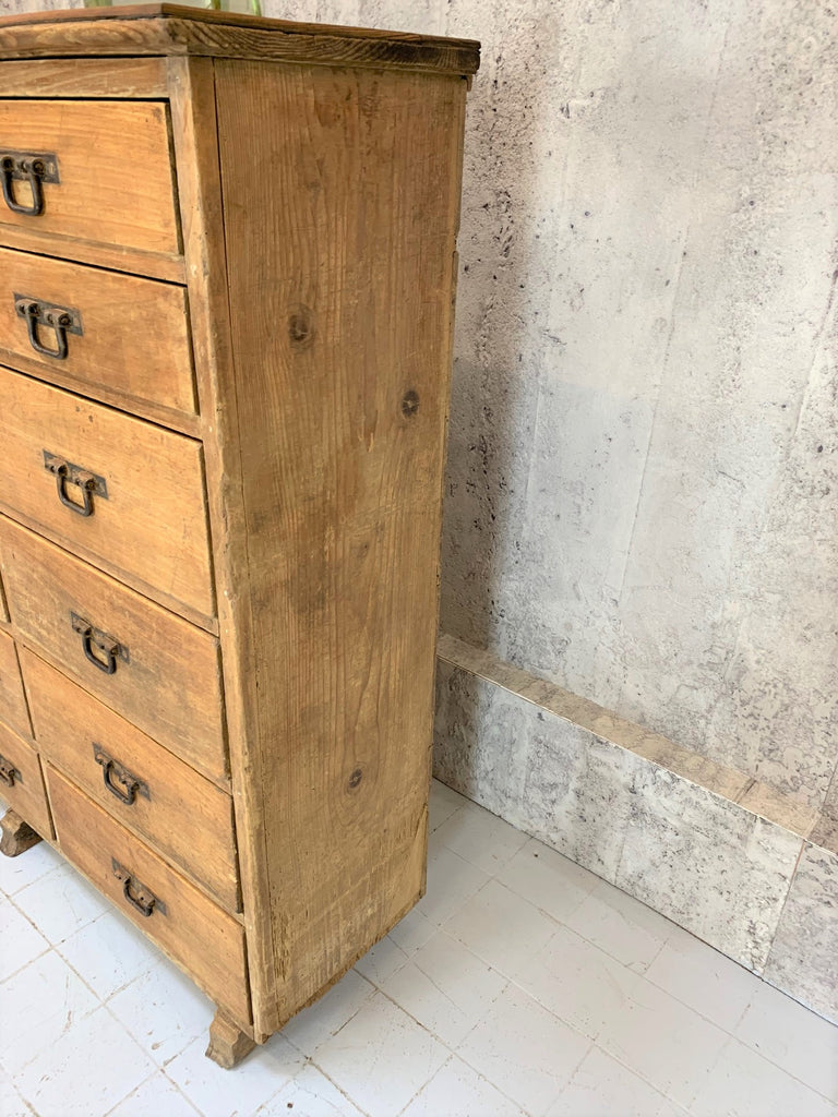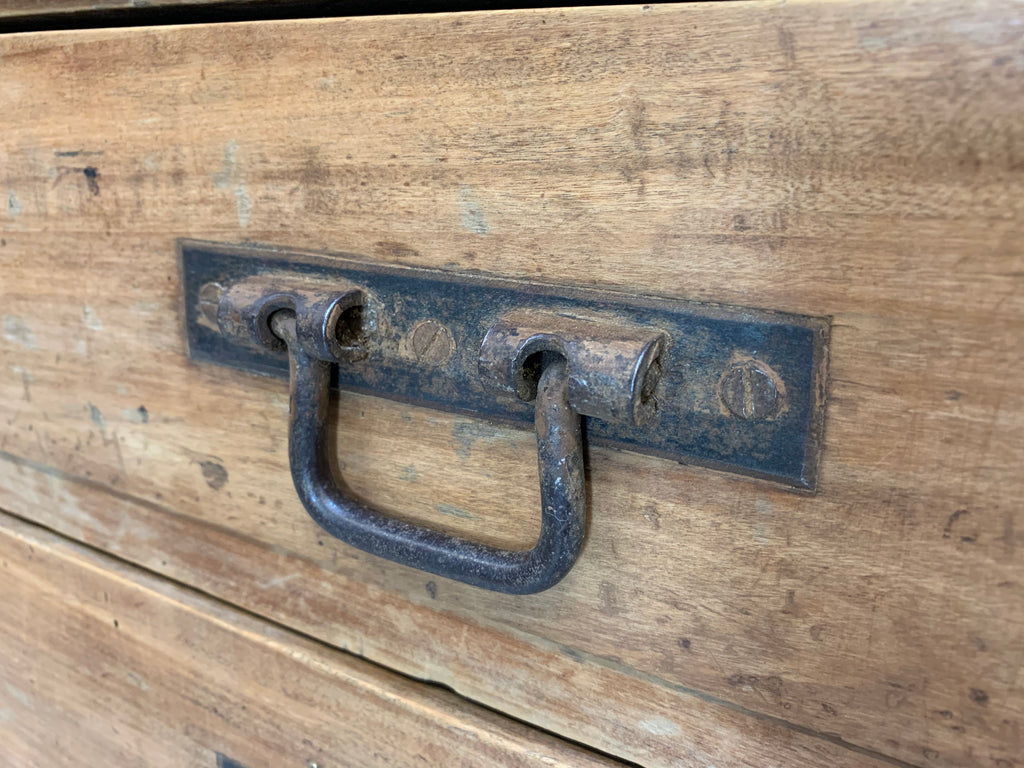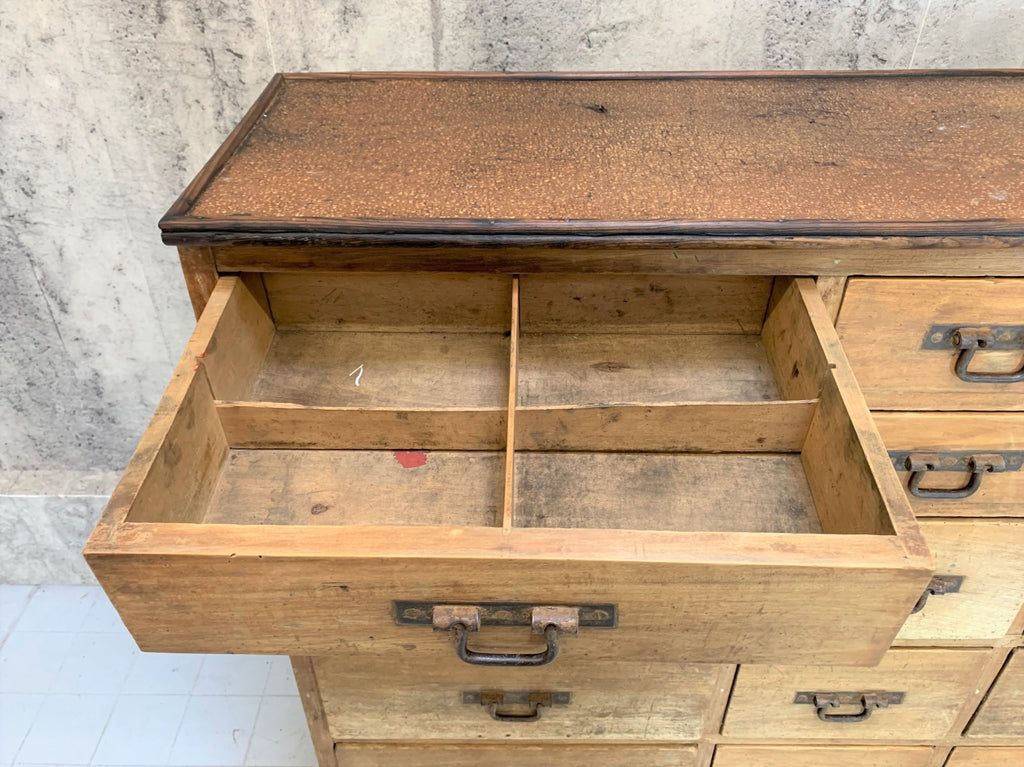 This would be a fabulous addition to may rooms. Oodles of storage within the 18 drawers of this characterful piece. Not too deep, so this doesnt take too much floor space. The drawers are all different, some are divided, some are not. The wood I believe is oak. It has a wonderful texture to it.. smooth and tactile and the original metal handles are still intact and fully working. The top has a cork like finish, and is in good condition too. The drawers all run smoothly.