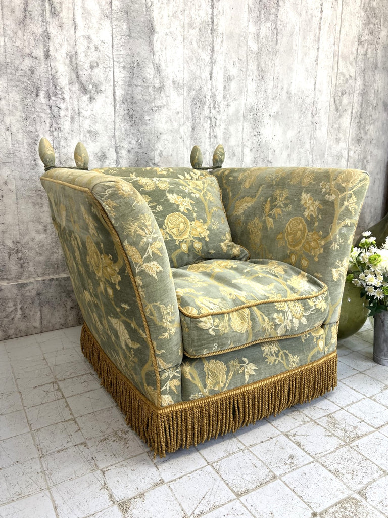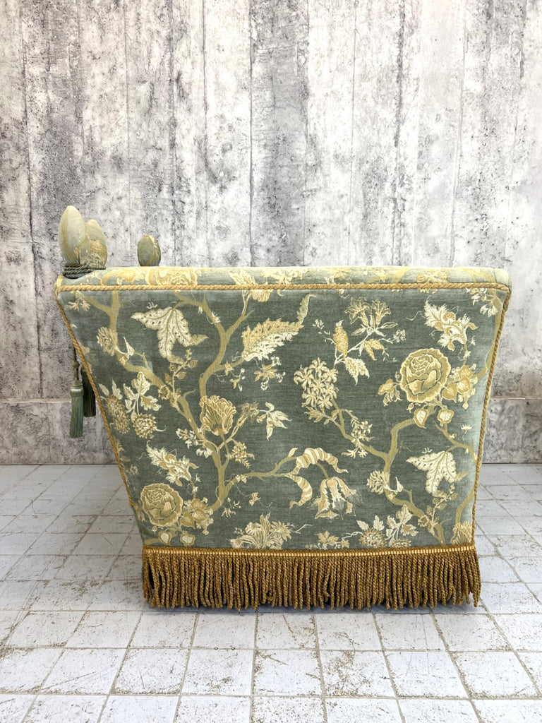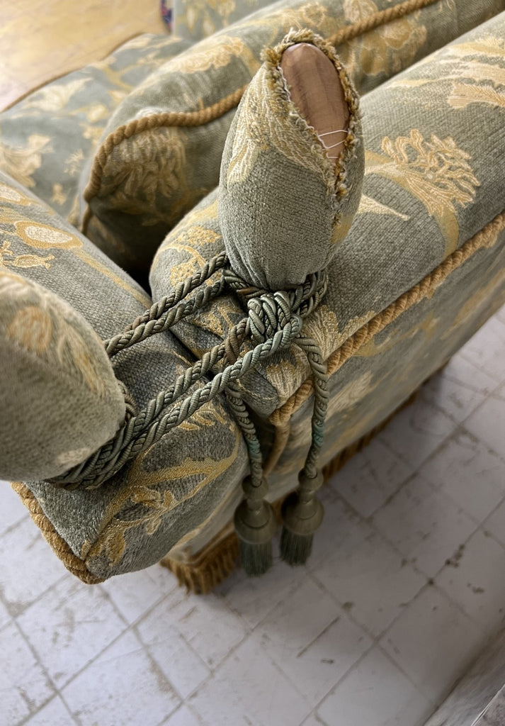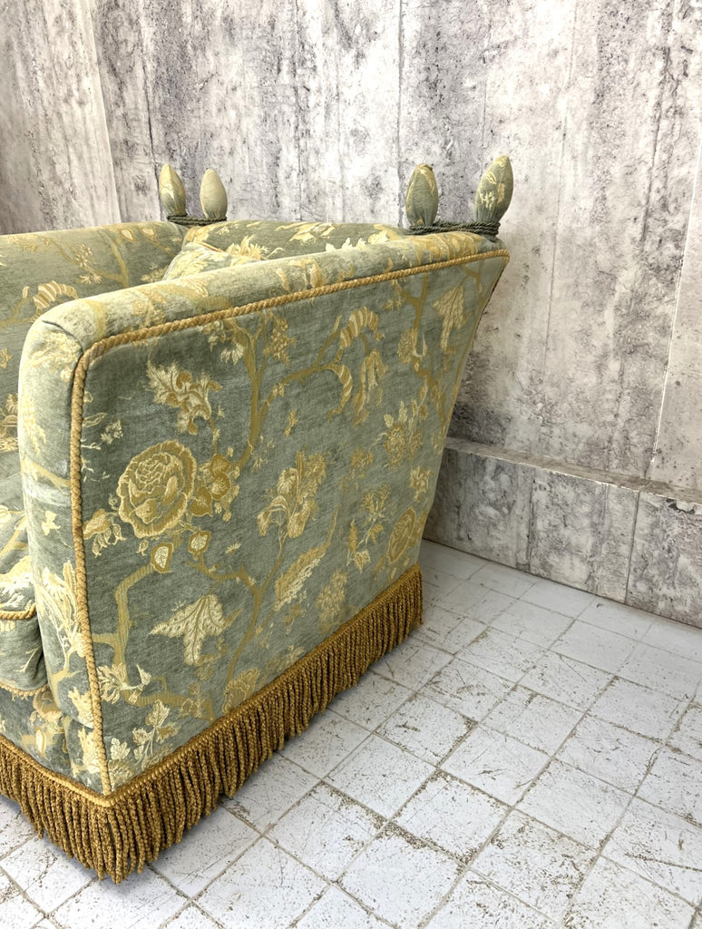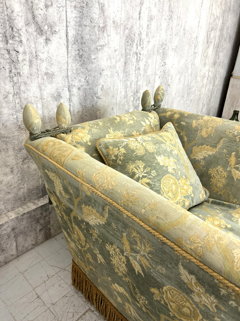 Based on and named after the design of sofa that originated from the Sackville-West Family seat, Knoll, this fabulous Gianni Rossi example is in wonderful condition. Dating from the year 2000, in this duck egg blue decorative velvet, we are selling to upholster. There are areas of fraying mostly on the finials and is in good use able condition. The arms and back are held in place with these beautiful tassels and will drop flat if required.