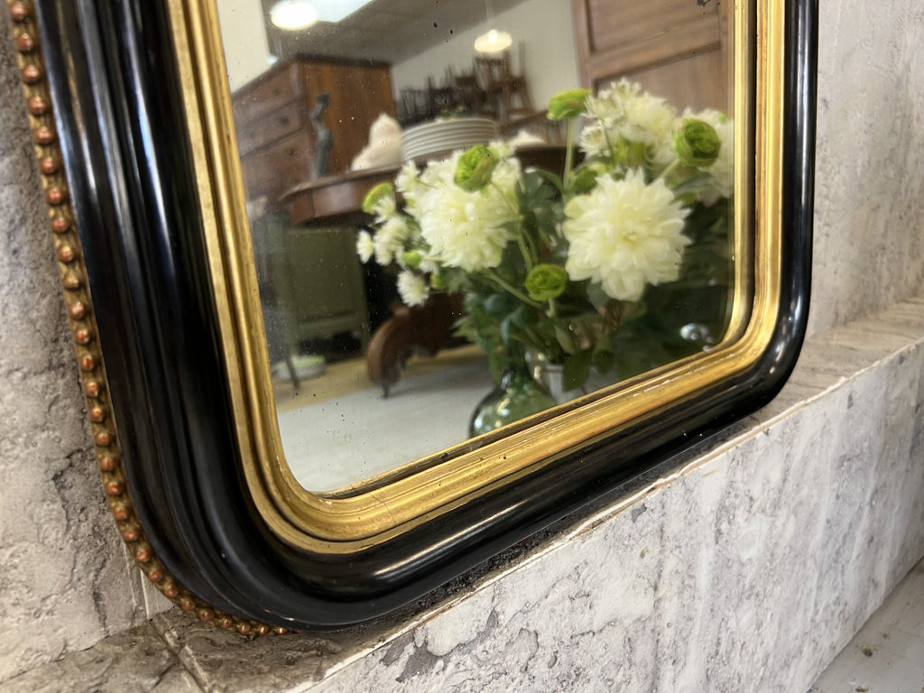 A very beautiful black and gold French Louis Philippe mirror. A lovely thick black frame with the gold detailing. The mirror is foxed and marked in places but you can see from the photographs that it doesn't effect its primary function.