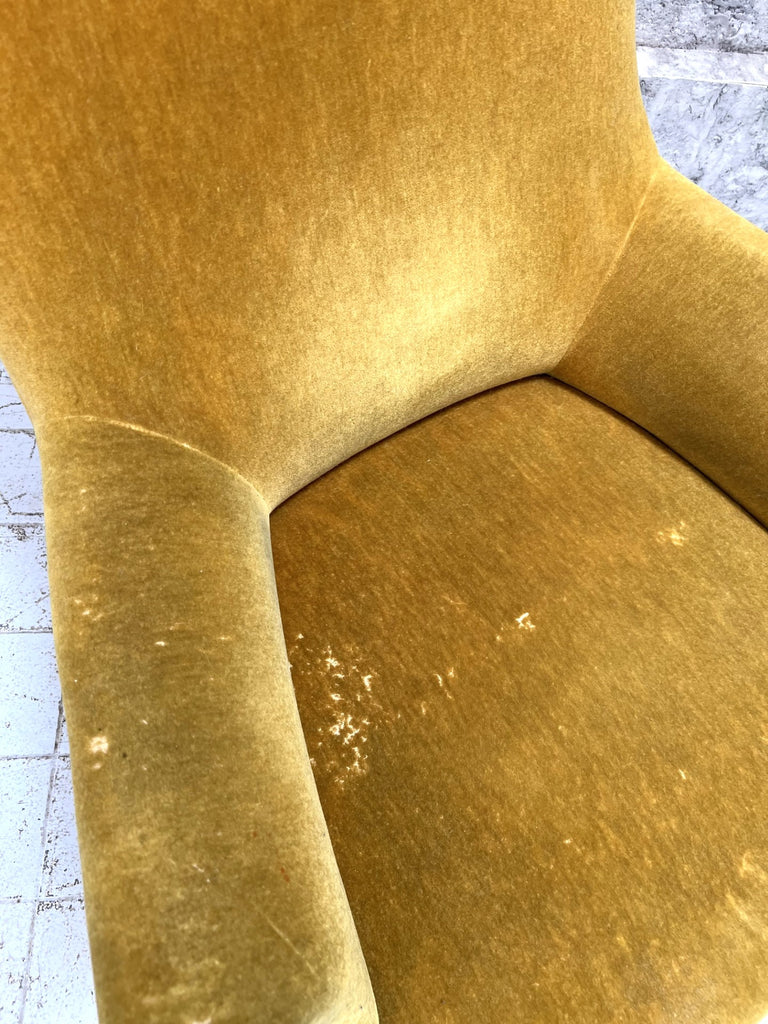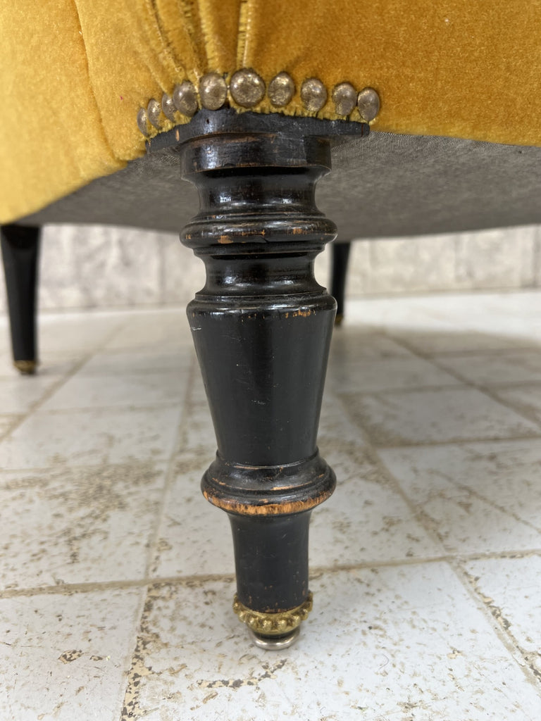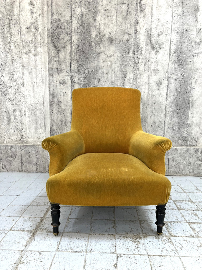A very beautiful and sought after 19th century French armchair with the original gold mohair velvet upholstery. Sadly there are extensive areas of wear but this is original so if the 'worn' look is you r perfect, there is no need to change the fabric. Please take a look at the beautiful turned ebonsied pear wood legs. They are unique and beautiful. We simply love these chairs.. they are increasingly hard to come by.