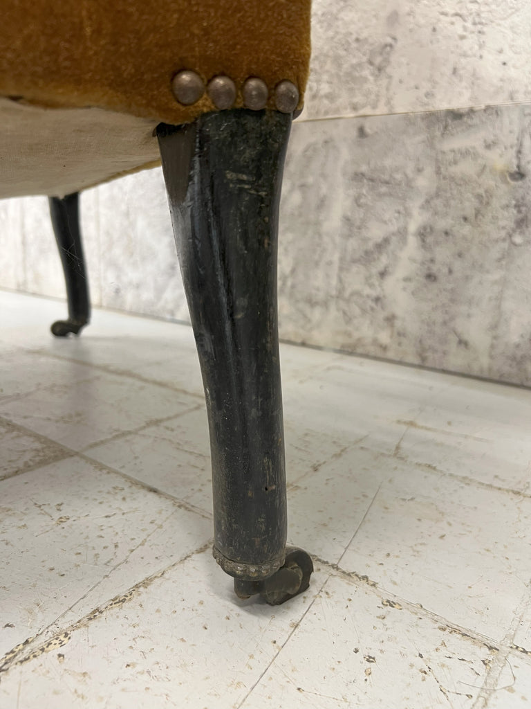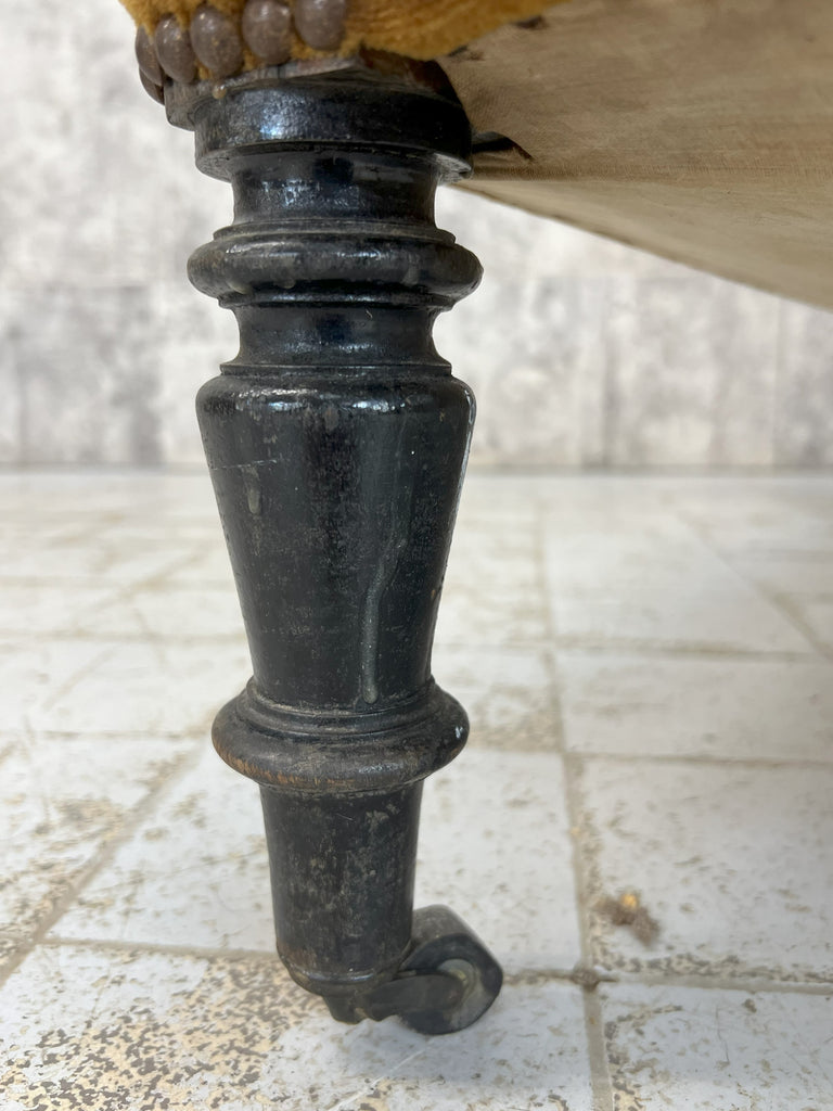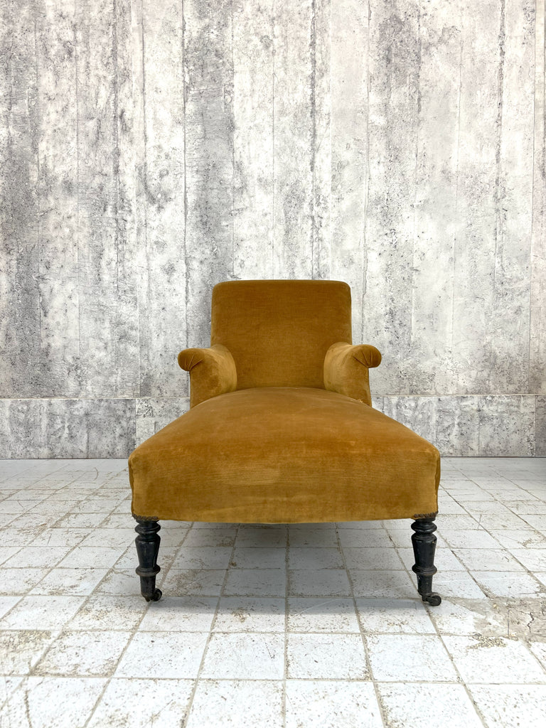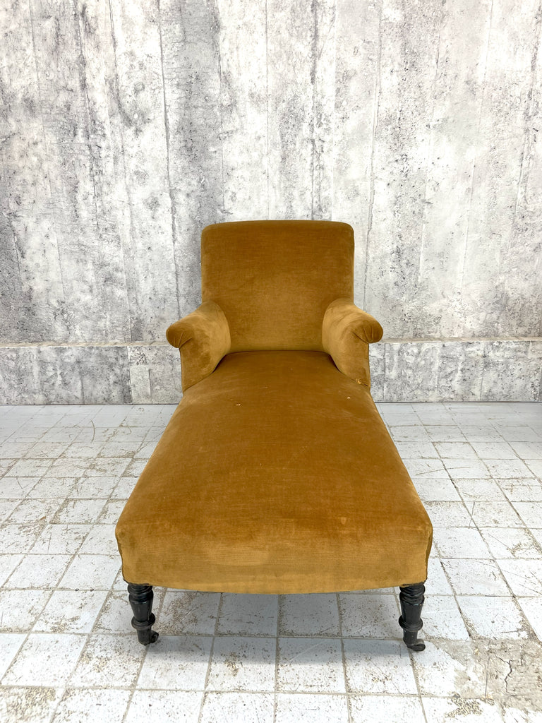 Amazingly comfortable, lovely lines, this chaise longue is a MUST have in any home.. a little boudoir glamour and ideal 'me time' spot.  This original Napoleon III chaise is sprung, has the beautiful original ebonised turned legs and original wheels and this forward facing style is particularly comfortable.  It has the original gold/mustard coloured cotton velvet but sadly there are two cigarette burns in the fabric.  If you can turn a blind eye to these, this is perfect to use as it is, but if you prefer a little more pristine, we have priced accordingly so it can be reupholstered.