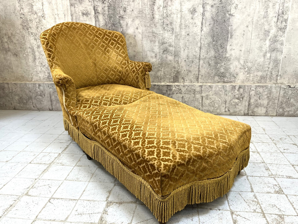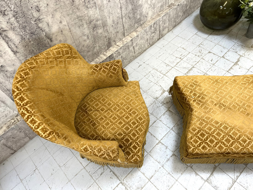 I absolutely love this chair, uniquely, with its original footstool and everything about it.  The shape is stunning.. it has this beautiful and simple back and rounded front to the seat, into which the footstool nestles perfectly to create a chaise longue.  When not required for putting your feet up, the footstool can be moved away to offer extra seating for another person.  The legs are solid turned wood with the original castors.. the beautiful gold velvet fabric and fringing is original too.  BUT the chair needs fully renovating.  The structure needs shoring up as the back and arms wobble, the springs need securing.. this really is a full renovation job but it will be worth every penny.  To find a chair of this age with its original footstool is like finding a needle in a haystack.  We have priced according to the condition but also its rarity.