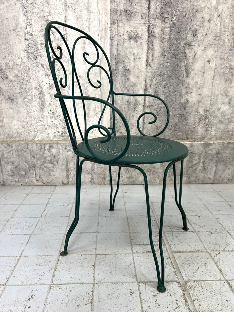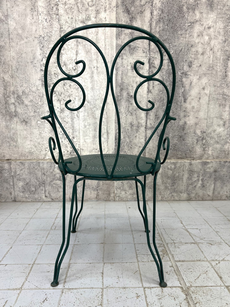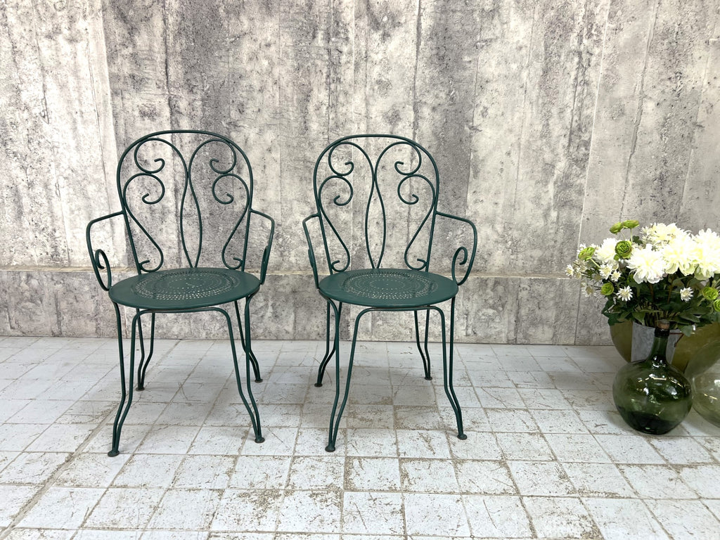 Simple pair of decorative French metal garden chairs (carvers) in fabulous green. The shape and design is fabulous. The are strong and sturdy and ready to use as they are, you will see signs of rust, but it is all superficial and is not through the metal. This adds to the charm. I would be tempted to marry them with a wooden table for a complimentary look or with a white or coloured metal table. They are classic, comfortable and ready to use.
