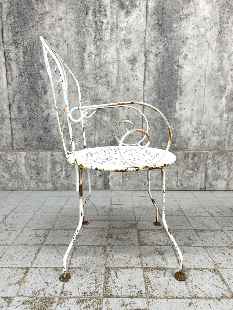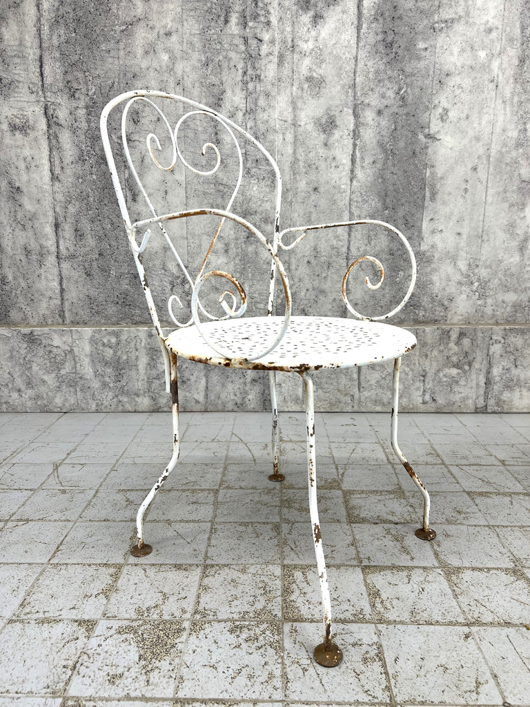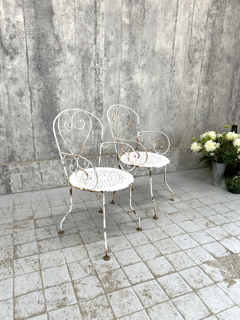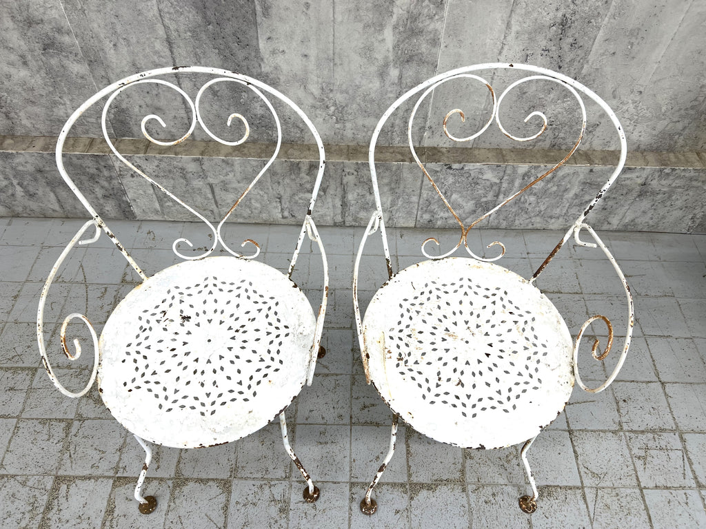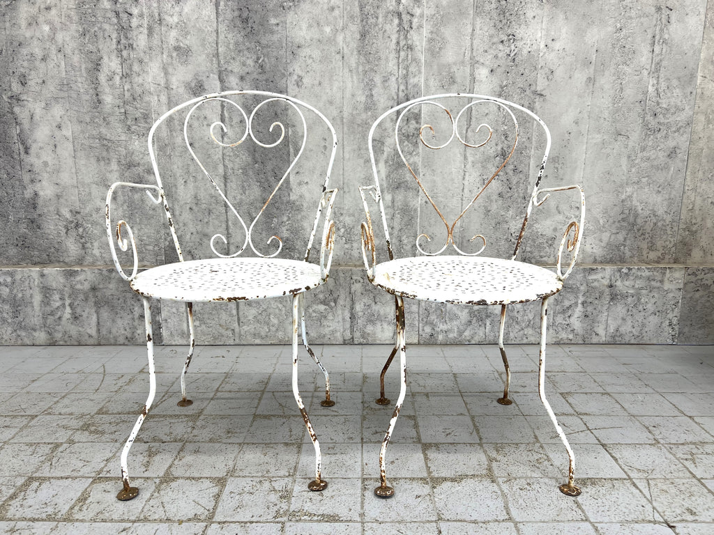 A pretty set of two carvers that has the original white paint, then layers of touch ups.. in parts that have flaked off and rust patches that are visible. The rust has not worn through at all so these are structurally sound. A classic style, matching pair.