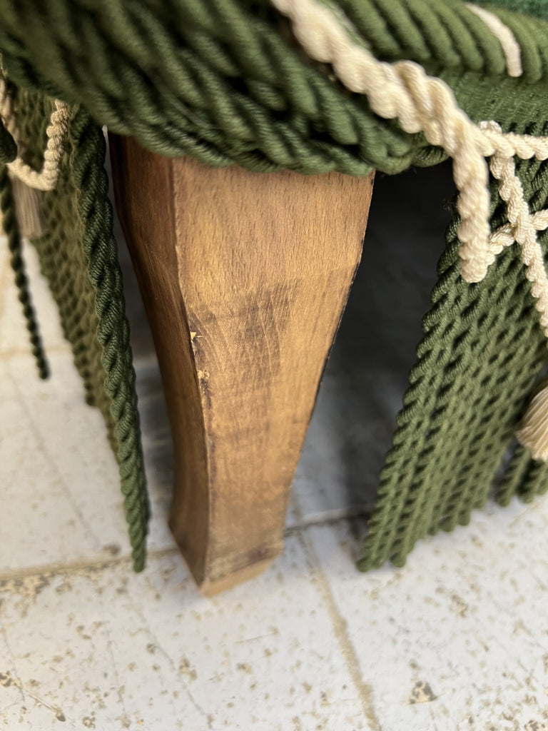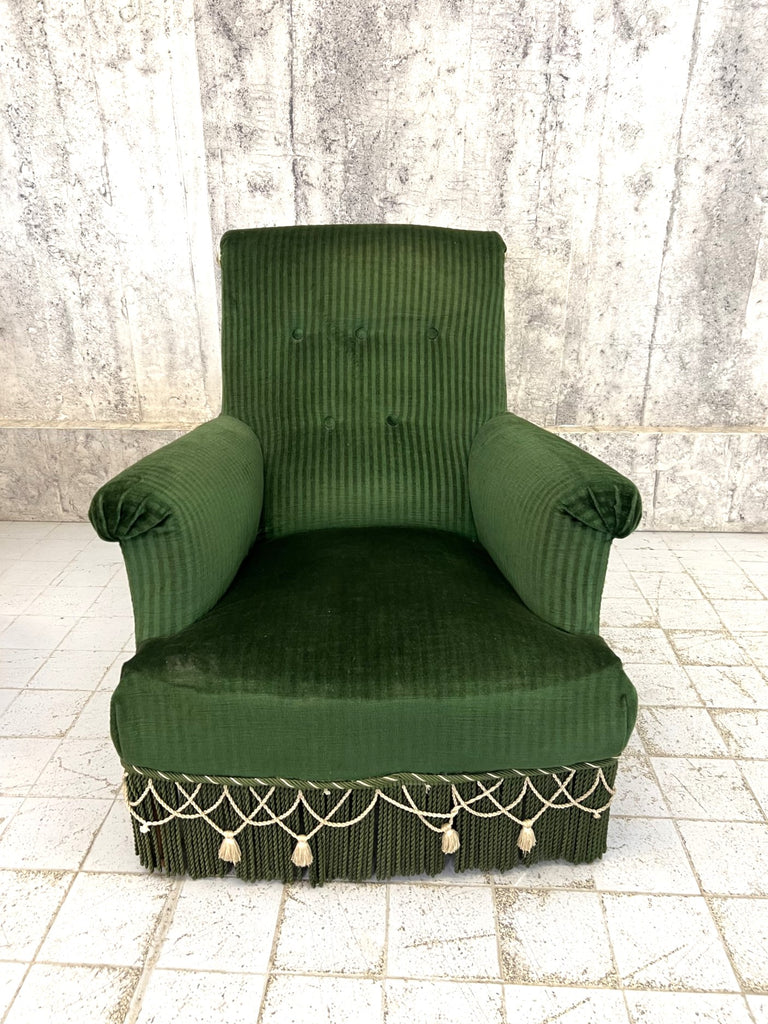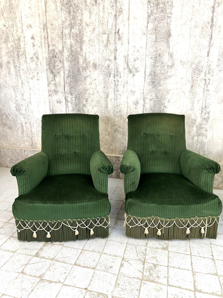 A fun and unbelievably comfortable pair of mid century armchairs finished in this festive forest green corduroy velvet fabric. The structure to these chairs is sound, but as you can see they need re-stuffing and recovering. These would make the ideal chairs for a bedroom, a small sitting room or a hallway.