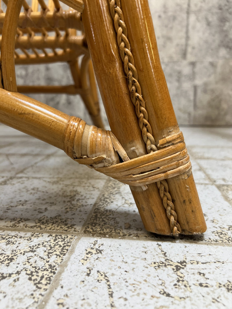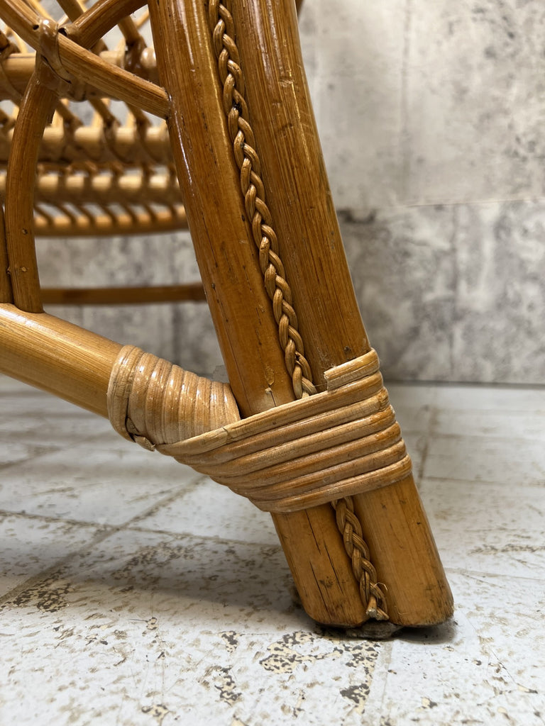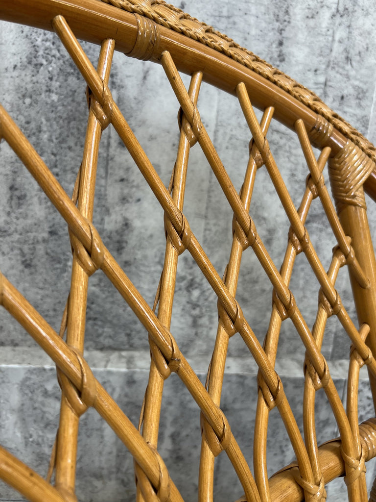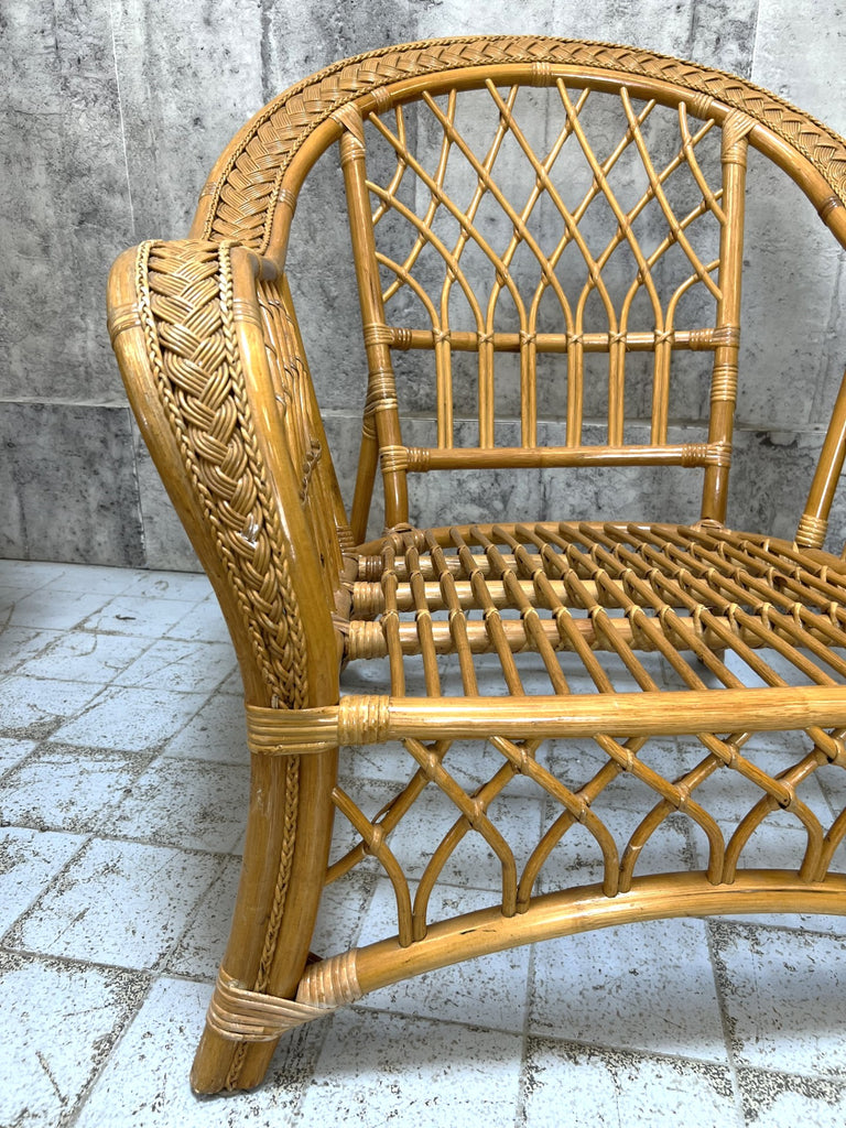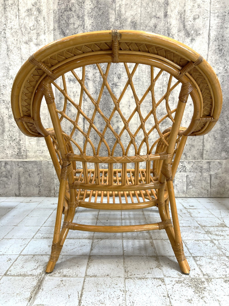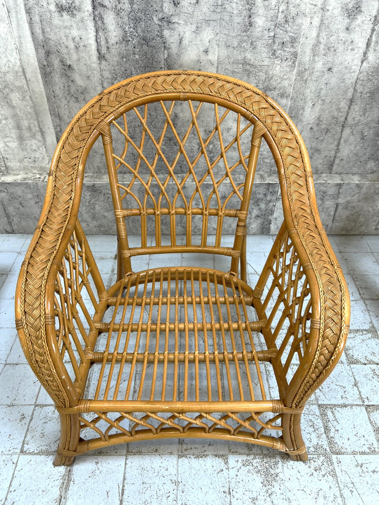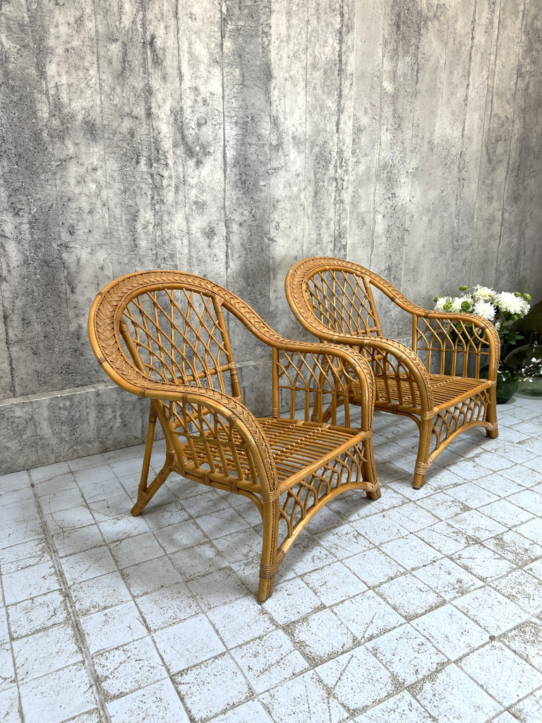 A pair of very handsome pair of mid century wicker armchairs with generous proportions. In overall good condition with the odd renovation around the legs. Please see the photographs. The backs and arms are in very good condition. There are no cushions. A wonderful choice of chairs for a sitting room, bedroom or conservatory, orangery or garden room.