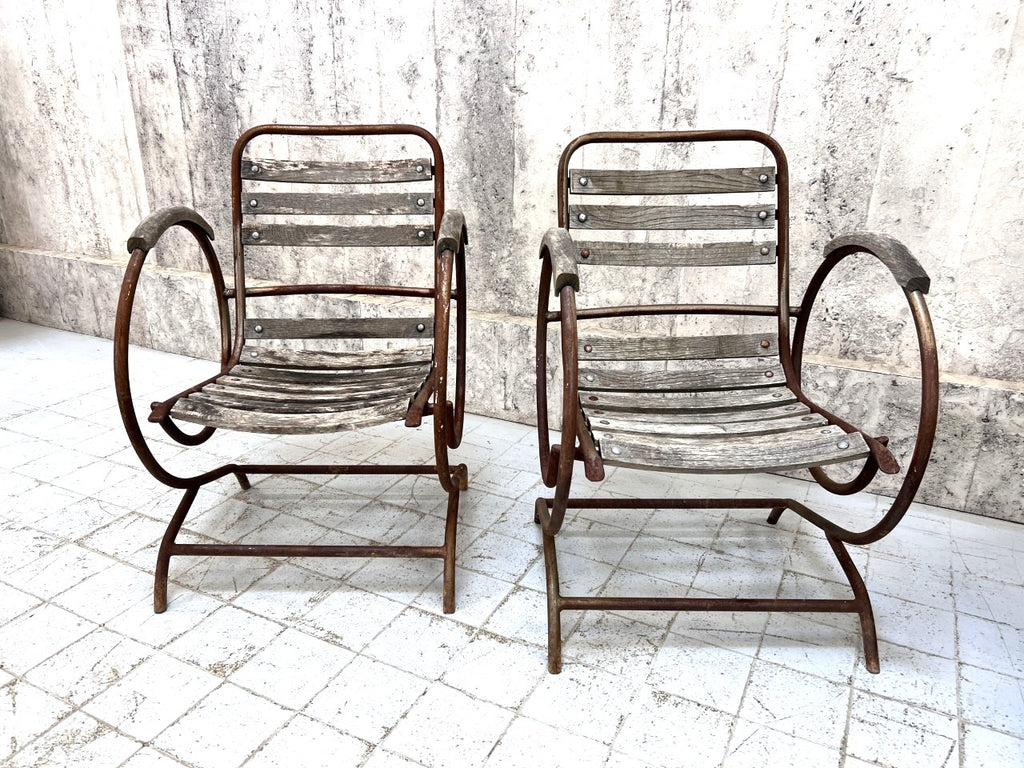 The most extraordinary pair of garden chairs I have ever seen and I absolutely love them. From the 1970's we believe, the metal frame has these dramatic and pronounced circular arms and the wooden slats, that are all original are in wonderful used condition. These are ready to use as they are or they could be painted if you wish. I love their current aesthetic.