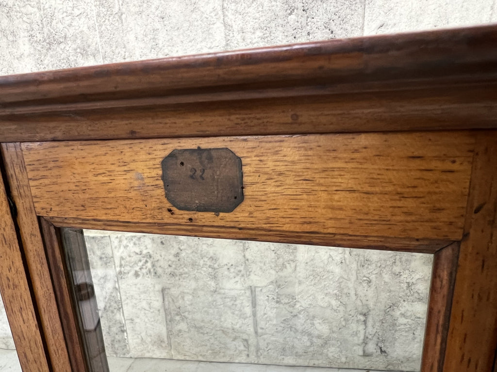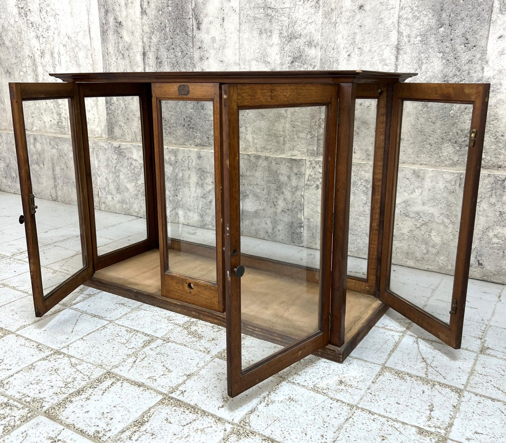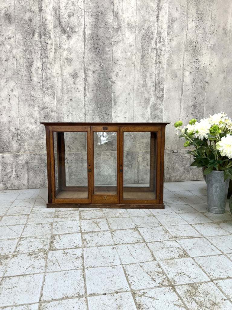 A fabulous antique table top pharmacy display cabinet with solid wooden frame and the original glass doors. I will be honest, I have syphoned this piece off for a number of years to use to display a Lego pirate ship made by one of our children!! The pirate ship has now moved on so reluctantly I am selling this beautiful piece. Three doors open. I don't know if this would have stored scales or equipment or if it was to display product.