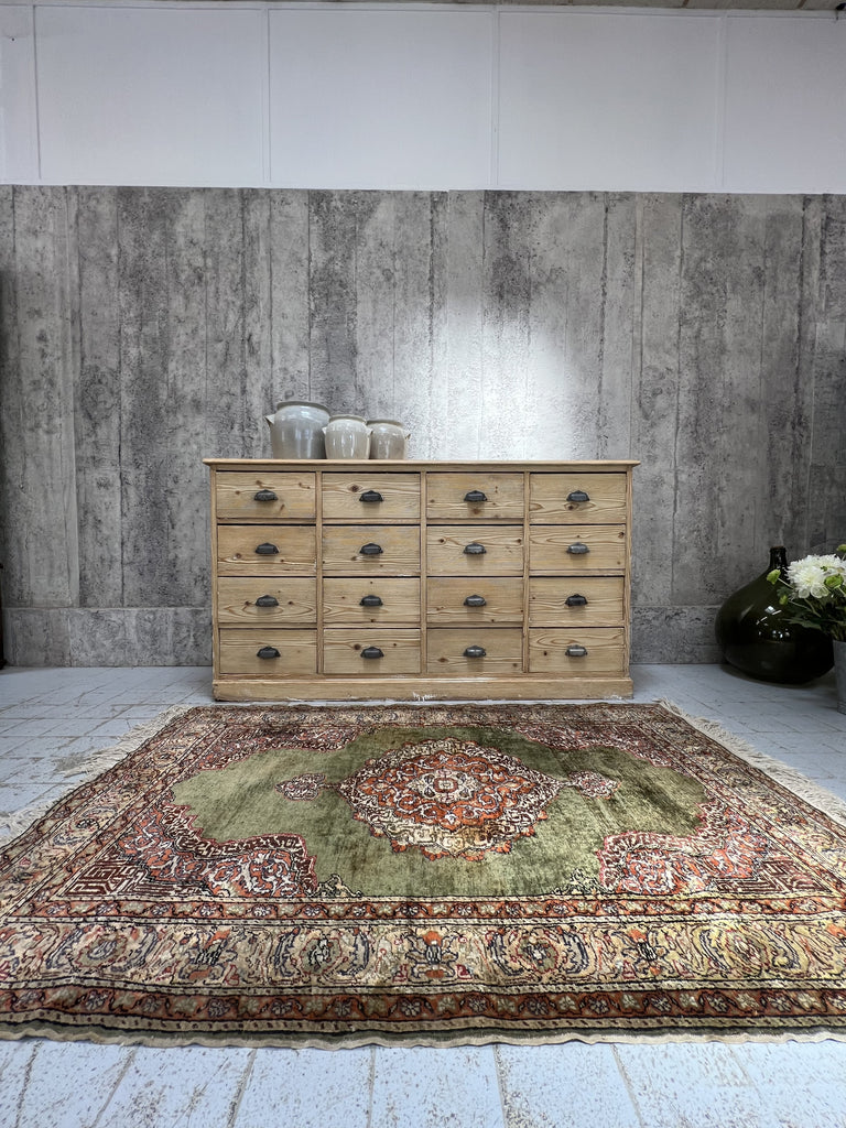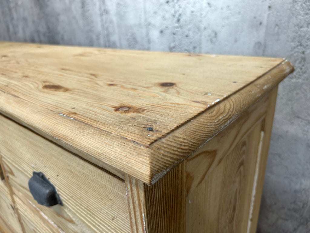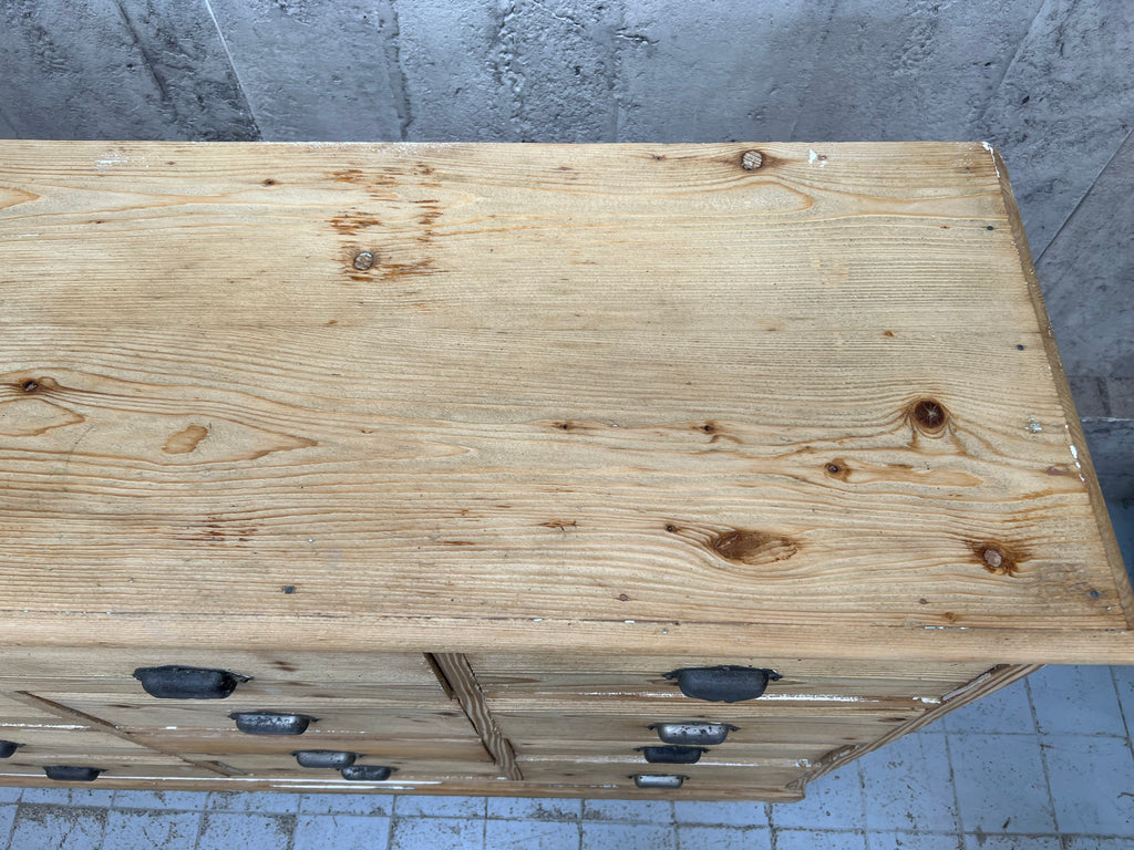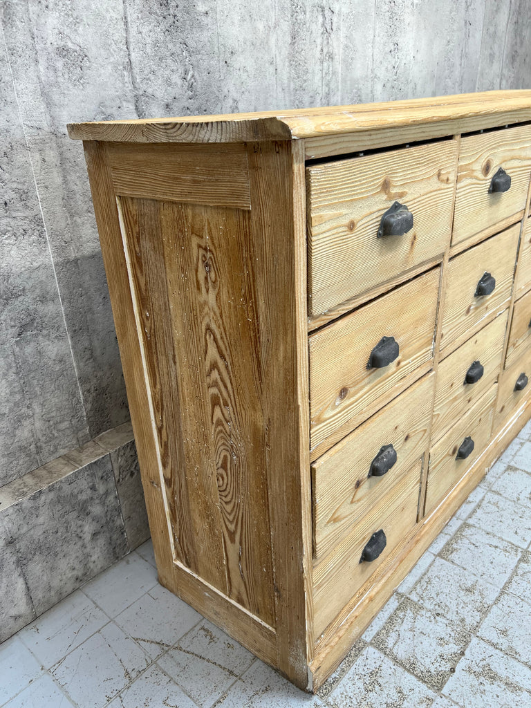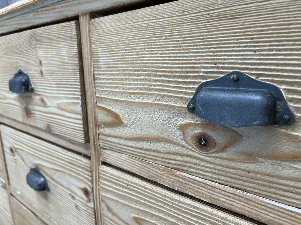 A fabulous set of drawers. Made originally for a pharmacy, for storing medications and products, this solid pine sideboard is a wonderful storage unit for really anything. Ideal to store candles and table linen in a dining space, clothes in a bedroom, shoes and hats in a hallway. I literally have a sideboard like this in every room in our home. With a small footprint they are ideal for adding a wow piece, ideal for massive storage and the ideal spot to create a focal point by dressing with your favorite artwork or object d'art or tv! The wood has been treated so that the grain is raised and textured. This softens with use, age and waxing. There is evidence of the old paint colour remaining.. A fabulous set of drawers, rustic to touch and hugely practical and always a statement.