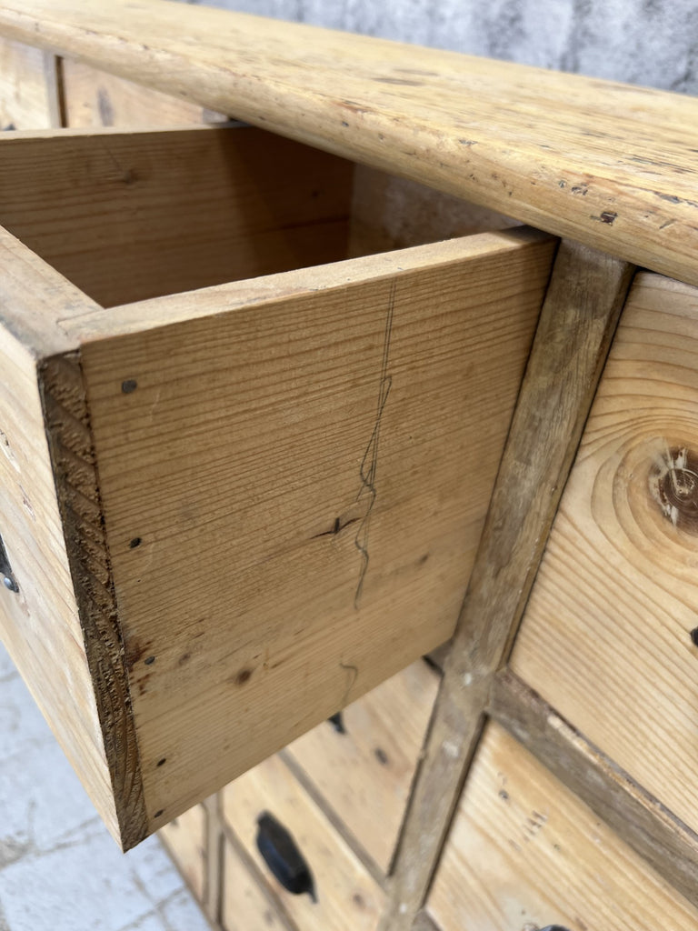 A rustic but fabulous sideboard which has come from a pharmacy and would have stored boxes of product. Originally painted then revarnished and painted again, this unit has been stripped back to the original wood. The drawers and carcass has been made from a pine and the front, into which the drawers sit has been made from a harder wood. I love this mixture of woods and it is an illustration of days gone by when the materials available were the materials of choice.