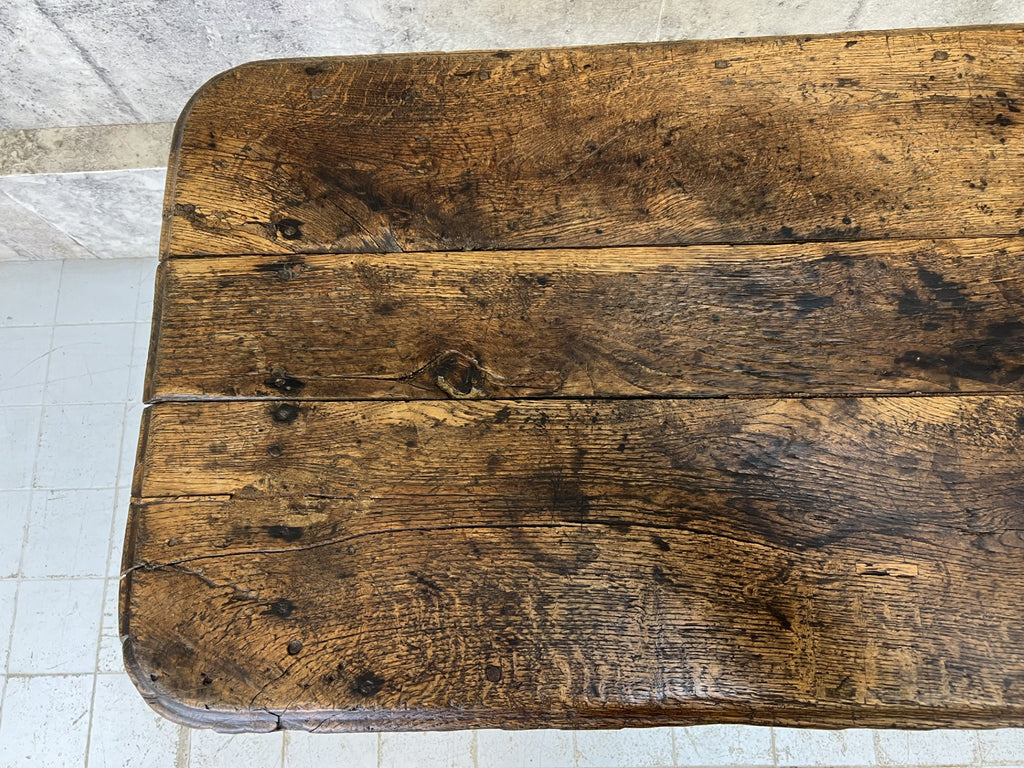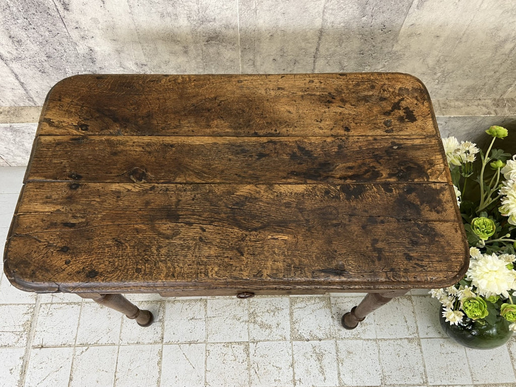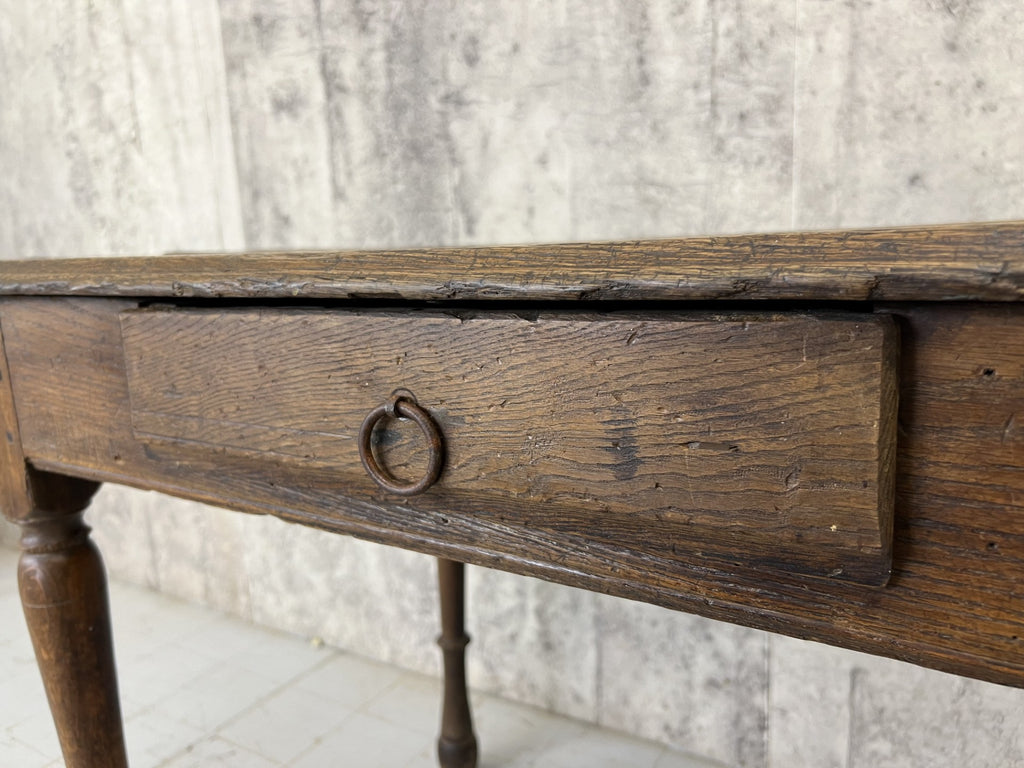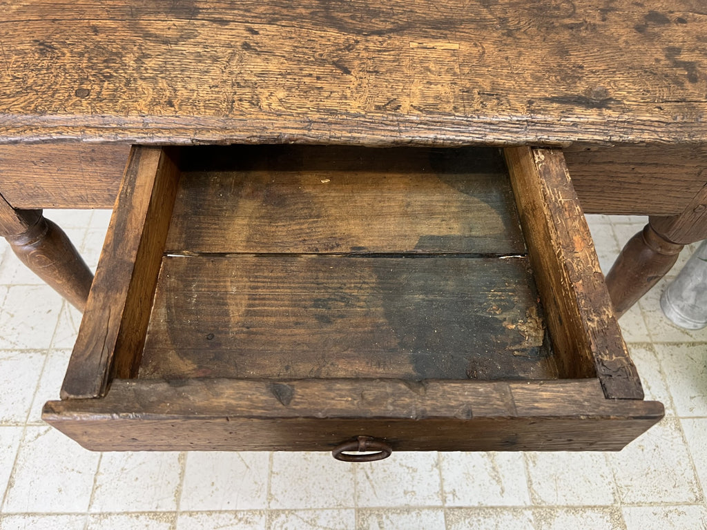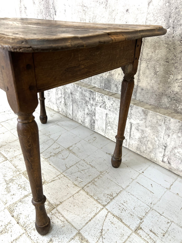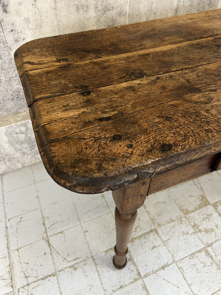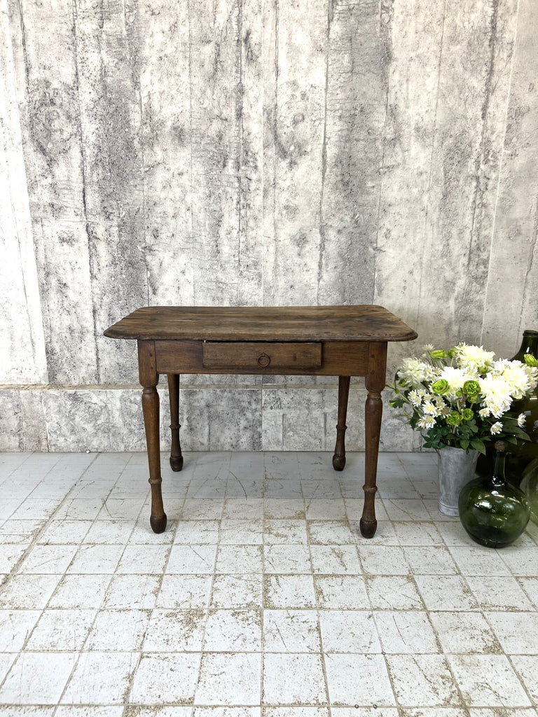 This very rustic and gnarly wooden table is old and has had the most wonderful careful wear over the decades. Sound structurally and the wood is solid and strong with lots of marks and wear. Ready to use in a kitchen or as a desk or prep area.