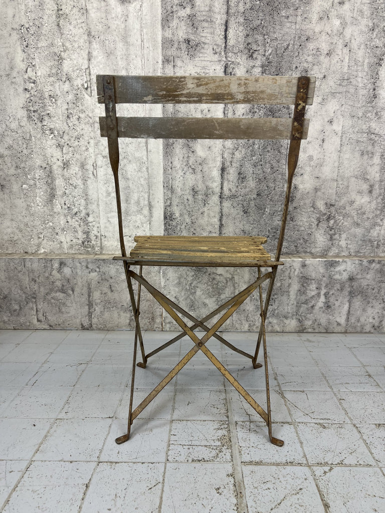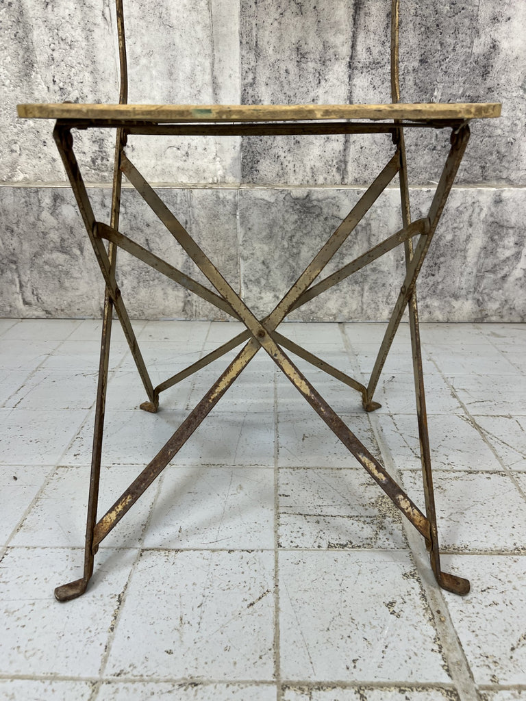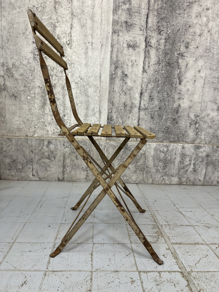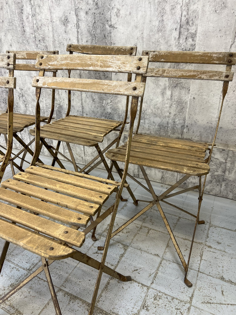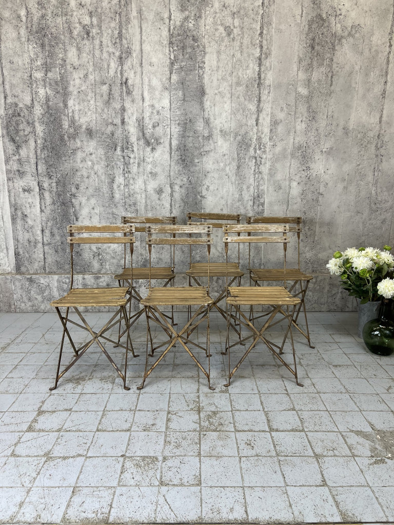 A beautiful set of this classic French folding bistro chair. Perfect for al fresco dining, a cafe, a bistro. In very good condition, with historic bashes and bruises commensurate with age and use. Usually a slightly rickety style, but these are not at all wobbly. In great condition, ready to use. Just a note on the design. The legs.. check them out. Sch a beauty design and shape. These fold flat to store.