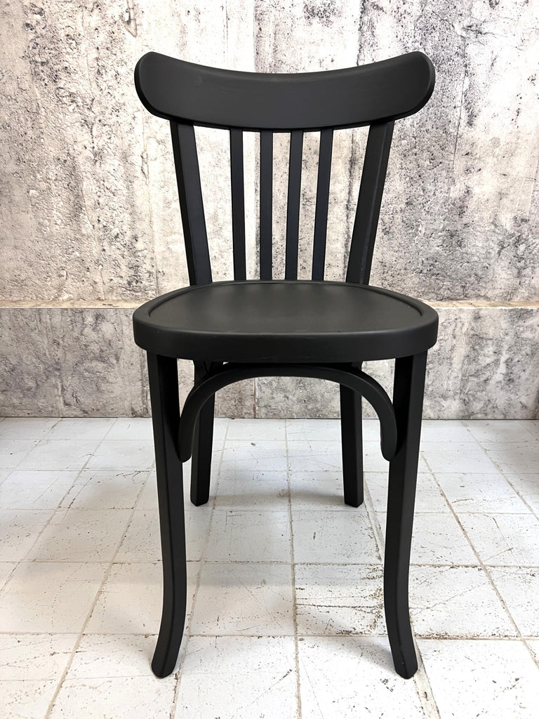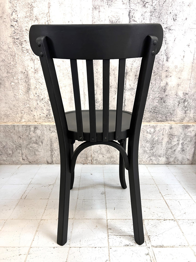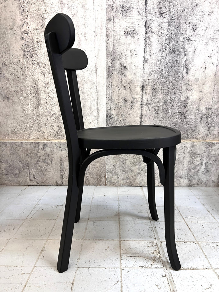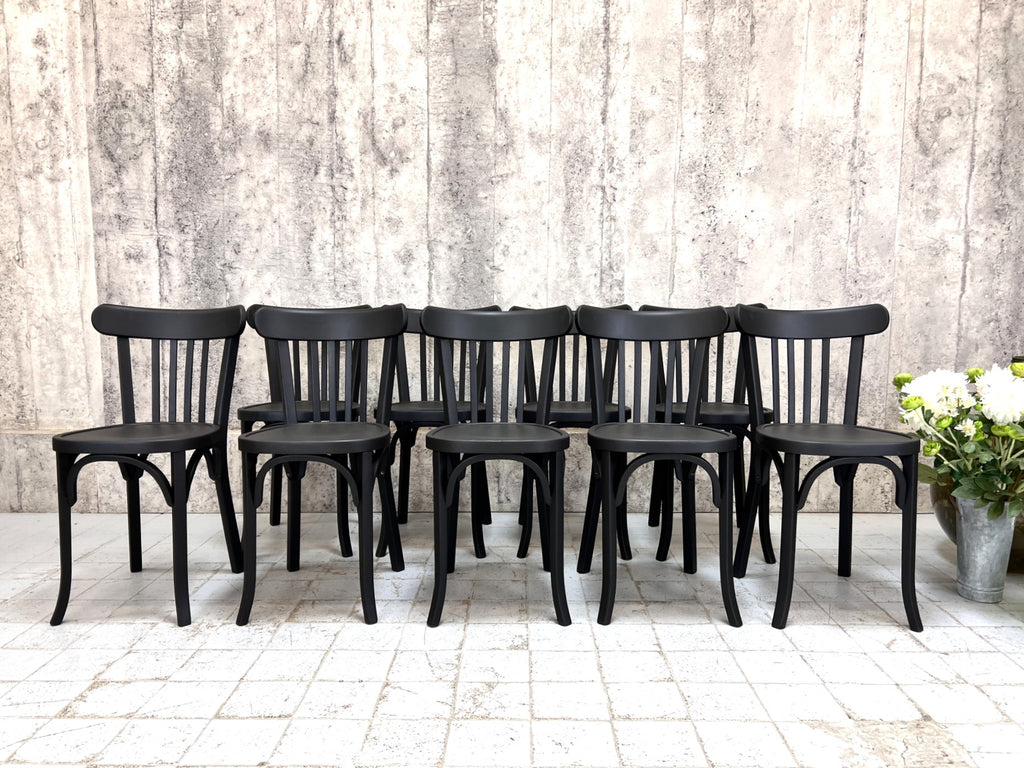 This classic set of nine bistro chairs have recently been painted in this matt black finish, which gives them a modern edge and a practical twist. To us this black finish looks fabulous with a wooden table that has a beautiful patina, or in a monochrome setting, perhaps married with a glass or marble table.