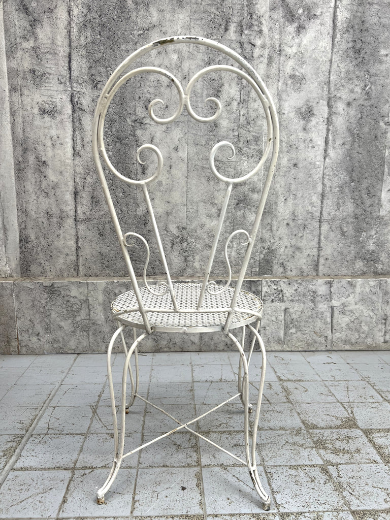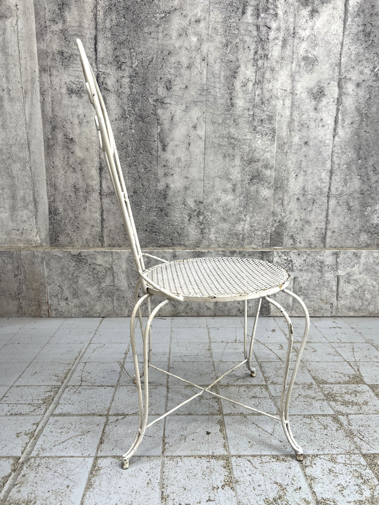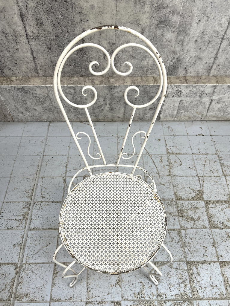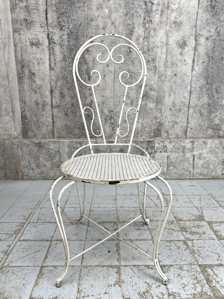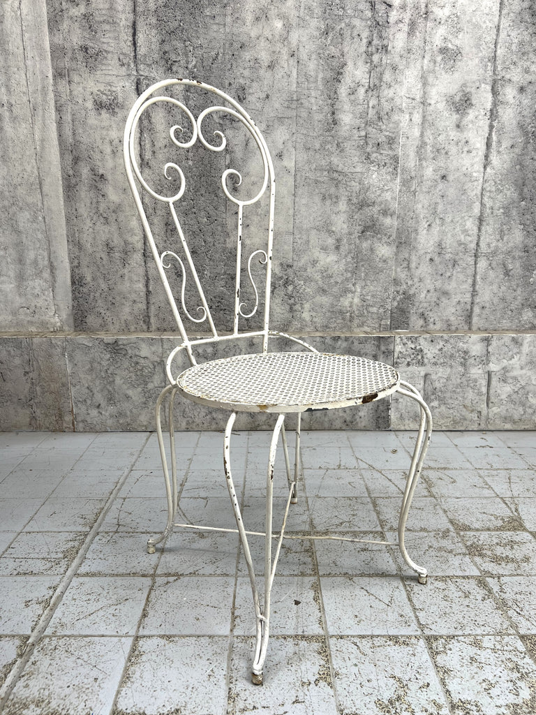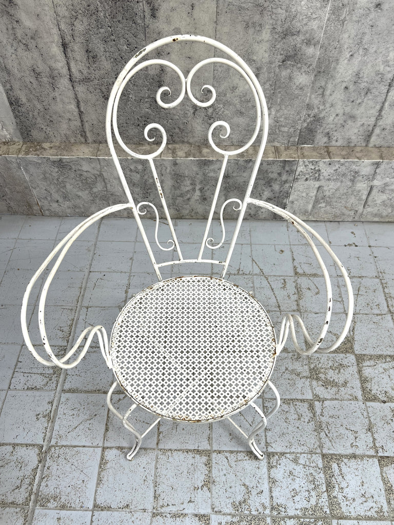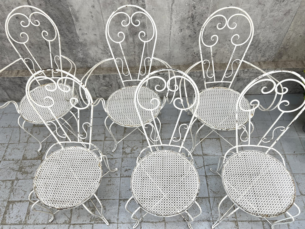 A matching set of decorative Mid Century French metal garden chairs in the classic white. Three carvers and three matching chairs. The shape and design is fabulous. The are strong and sturdy and ready to use as they are, you will see signs of rust, but it is all superficial and is not through the metal. This adds to the charm. I would be tempted to marry them with a wooden table for a complimentary look or with a white or coloured metal table. They are classic, comfortable and ready to use.