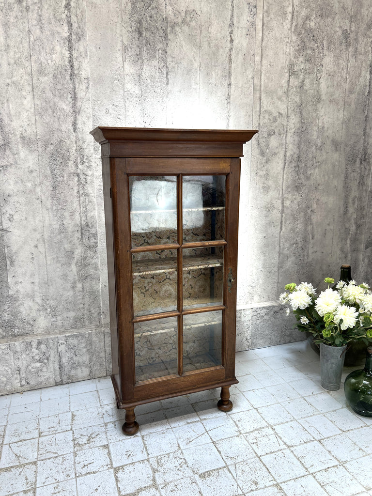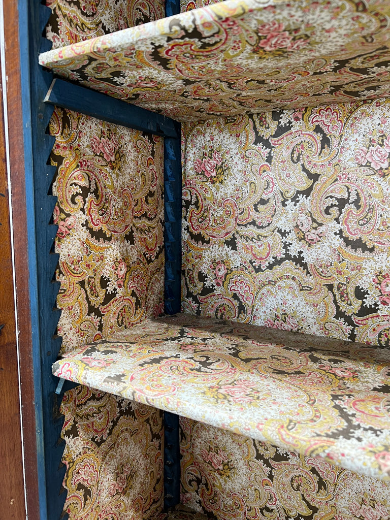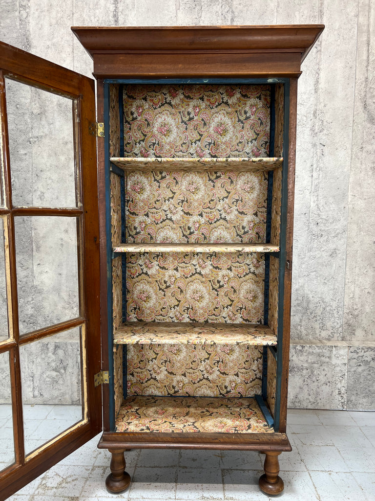 A fabulous tall and narrow solid wood, French display cabinet with glass front doors. Ideal as storage for a bathroom, kitchen or for a small corner in any room. Display you everyday items or your treasures in this cabinet, for the footprint this piece takes, it's storage is considerable. We have left the unique paisley silk lining of the interior and the shelves. A unique touch.