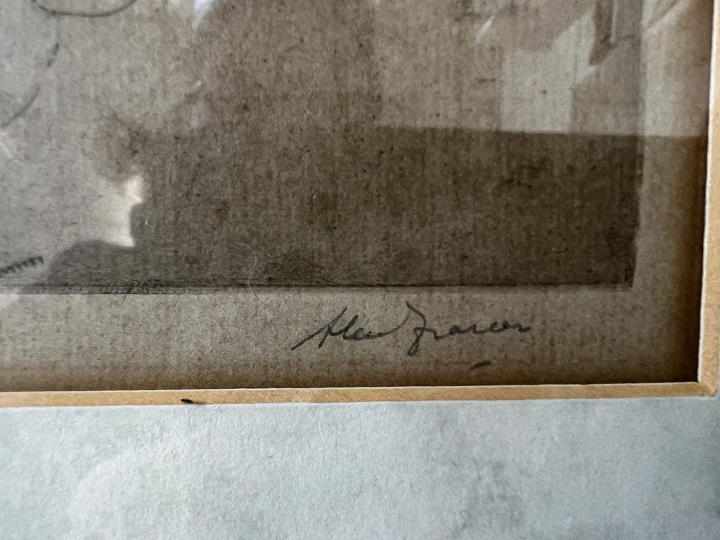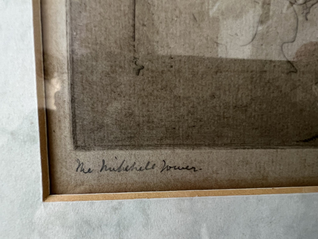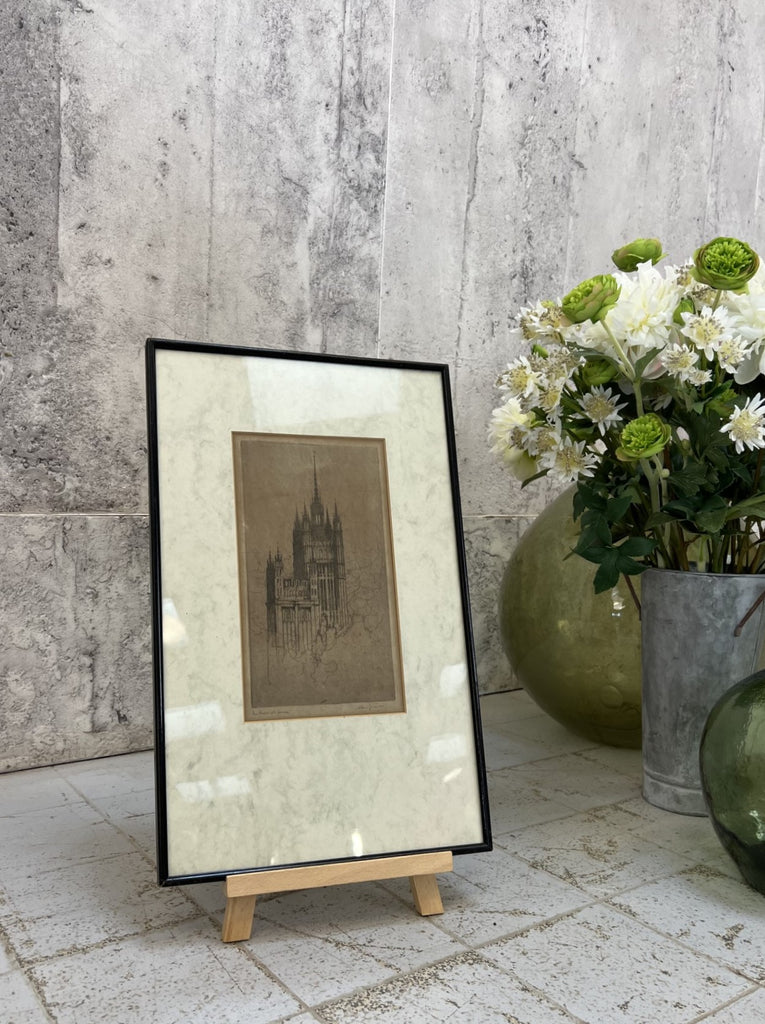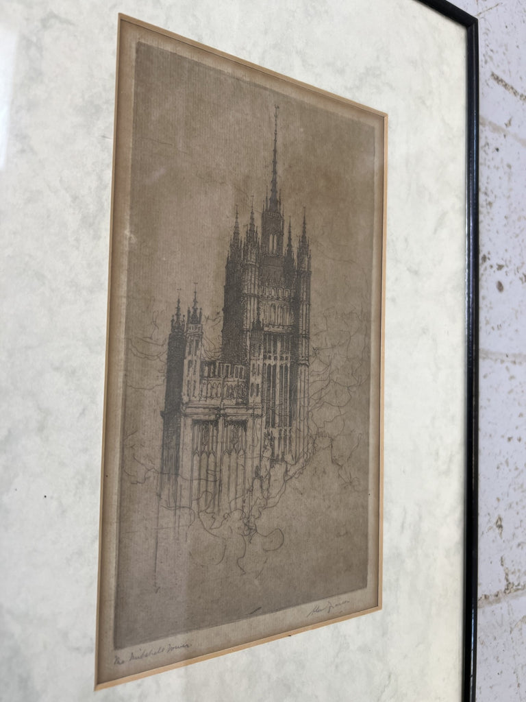 A stunning line drawing of a named Tower, (which I am afraid I cant read) and signed by the artist. A stunning composition, neutral, which would look fabulous in a neutral scheme or on a picture wall. Impossible to photograph with the light reflecting off the glass.