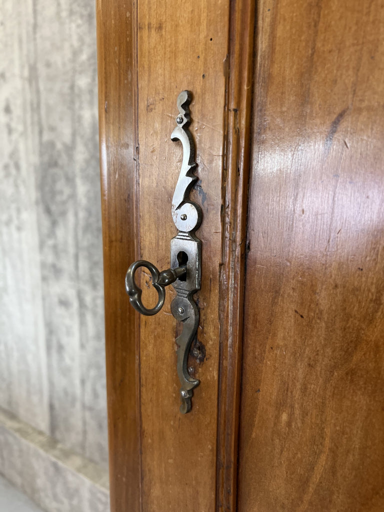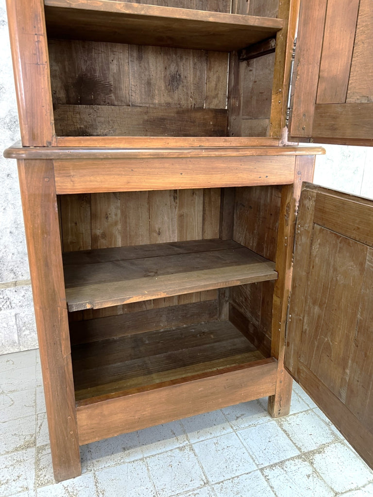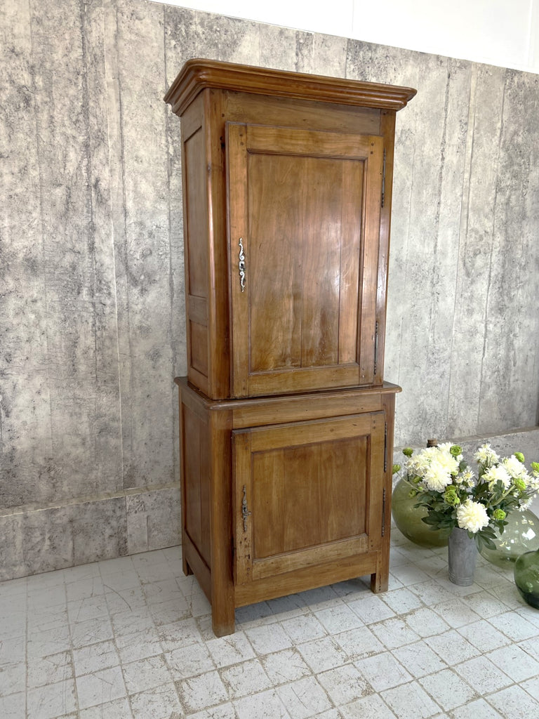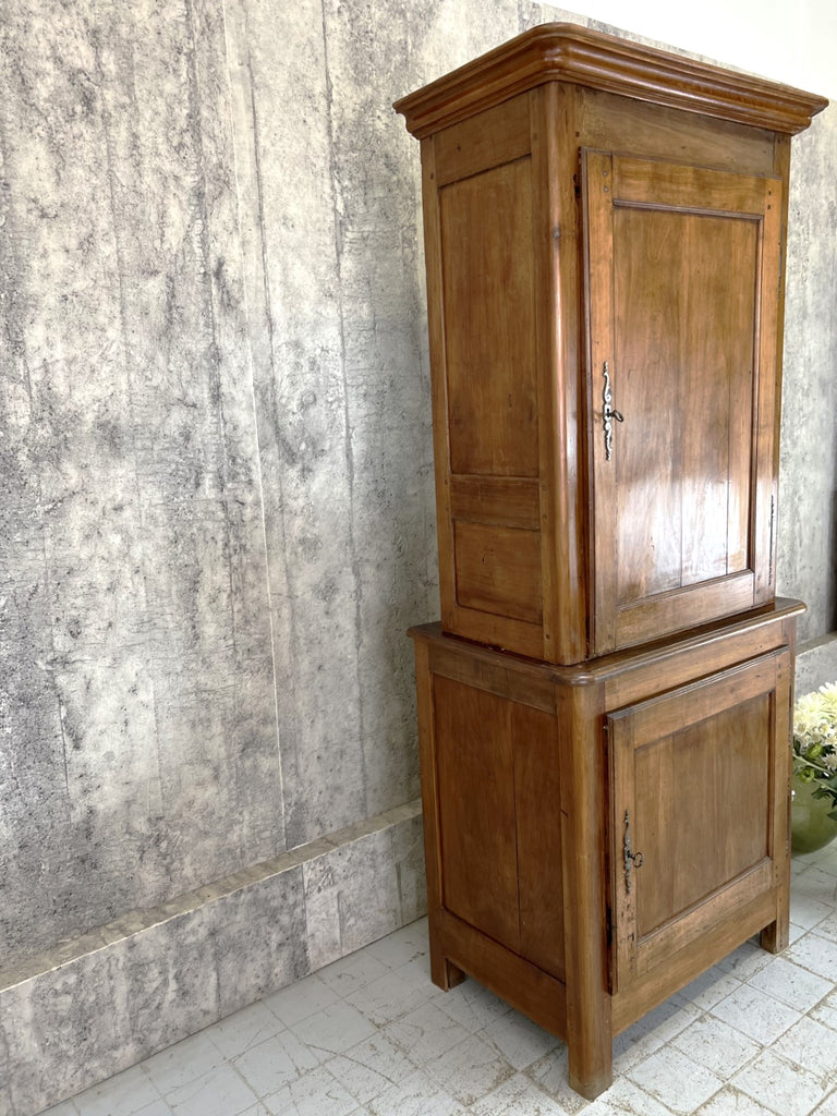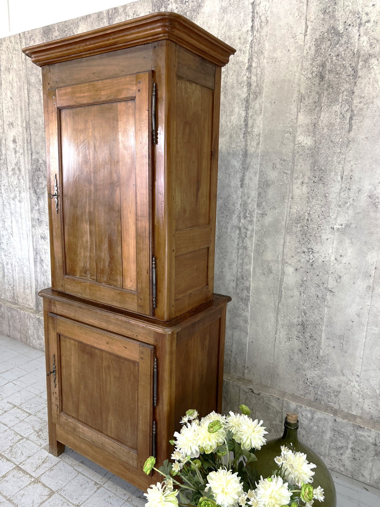 A solid and heavy French cupboard, with the most beautifully mellow solid wood. The doors open to shelves. Ancient wood worm, bashes and bruises as you would expect but in good working order. Sometimes referred to as a bontierre, sometimes a fruitiere, but what we can agree on is that this cupboard is endlessly useful for storage in many different areas of the home or work space. The top section is not fixed to the base so the top could be fixed ot the wall and used as a separated kitchen unit. Clever! Ready to use as it is for a larder cupboard, hallways storage, bedroom storage or anything you like.... a really fabulous piece.