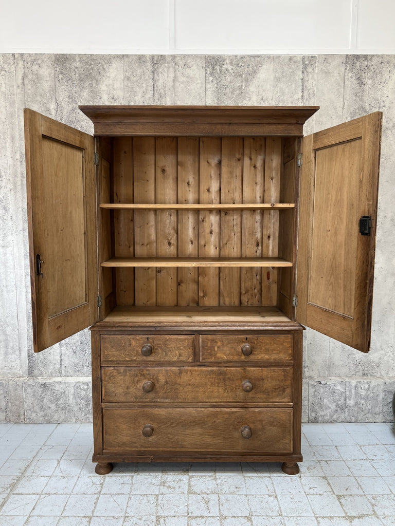 A very fabulous linen press comprising of two parts that sit beautifully together giving the feeling of a very compact and handsome storage solution. There is cupboard storage in the top section and the base has 2 full width drawers and 2 half width drawers. I originally sourced this piece for my own home which sadly I have had to give up. Ideal for storage in a pantry, in a laundry, in a bedroom, hallway.. just a really versatile forage unit. The wood is in great condition but this could be easily painted if you wanted to match your scheme. Bumps and bruises commensurate with use and age.