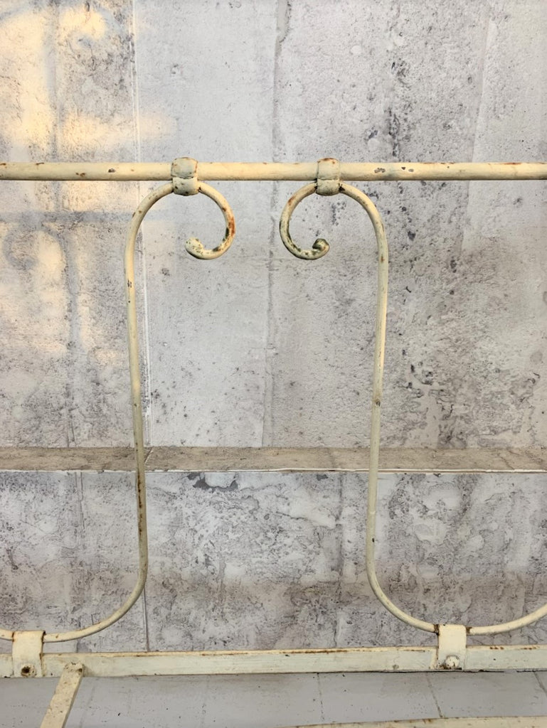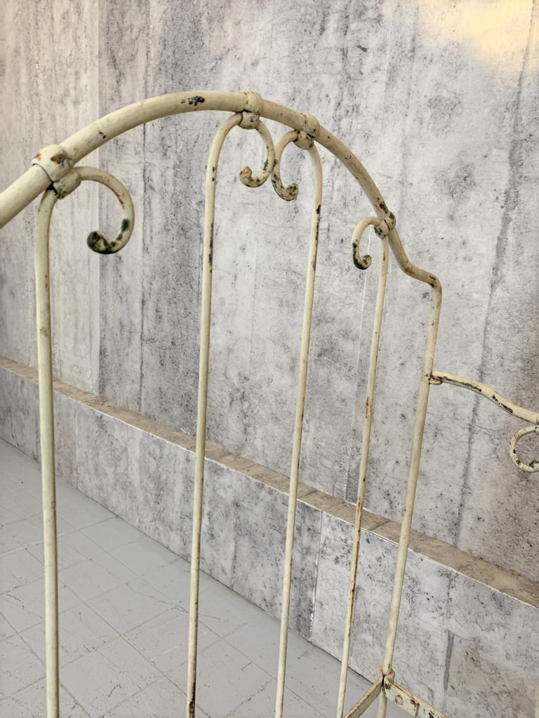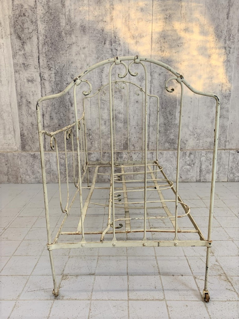 This day bed is a classic French piece of great design. Simple and easy to use fixings, folds flat for storage and is completely versatile. Can be used as a daybed for the terrace or garden. One side can fold down. This would have once been a cot and it even has the fixings that would have enabled a muslin tent to be draped over the cot to protect the sleeping baby from flies. It must not be used as a cot now due to specific modern design regulations. Wonderful now as a seating option or a decorative piece.