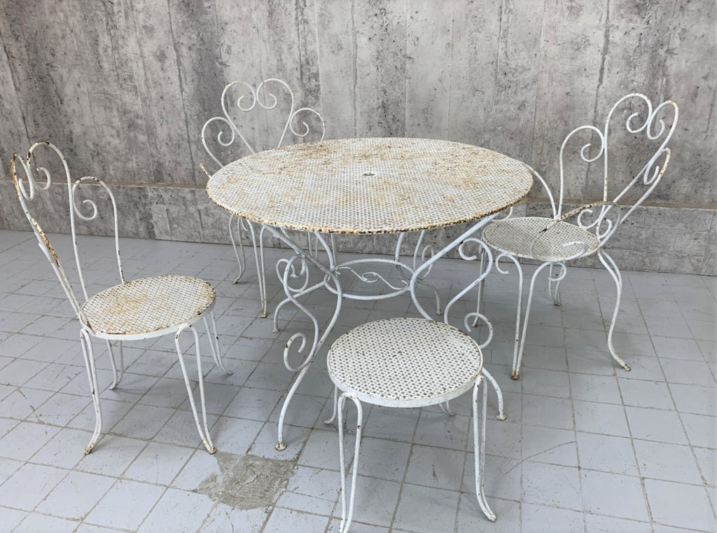 The condition of the set is very good.  Painted white, there is evidence of rust, but the best kind, the kind that has texture and character.. none that has worn through the metal.  The set is ready to use as it is.