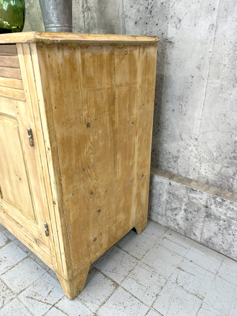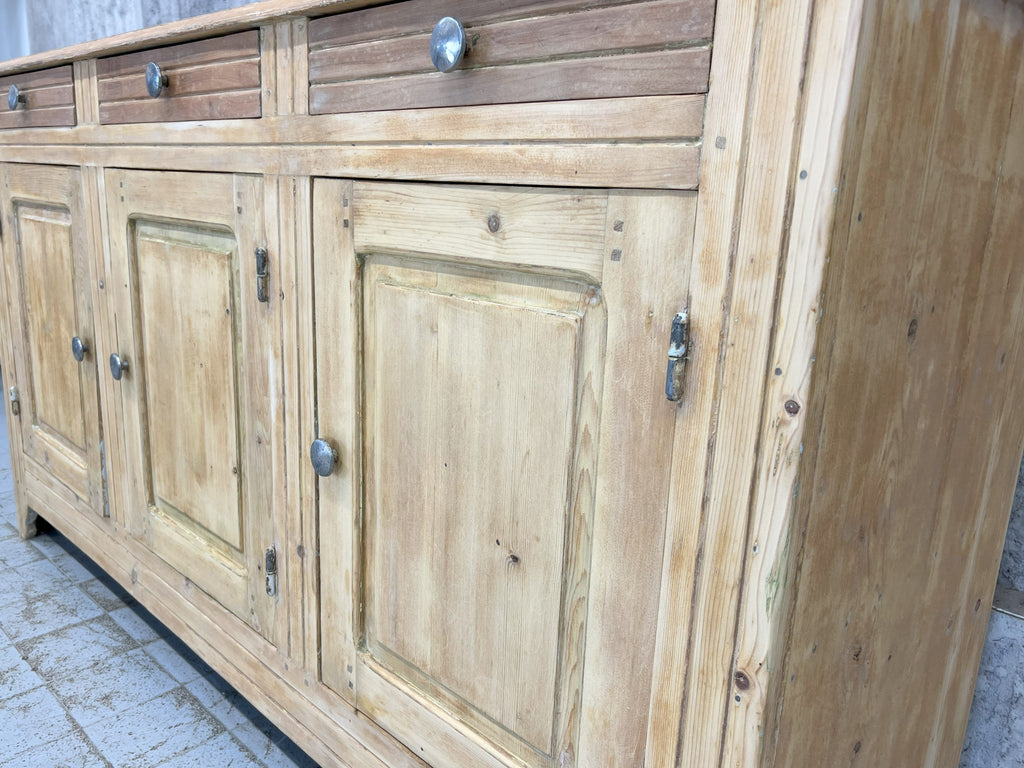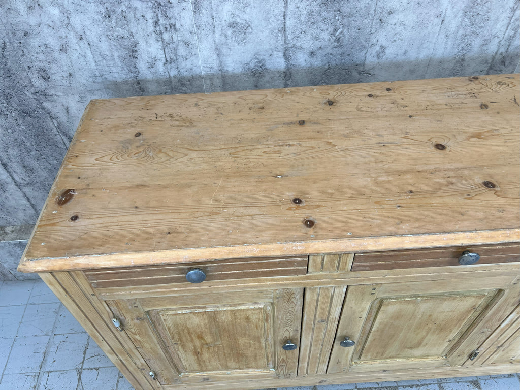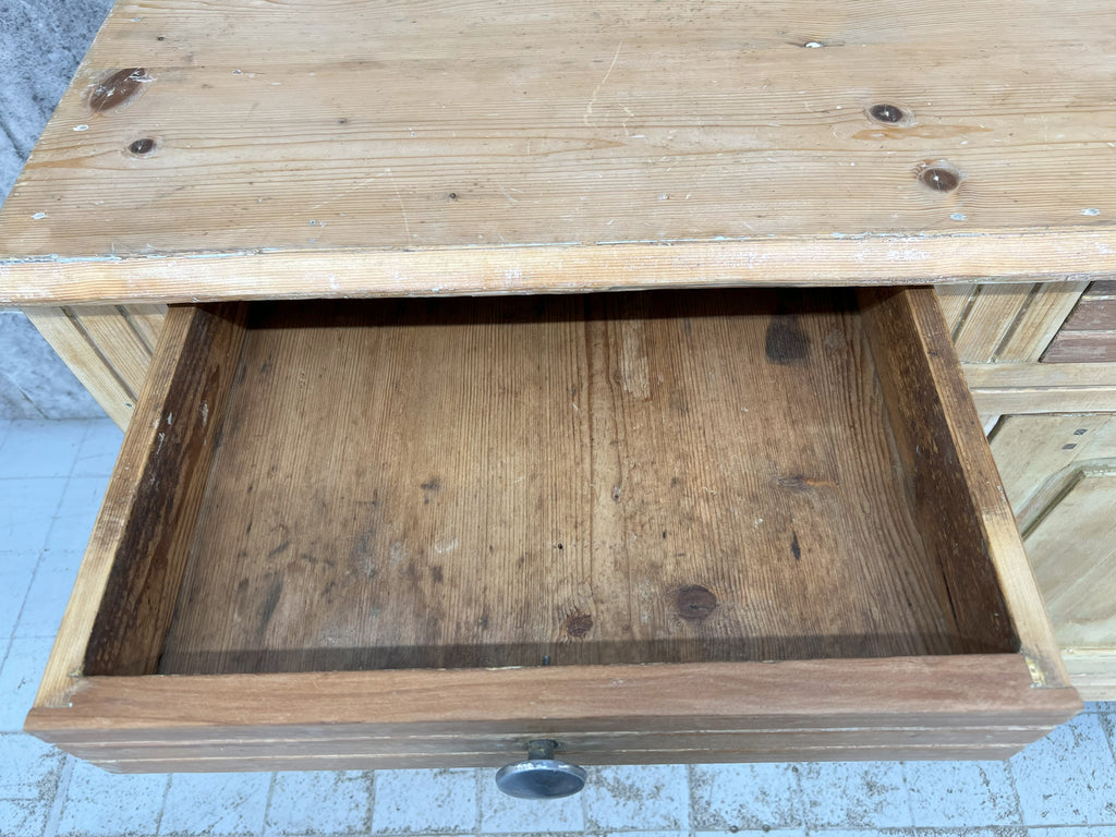 A counter that has been taken from a decommissioned grocers, this lovely piece is made from solid pine which has had layers of paint added over the years which have of late been removed.. either to be left natural or to be repainted to suit your scheme.  Beautifully symmetrical with its 3 drawers and 3 cupboard doors, each door opens onto the shelves with extend the whole width of the piece.  This piece packs a visual punch, but is not too deep so, whilst making a statement won't take up too much of your floor space, whilst offering huge amounts of storage.  The door furniture is original, the construction of this piece is beautiful and very much in keeping for its time.  Stunning in a hallway, sitting room, landing storage, kitchen unit, dining room sideboard or in a commercial property as a counter in a shop, storage in a workshop.. the list continues.. a versatile piece.