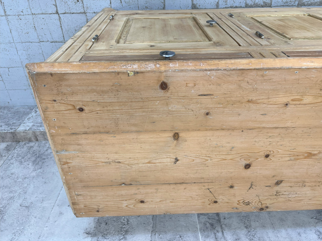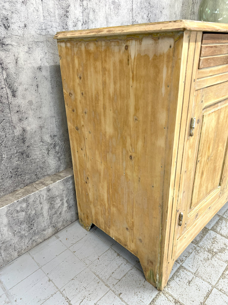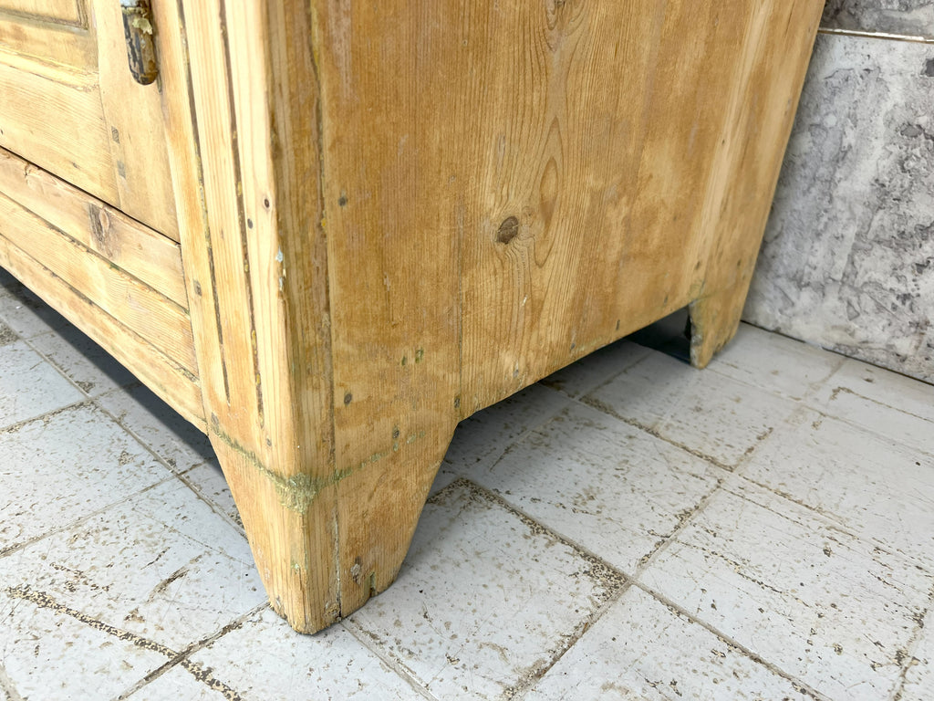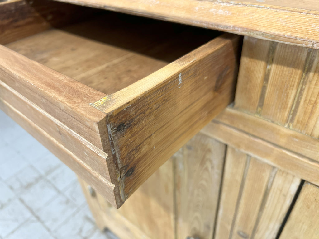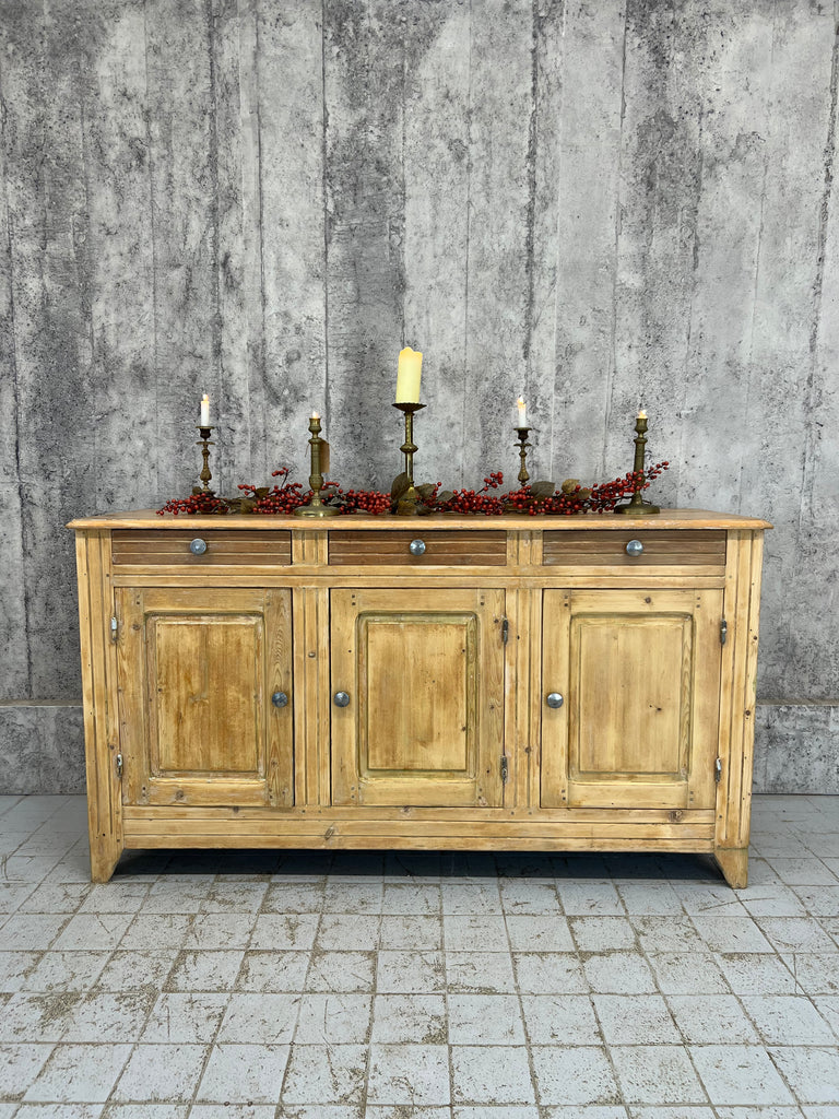 A counter that has been taken from a decommissioned grocers, this lovely piece is made from solid pine which has had layers of paint added over the years which have of late been removed.. either to be left natural or to be repainted to suit your scheme.  Beautifully symmetrical with its 3 drawers and 3 cupboard doors, each door opens onto the shelves with extend the whole width of the piece.  This piece packs a visual punch, but is not too deep so, whilst making a statement won't take up too much of your floor space, whilst offering huge amounts of storage.  The door furniture is original, the construction of this piece is beautiful and very much in keeping for its time.  Stunning in a hallway, sitting room, landing storage, kitchen unit, dining room sideboard or in a commercial property as a counter in a shop, storage in a workshop.. the list continues.. a versatile piece.