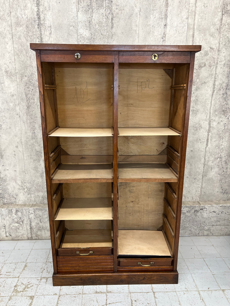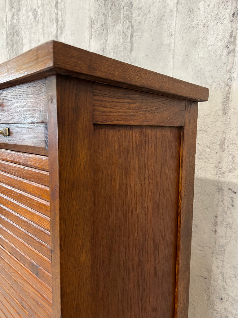 This stunning Tambour Filing Cabinet is in wonderful condition, having recently been renovated to the highest standard and has its original keys and handles. It is made from solid wood and the tambour runs well, but will ease up with more use. The internal shelves can be adjusted to suit your needs. A fabulous, unique and characterful storage solution for your home or office.
