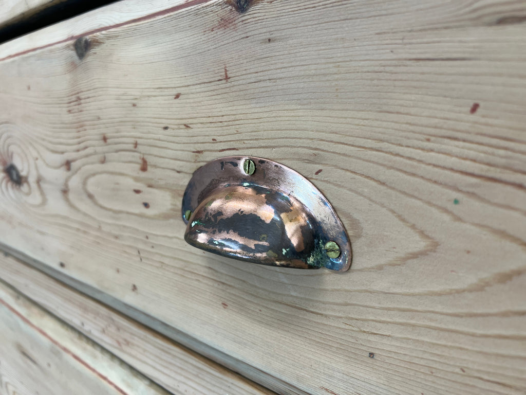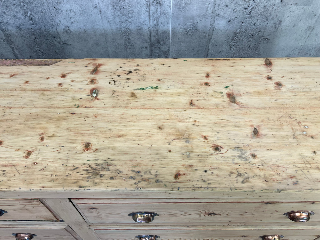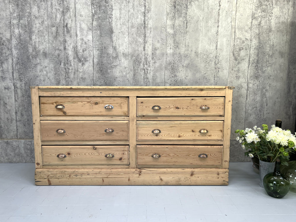 This fabulous looking sideboard with six wide drawers is a show stopper.. but wait.. it is not a high end sideboard, instead it is a rustic, simply constructed counter that was taken from a larger unit and amended to suit its new life. The original storage system was rustic, raw and this has been buffed up on the front and to the face, but you can still see signs of the different coloured paint on each side, you can see that the construction of the drawers are simple, you can see that there is not a back to this unit and you can see where the wood has been damaged on the sides where it has been removed from its original position.. BUT this is a fabulous piece.. the drawers are wide, the frontage of the unit and the top are this beautiful pine with evidence of old paint and beautiful original brass cupped handles. This is a fabulous piece and would be useful in every room in your home.