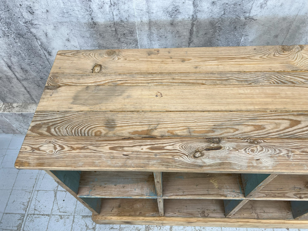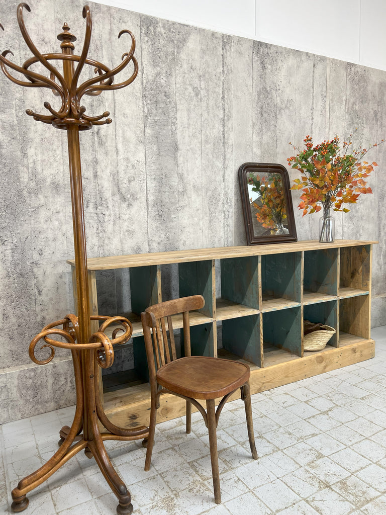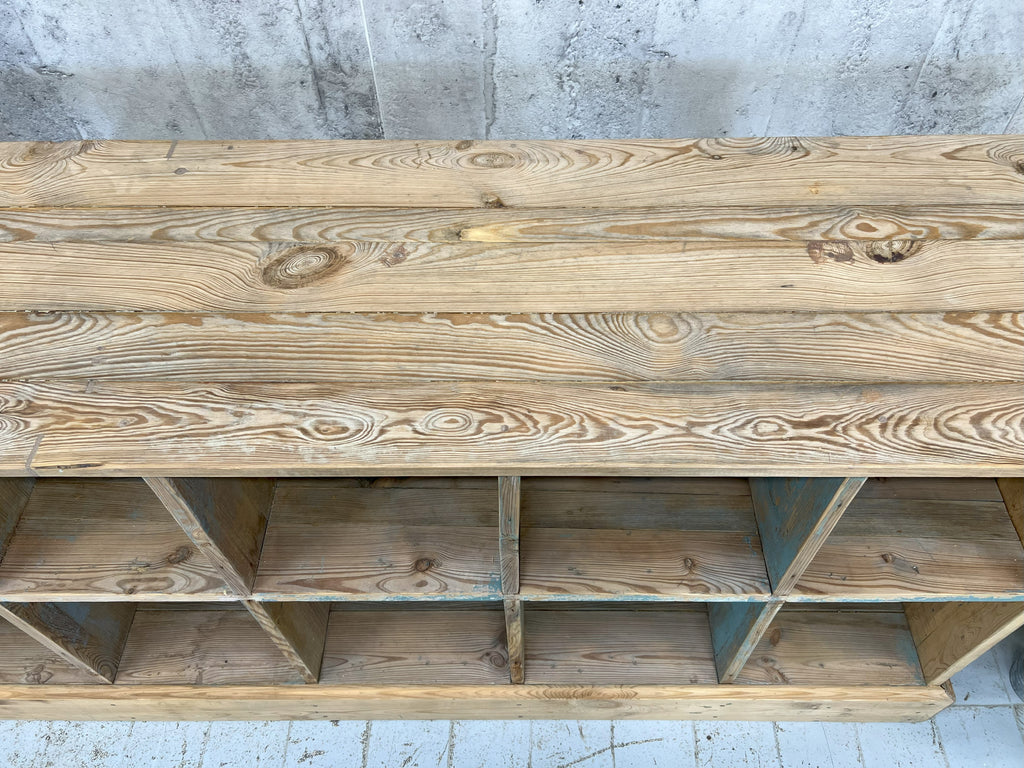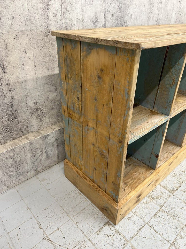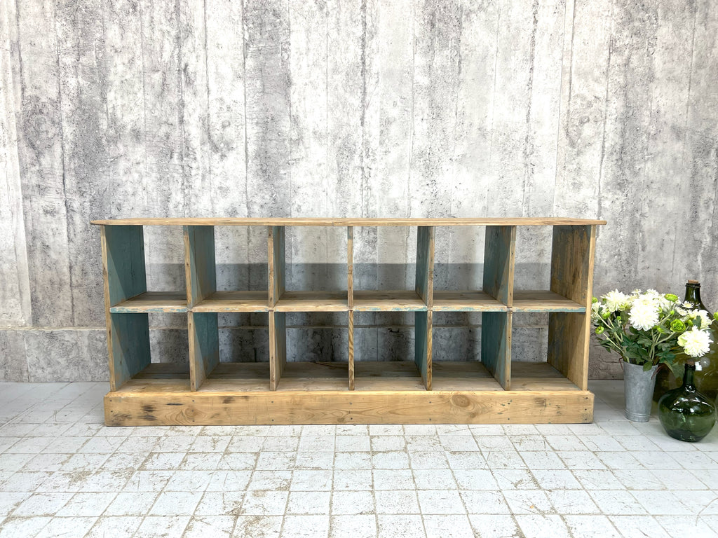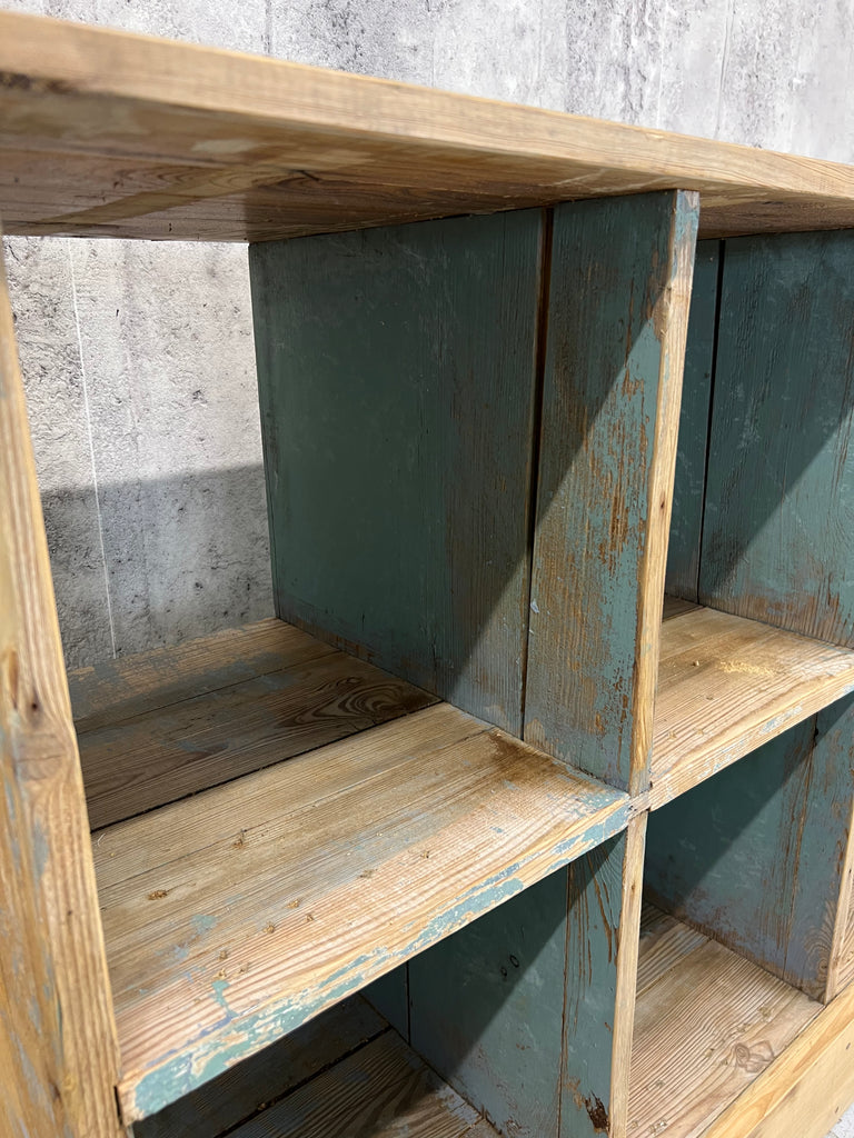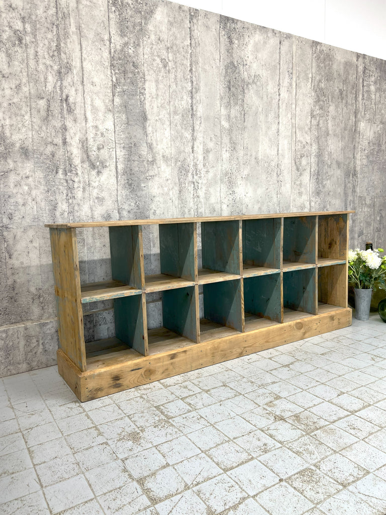 A rustic and simple pigeon hole unit, probably make for a workshop to store individual items in.  It is honestly crafted and is strong and sturdy enough to store lots of heavy items such as pots, crockery etc.