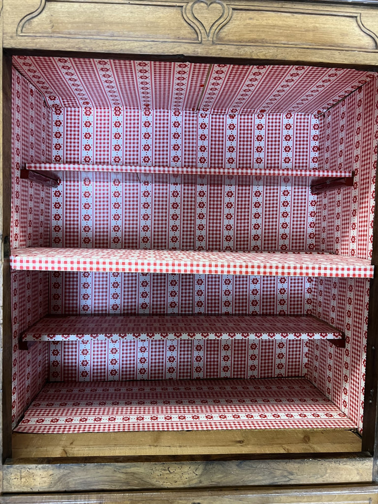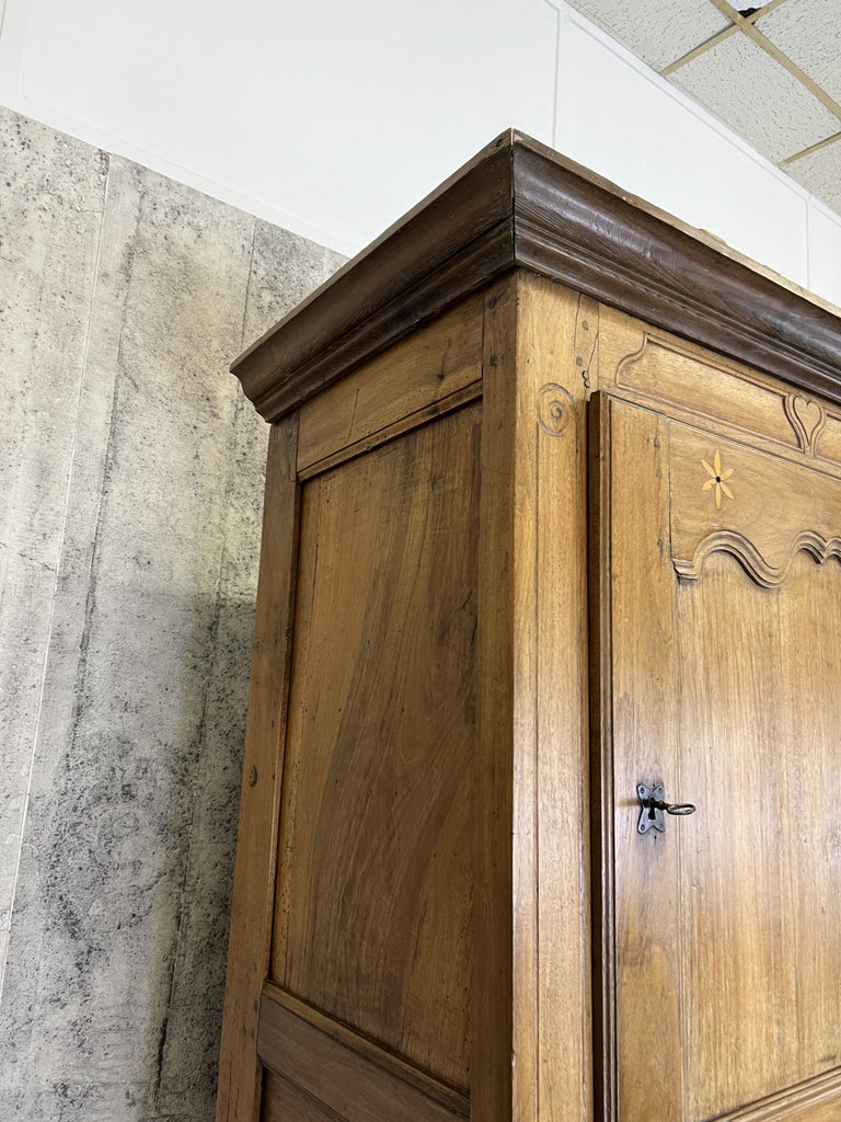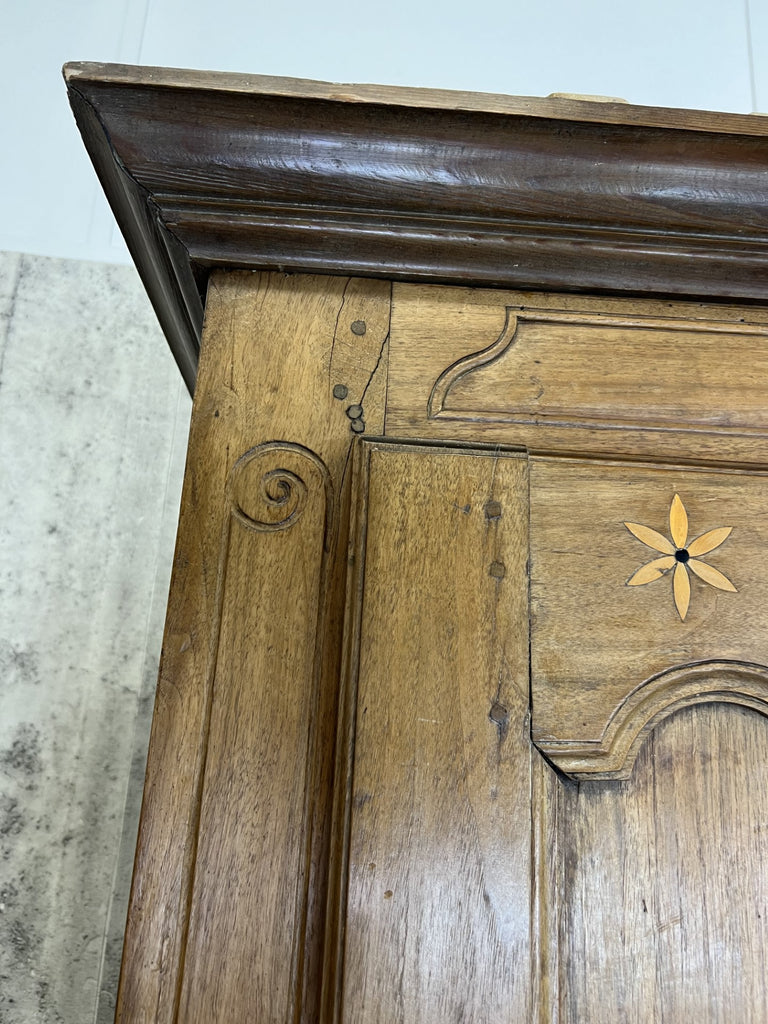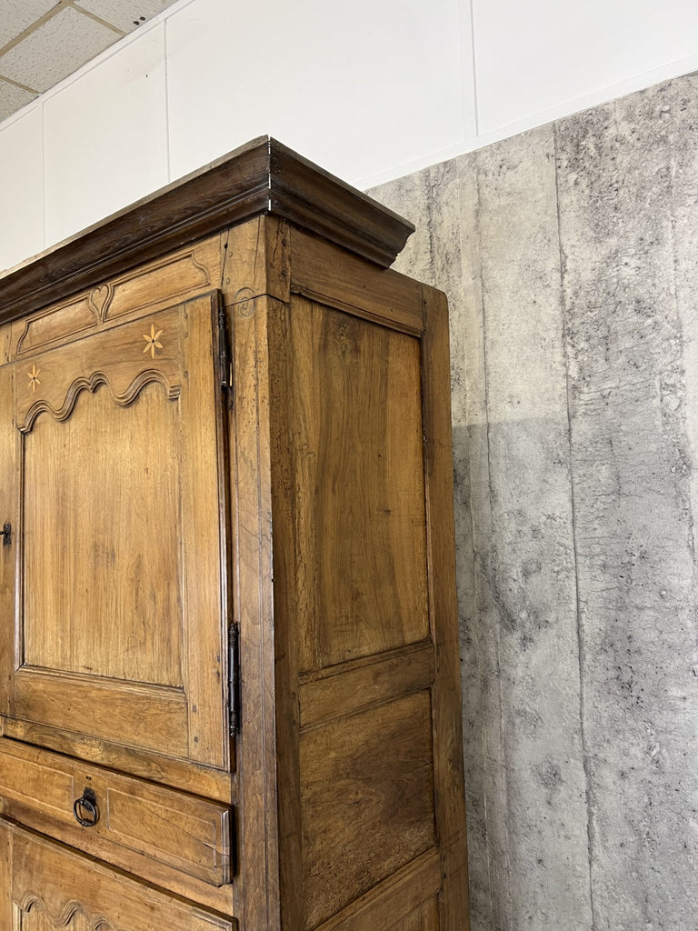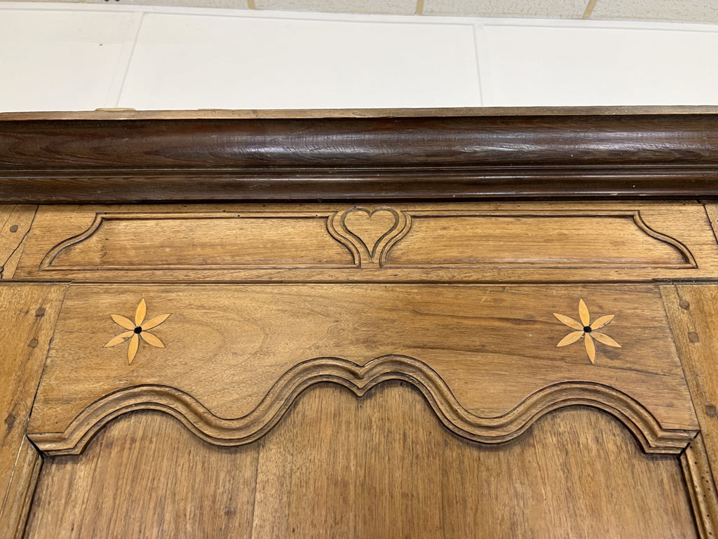 A solid and heavy French cupboard, with the most beautifully mellow solid wood with beautiful decorative carved and inlaid details. The doors open to shelves. Ancient wood worm, bashes and bruises as you would expect but in good working order. Sometimes referred to as a bontierre, sometimes a fruitiere, but what we can agree on is that this cupboard is endlessly useful for storage in many different areas of the home or work space. Ready to use as it is for a larder cupboard, hallways storage, bedroom storage or anything you like.... a really fabulous piece.