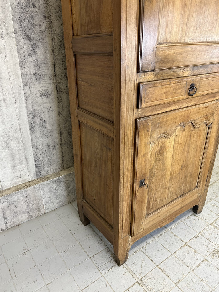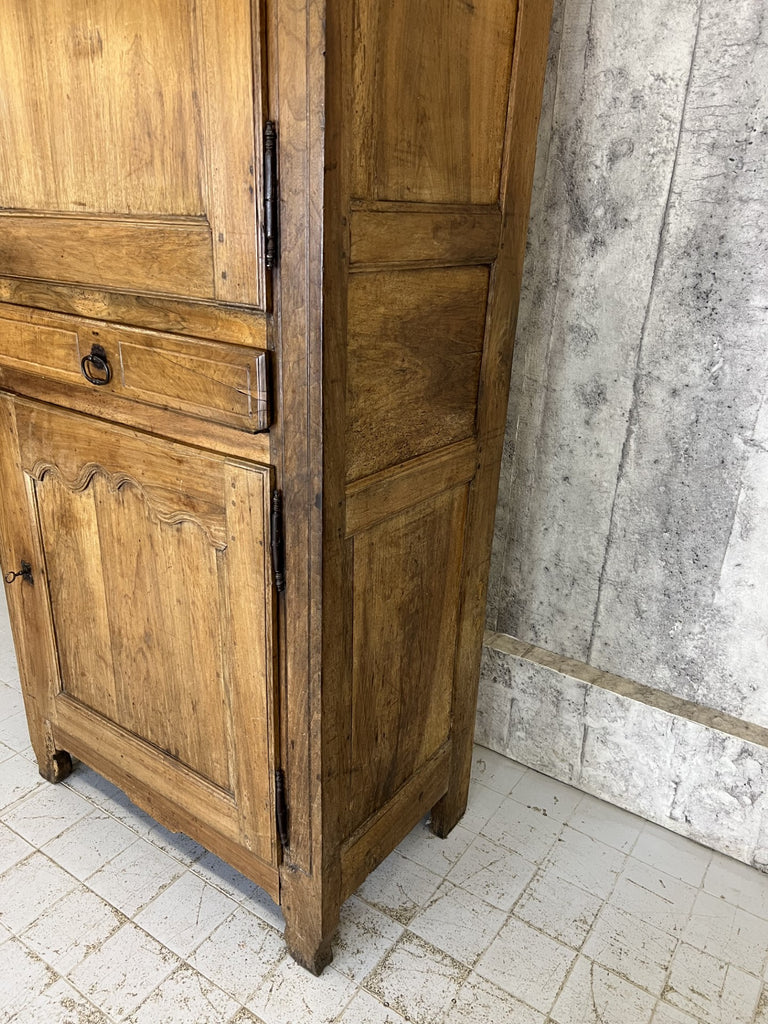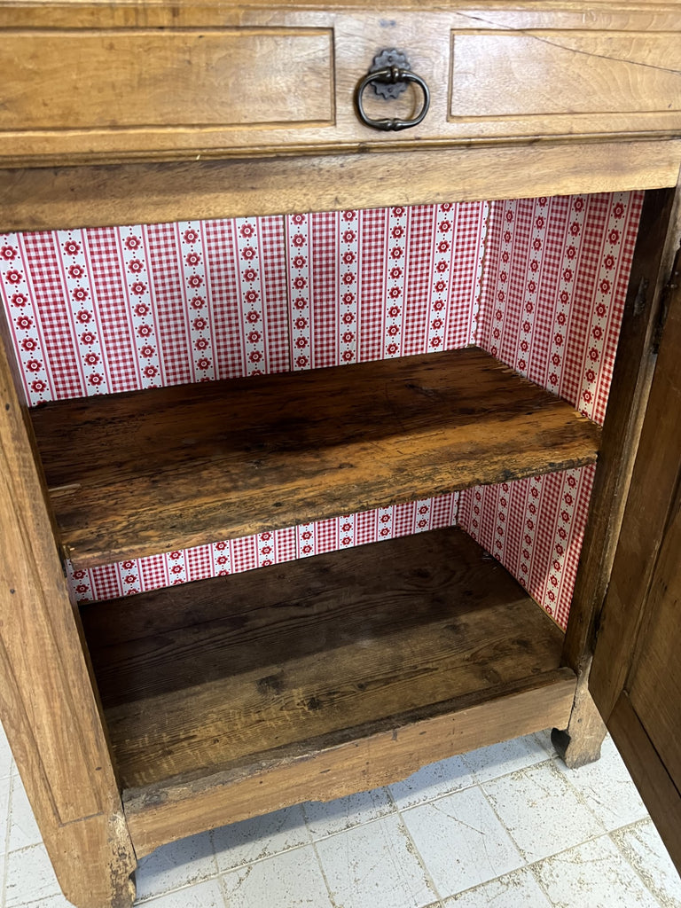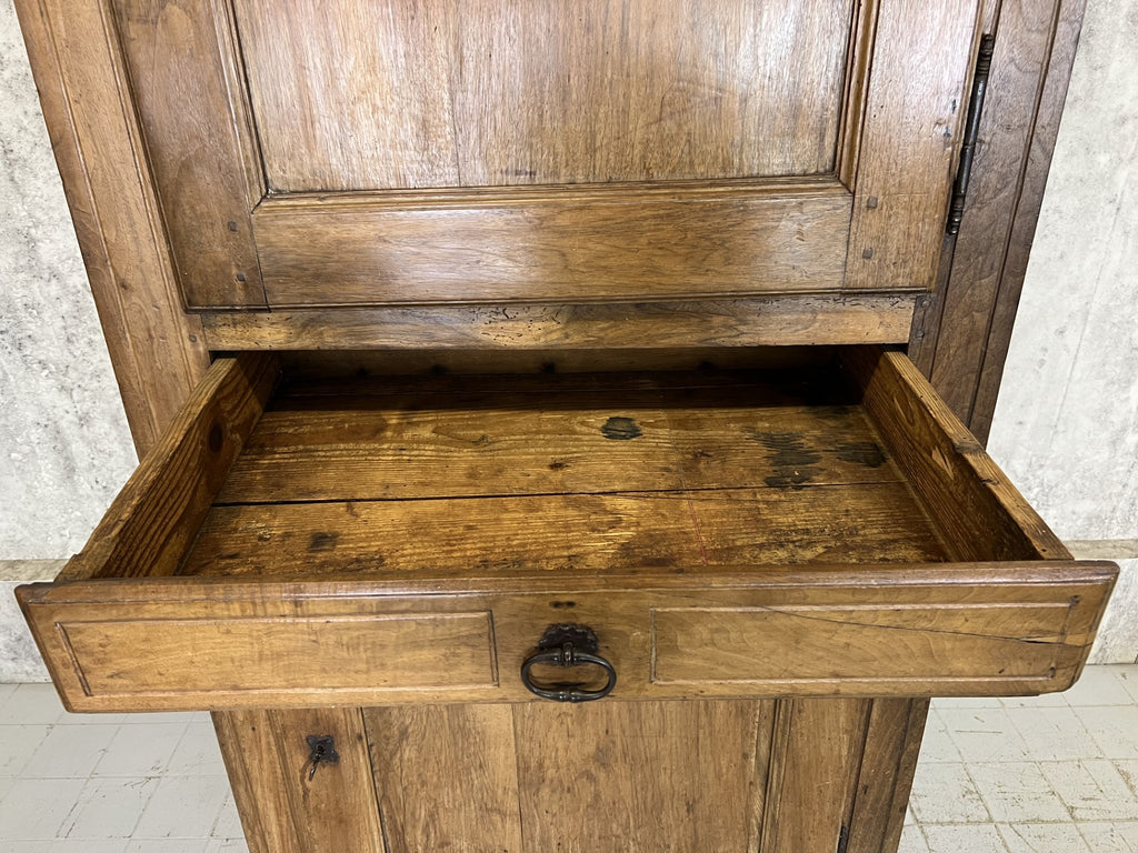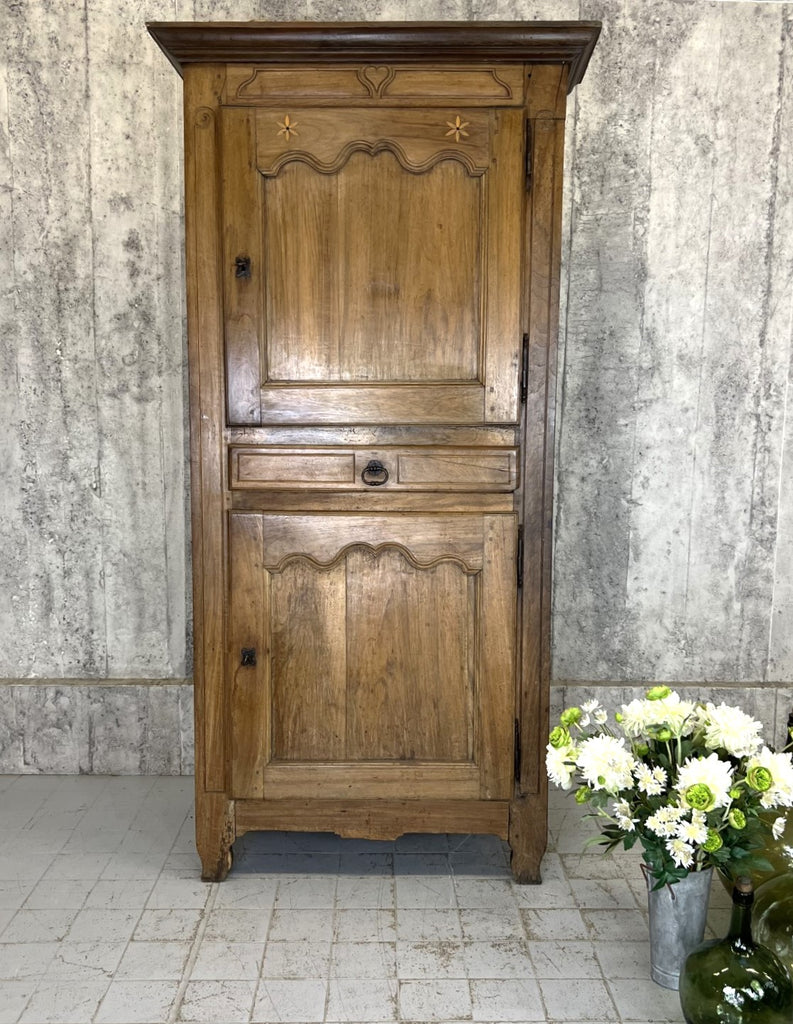 A solid and heavy French cupboard, with the most beautifully mellow solid wood with beautiful decorative carved and inlaid details. The doors open to shelves. Ancient wood worm, bashes and bruises as you would expect but in good working order. Sometimes referred to as a bontierre, sometimes a fruitiere, but what we can agree on is that this cupboard is endlessly useful for storage in many different areas of the home or work space. Ready to use as it is for a larder cupboard, hallways storage, bedroom storage or anything you like.... a really fabulous piece.