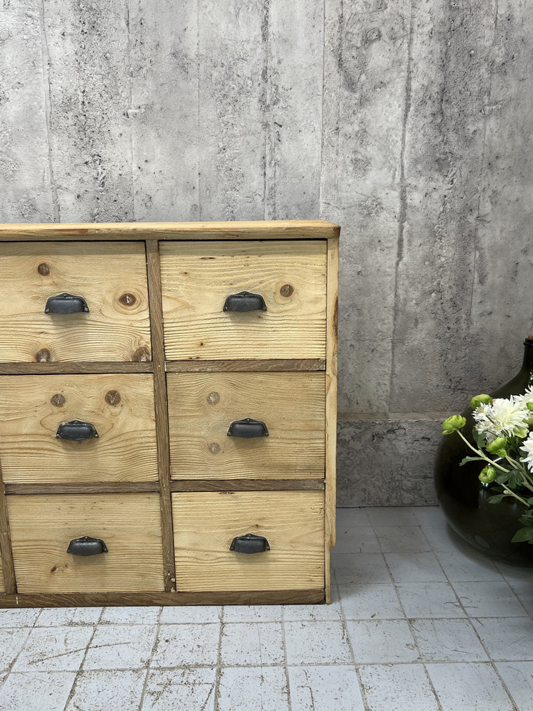 A fabulous set of drawers. Made originally for a pharmacy, for storing medications and products, this solid pine sideboard is a wonderful storage unit for really anything. The drawers are the correct size to store wine glasses and dining plates so is ideal for use as a freestanding kitchen unit. Also ideal to store candles and table linen in a dining space, clothes in a bedroom, shoes and hats in a hallway. I literally have a sideboard like this in every room in our home. With a small footprint they are ideal for adding a wow piece, ideal for massive storage and the ideal spot to create a focal point by dressing with your favorite artwork or object d'art or tv! The wood has been treated so that the grain is raised and textured. This softens with use, age and waxing. I love this detail about these drawers, is that these were always designed to be painted, so the carpenter made the piece from wood he had available, and you can see on this one, that the carcass and drawer fronts are the pitch pine and the internal structure from a darker, daker wood. I love to see these characteristics exposed. A fabulous set of drawers, rustic to touch and hugely practical and always a statement.