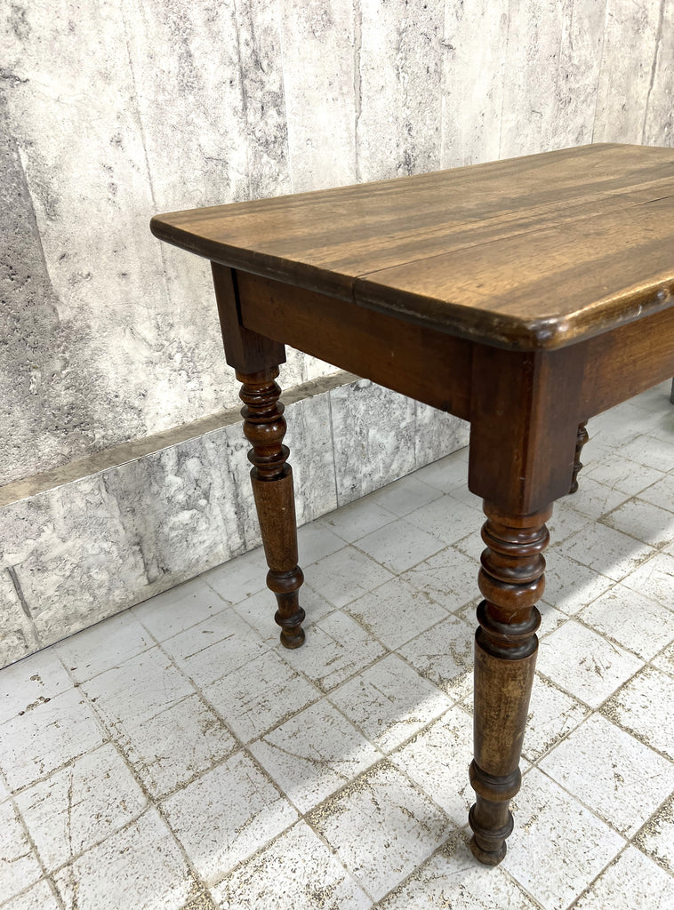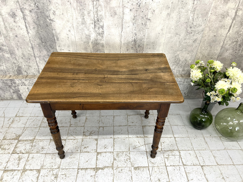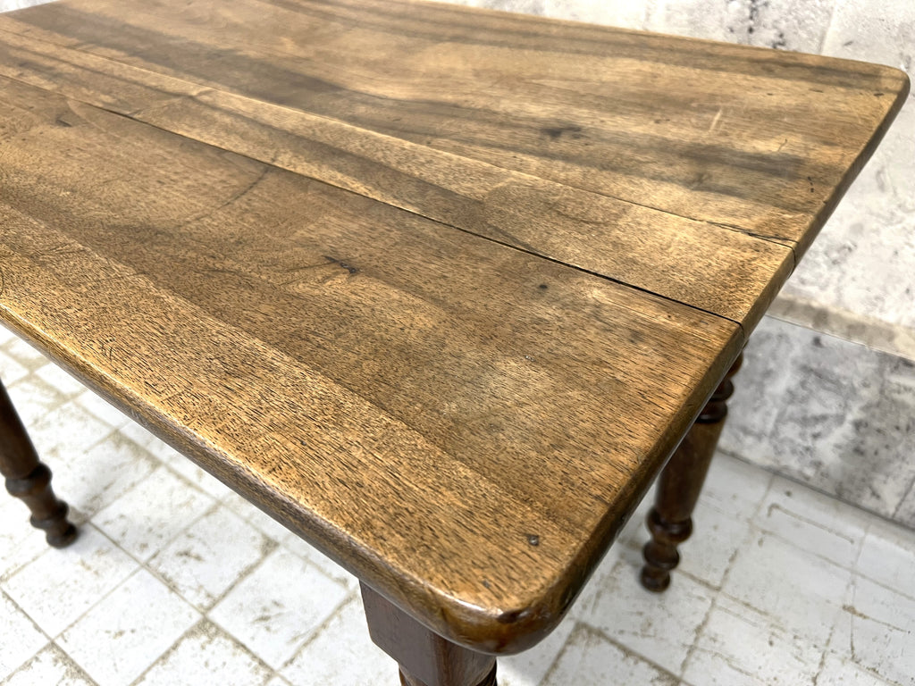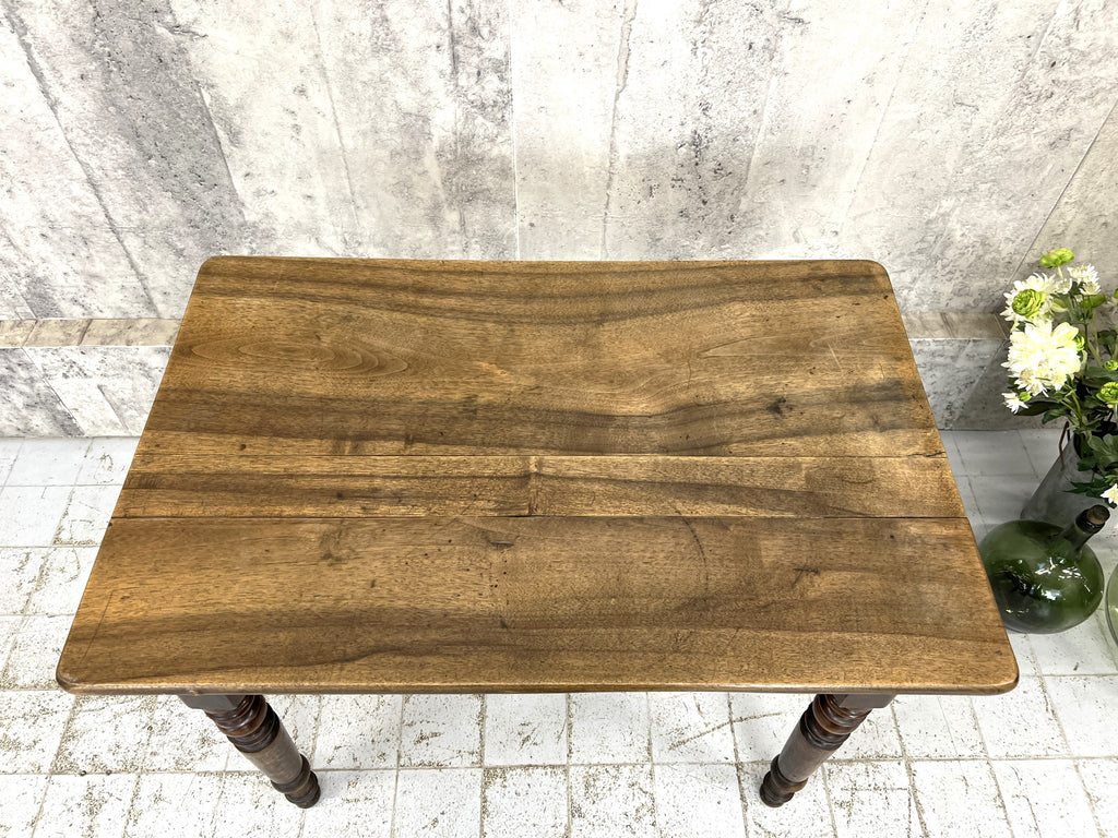 A classic and traditional French Bistro table fashioned from this very beautiful walnut wood with beautiful rounded edges to the table top and turned legs. In excellent ready to use condition for a bistro, bar or restaurant, for a work space or your home. The wood is in excellent condition, with marks and scrapes as you would expect commensurate with age and use. The legs and base has the original varnish and the table top is this beautiful bleached effect, having been wiped over with a damp cloth for decades. Ready to use as it is. Will seat 2 comfortably for a meal and 4 at a squeeze.
