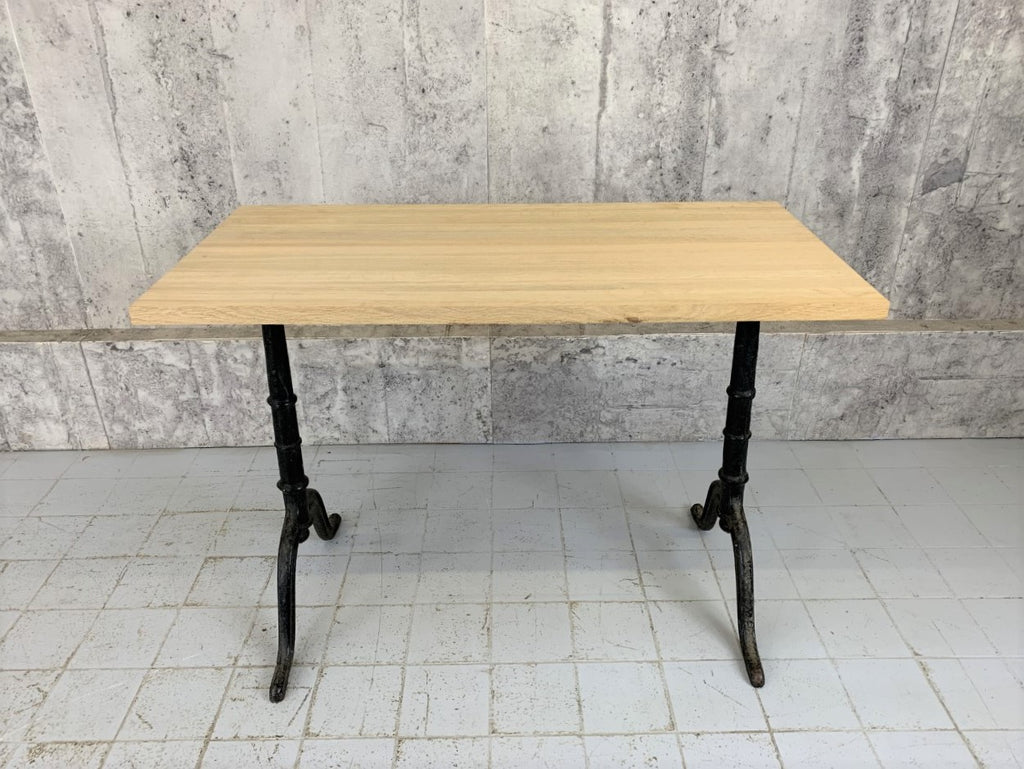 A very pretty traditional French Bistro table or desk with stunning (and very heavy cast iron legs). The table top has been preplaced by this fabulous solid oak top. The overall condition is as good as new. This table is ready to be used as it is. Marry with a metal, modern or upholstered chair as a kitchen table, desk or console table.